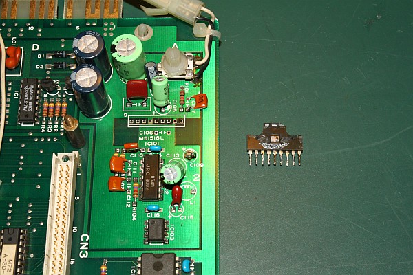 {Reparatur} Ein neuer Verstärkerbaustein, Kühlkörper, Langschrauben, Abstandshülsen, Platinenfüße und Kunststoff-Beilagscheiben machen die Schäden weitgehend ungeschehen. Der Amp wird mit dr Heißluftfön-Technik ausgelötet.