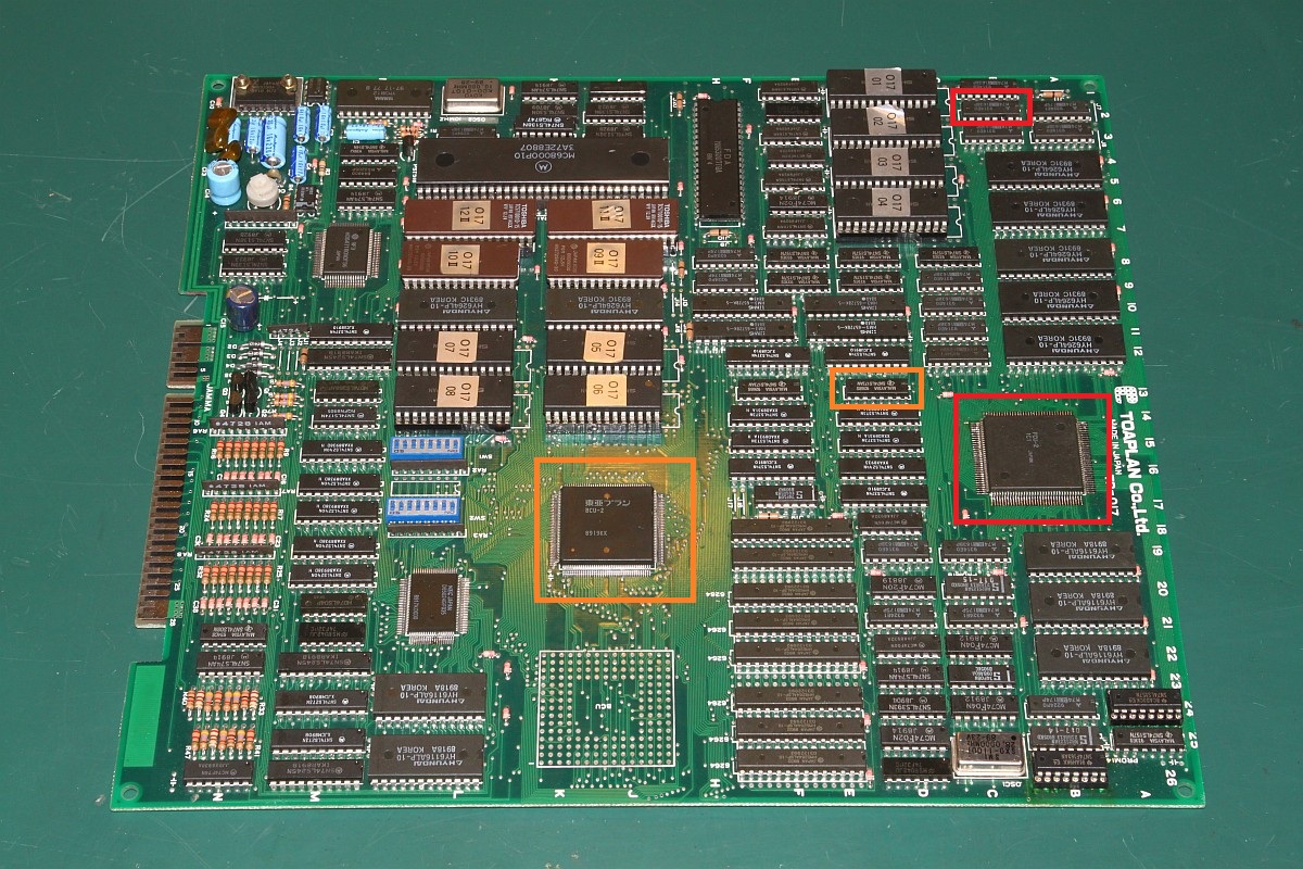 {Fehlerbeschreibung} Grafikfehler auf einer Fire Shark Platine: die Sprites sind nur zu 50% vorhanden, jede zweite Zeile fehlt. Besonders deutlich im Detail zu sehen: es sind nur die Sprites betroffen, Tiles (Text und Hintergrund) sind in Ordnung. {Analyse} An der Platine ist vom Vorbesitzer schon viel rumgebastelt worden, allerdings sehr professionell. Drei TTLs wurden getauscht, die Custom Chips sauber nachgelötet. Auf vielen Bausteinen finden sich Lotreste, da hat wohl wer schon Messtrippen angelötet... Ein erster Verdacht auf eine Lötbrücke erwies sich als unbegründet: hier ist tatsächlich eine Leiterbahn zwischen den Kontakten. {Analyse Teil 2} Also bleibt nur noch das Oszi, um Probleme bei den Signalen festzustellen. In der folgenden Übersicht habe ich mal die für die Spriteerzeugung wichtigen Bereiche markiert. Hellblau sind die Sprite-ROMs, hier sind die Grafikdaten abgelegt. Die Sprites werden alternierend Zeile für Zeile in zwei schnelle RAMs geschrieben. Rosa ist für die ungeraden Zeilen zuständig, hellviolett für die geraden Zeilen. Der rosa Bereich funktioniert nicht richtig, daher fehlt jede zweite Zeile. Gelb markiert sind die Reparaturen vom Vorbesitzer. Der rote Kasten bei den GFX-ROMs ist ein voreinstellbarer Zähler, der die Spritedaten auszählt, eine der Adressleitungen (A7) ist unsauber und könnte auch schon Probleme machen (siehe Bilder). Der zweite rote Kasten in der Sprite-Daten-Pipeline markiert einen 8fach FlipFlop, der die Sprite-Daten Byteweise zwischenspeichert... da sind die Datenpegel korrupt. Schön, dss man hier zwei identische Systeme zum Vergleich hat. Das erleichtert die Fehlersuche, auch wenn es keinen Schaltplan gibt. {Analyse Teil 3} Nun ist es soweit: der Fehler will nicht von mir gefunden werden! Nachdem ich probeweise die Sprite-EPROMs entfernt habe, waren die Sprites auf dem Bildschirm nicht wie erwartet solide Farbblöcke sondern ebenfalls gestreifte Farbblöcke. Also liegt der Fehler nicht im Auslesen der Sprite-Daten, sondern in der Weiterverarbeitung. Ein Austausch des defekten 74ALS163 (4 Bit Zähler zur Sprite-Datenadressierung, kleiner roter Kasten) hat zwar das Signal verbessert, aber sonst keinen Effekt gezeigt. Ein Austausch des Vierfach-Latches 74LS173 (kleiner oranger Kasten) zeigte ebenfalls keine Wirkung. Am Sprite Generator Custom (FCU-2, großer roter Kasten) war ein Datenpin nicht richtig verlötet, das hat man über das Oszi erkennen können. Die Reparatur machte die Farben schöner, aber die Streifen blieben. Ein Triggern auf den 15kHz Zeilenwechsel sollte eigentlich zeigen, welche Daten in jedem zweiten Zyklus fehlen, hat es aber nicht. Alle Daten wirken einwandfrei, bis sie im Tilegenerator-Custom BCU-3 (großer oranger Kasten) verschwinden. Nun weiß auch ich nicht mehr weiter. Nach geschätzten 6-7 Stunden Gesamtarbeitszeit erkläre ich den Patienten für nicht heilbar. :-( |