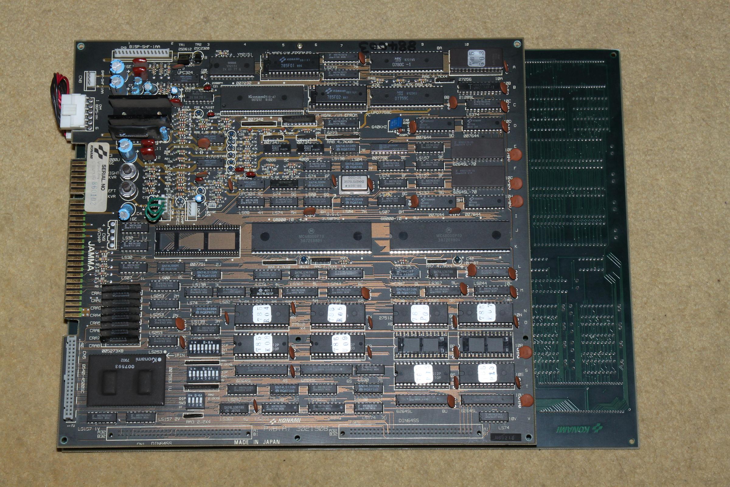 {Diagnose und Genesung} Vier Anläufe zur Fehlersuche waren nötig, frustriend, da Custom-Hell, kein Schaltplan und fürchterlich viele ICs... Und wieder einmal halfen Oszi (Signalintegrität), Durchgangsprüfer (Signalverfolgung) und Heissluftfön (IC-Auslöten). Auf der unteren Platine werden die Video-Signale generiert. Auf J23 ist ein 74LS157 (Multiplexer), der letztendlich die Framebuffer bedient. Dessen Eingänge Pin 3 und Pin 6 waren auf schwebendem Potential. Der Durchgangspieper verriet, dass die Signale vom daneben liegenden 74LS32 (Oder-Gatter) kamen. Dieser war offensichtlich defekt. Da wurde doch ein komplettes Bild Framebuffer bei den Sprites nicht geschrieben... Vier Mal die PCB in den Händen gehabt - drei Mal Frust, einmal Lust. Manchmal darf man halt einfach nicht aufgeben.