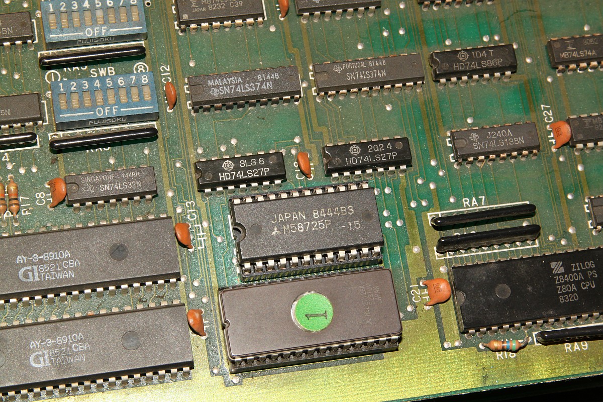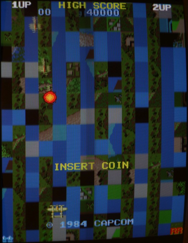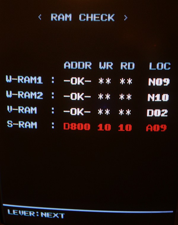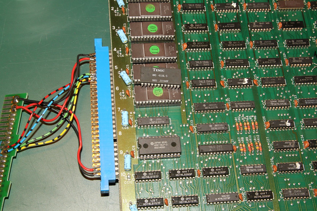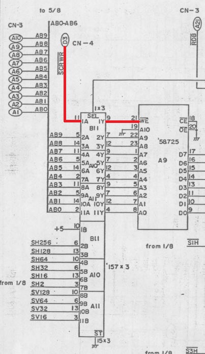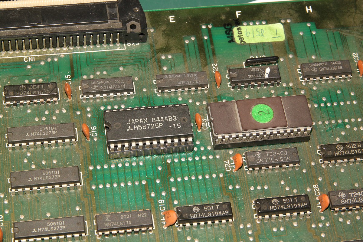 {Fehlerbeschreibung} Eine originale Capcom 1942 - Fehlerbeschreibung des Kunden: starke Grafikfehler im Hintergrund... {Diagnose 1} Upps, ja, die Fehler sind in der Tat stark. Seltsame Streifen, einfarbiger Hintergrund... Interessantes Detail: die Streifen scrollen ordnungsgemäß mit und verändern sich nicht. Es gibt aber auch keine anderen Hintergrunddetails... {Diagnose 1} Eine nähere Inspektion der Platine bringt einiges ans Licht, es wurde bereits umfangreich repariert: alle RAMs haben schon mal einen Tausch hinter sich. Ganz passabel gemachte Arbeit... {Fehlersuche} Die Hintergrundtiles... da ist der einsame 6116 neben den sechs GFX-ROMs für zuständig... einfach mal tauschen... Da ändert sich das bild doch gleich deutlich: jetzt sind die Streifen weg und es hagelt Zufallsklötzchen... Minecraft Style... Der Hintergrund bleibt trotzdem statisch. Also vermute ich, es wird nicht ins Tile-RAM geschrieben. Das Oszi meldet: kein Write-Impuls am RAM. Der Schaltplan führt mich über ein Flip-Flop (alles High) zu einem 74LS86-Gatte, dessen Ausgang irgendwas um 1,5V liefert... Das kann ja nicht gehen... {Reparatur 1} Huckepacktest und Logikaustausch, dann klappt's auch mit der WR#: {Reparatur 2} Eben wollte ich die 1942 versenden, hab noch mal den Jamma-Adapter vollbestückt, so mit Ton und allen Tasten und so... Kein Ton beim Einschalten. Mist. Ein wenig gespielt, plötzlich kommt Ton. Fazit: keine Schußgeräusche, die Hälfte vom Ton fehlt. Gut, dass es den umfangreichen Selbsttest gibt... die ersten 16 Töne gehen nicht. Das Ende vom Lied: {Fazit} Vom Sound-RAM-Fehler im Selbsttest sollte man sich nicht irritieren lassen, der kommt fast immer, es funktioniert aber trotzdem alles. Und nach Austausch des Soundgenerators knallt es auch wieder, wenn man wen trifft. |