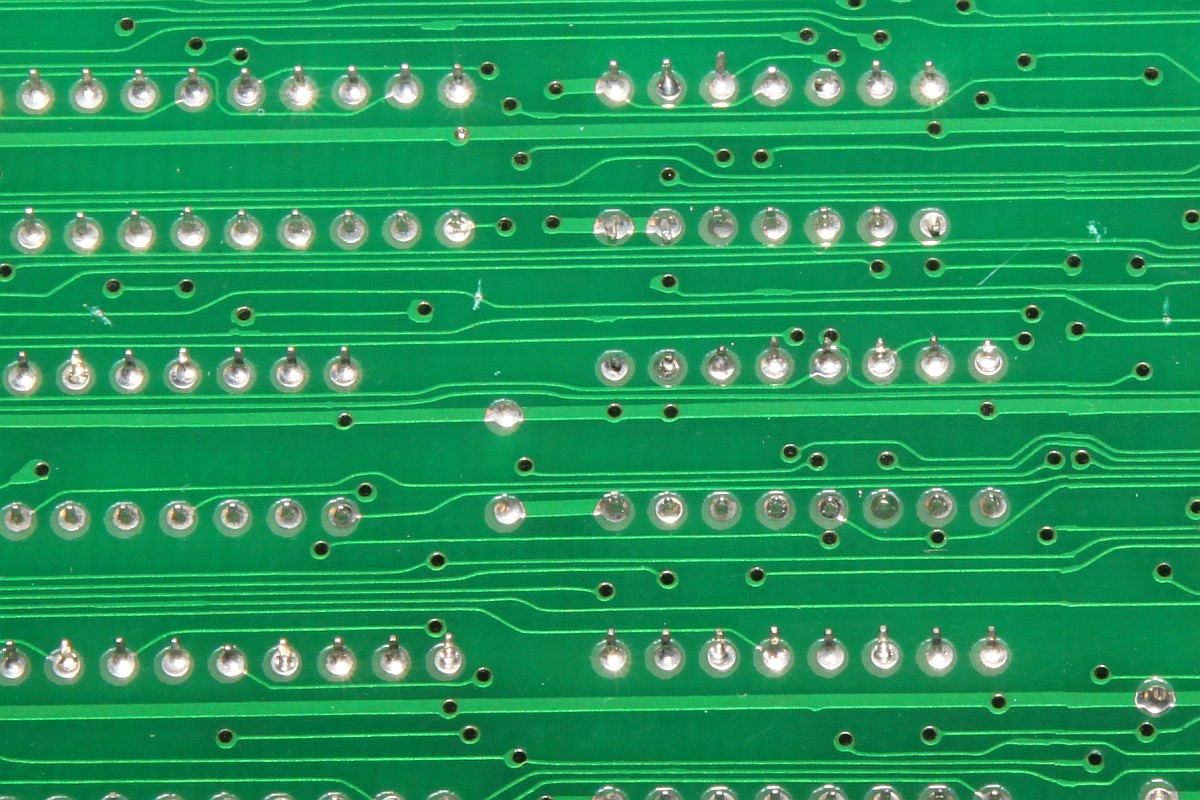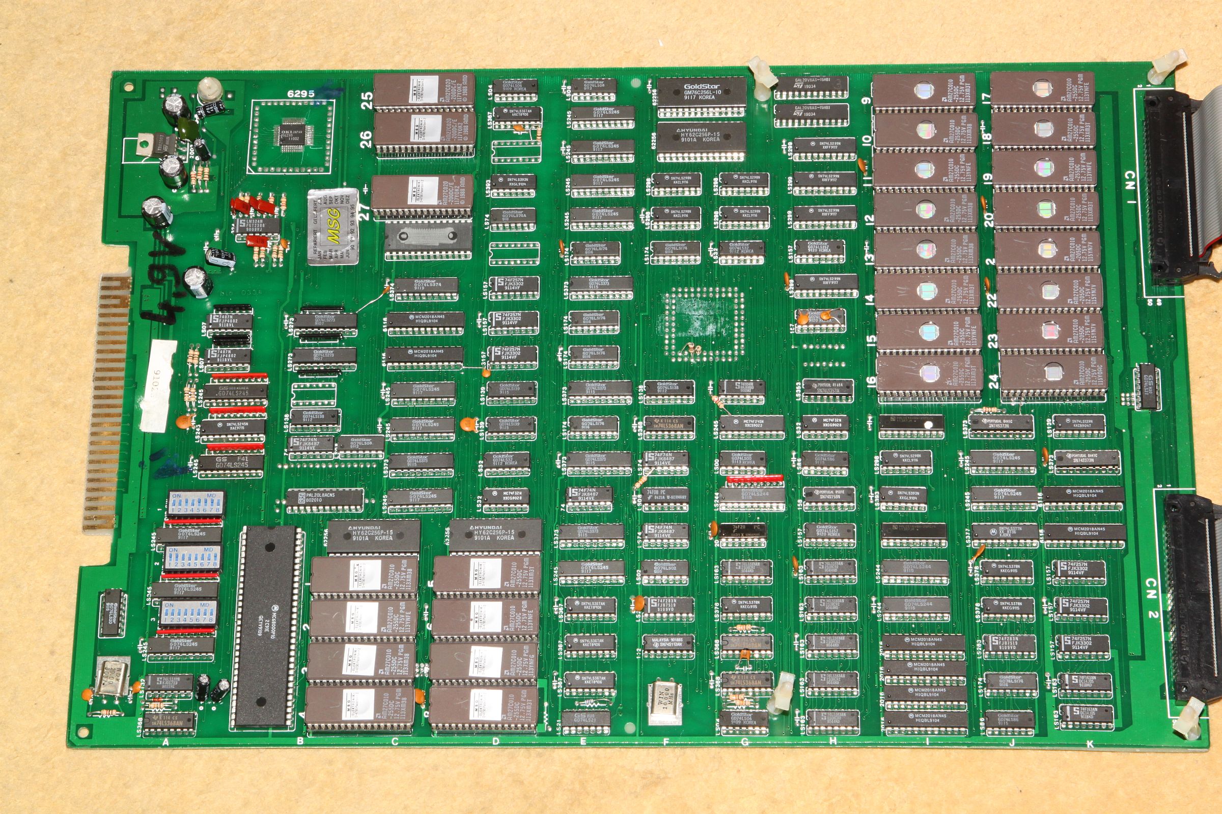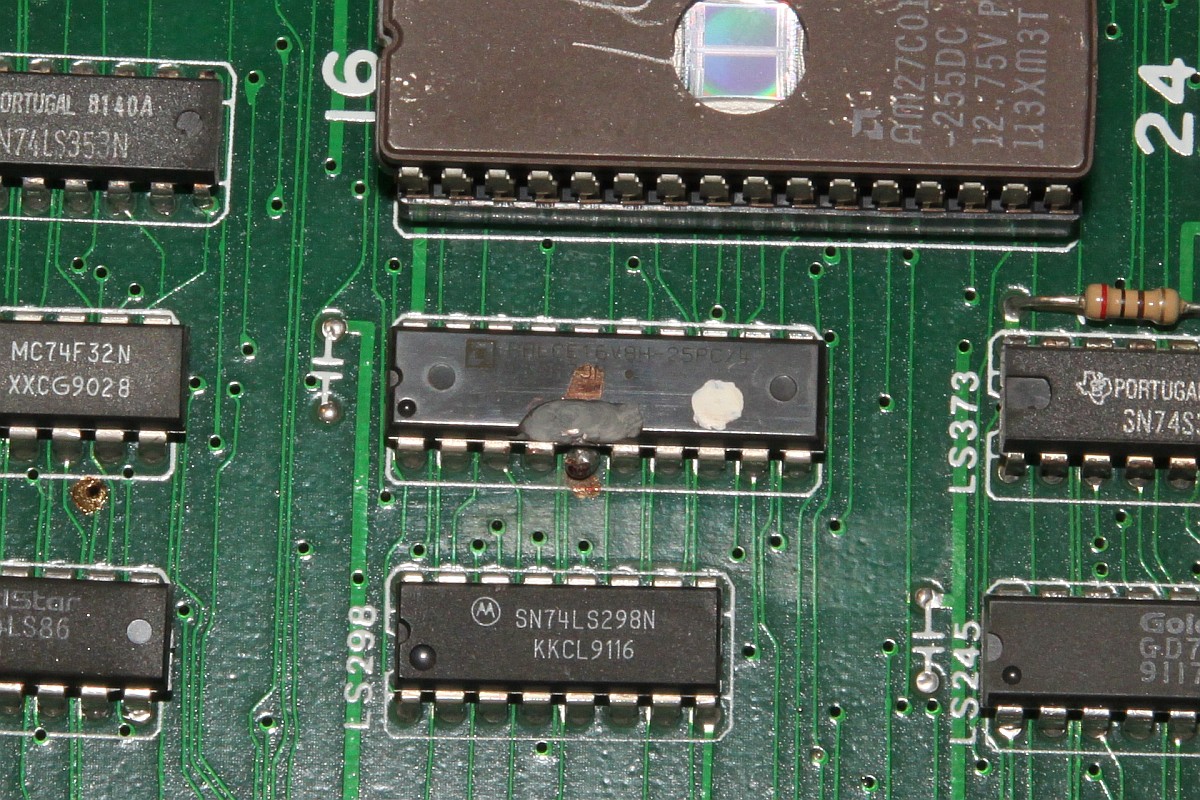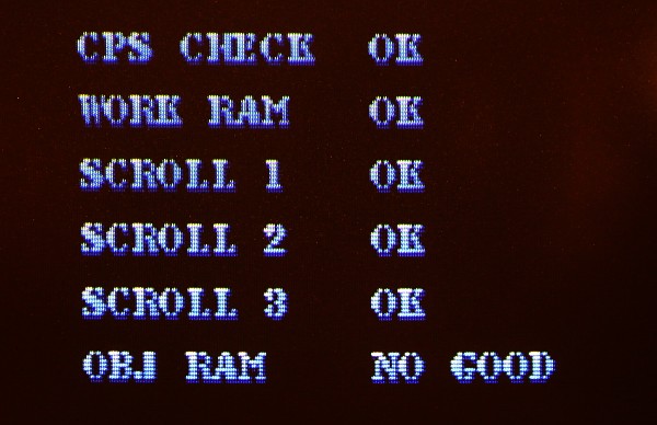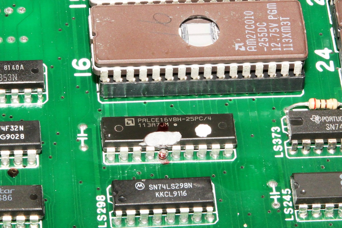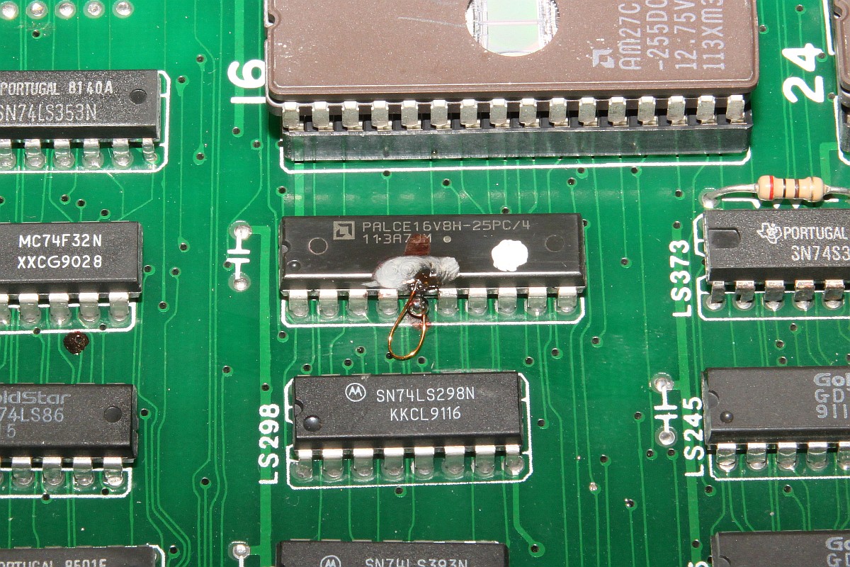 {Fehlerbeschreibung} Es werden keine Sprites dargestellt. Gar keine... Hintergründe, Text und Gameplay sind einwandfrei. Ach ja, der Ton geht auch nicht... {Diagnose} Der Screenshot lässt es ja schon erahnen: die Object RAMs werden irgendwie nicht richtig erkannt... RAM oder Logik, das ist hier die Frage... {Reparatur 1} Das Signal ist danach trotzdem noch halb-Low-High... Fuck, der PAL war's garnicht... Ich verfolge die Leiterbahn in die andere Richtung. Der Durgangspieper hilft... Die Leitfähigkeit verliert sich mitten in der Leiterbahn, auf dem Foto ist nicht die geringste Unterbrechung zu sehen... Sowas hatte ich auch noch nie... Also gebrückt, aber was tun mit dem PAL? Dremel ist Dein Freund - und eine ruhige Hand... {Erfolg...} Nur der Ton geht immer noch nicht... |