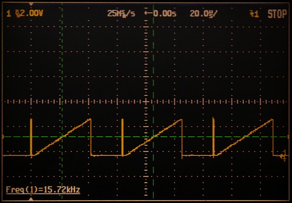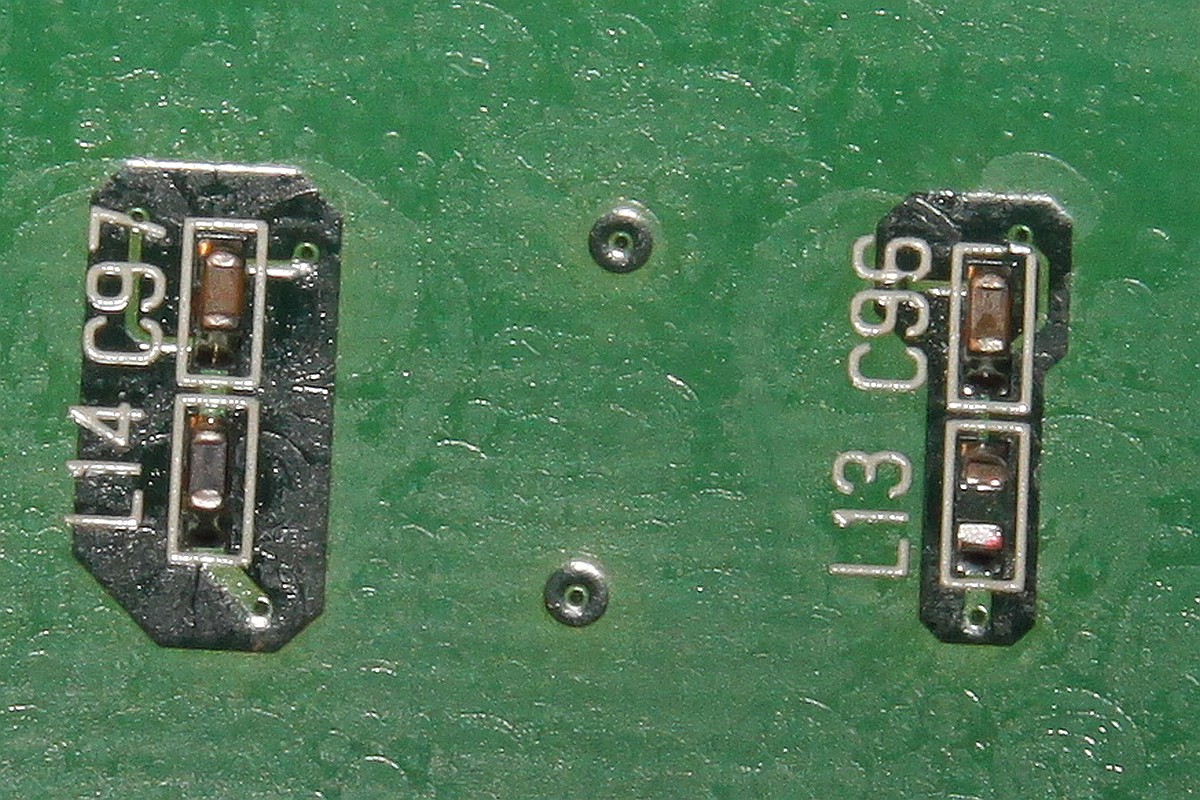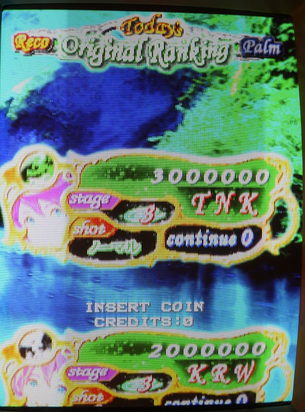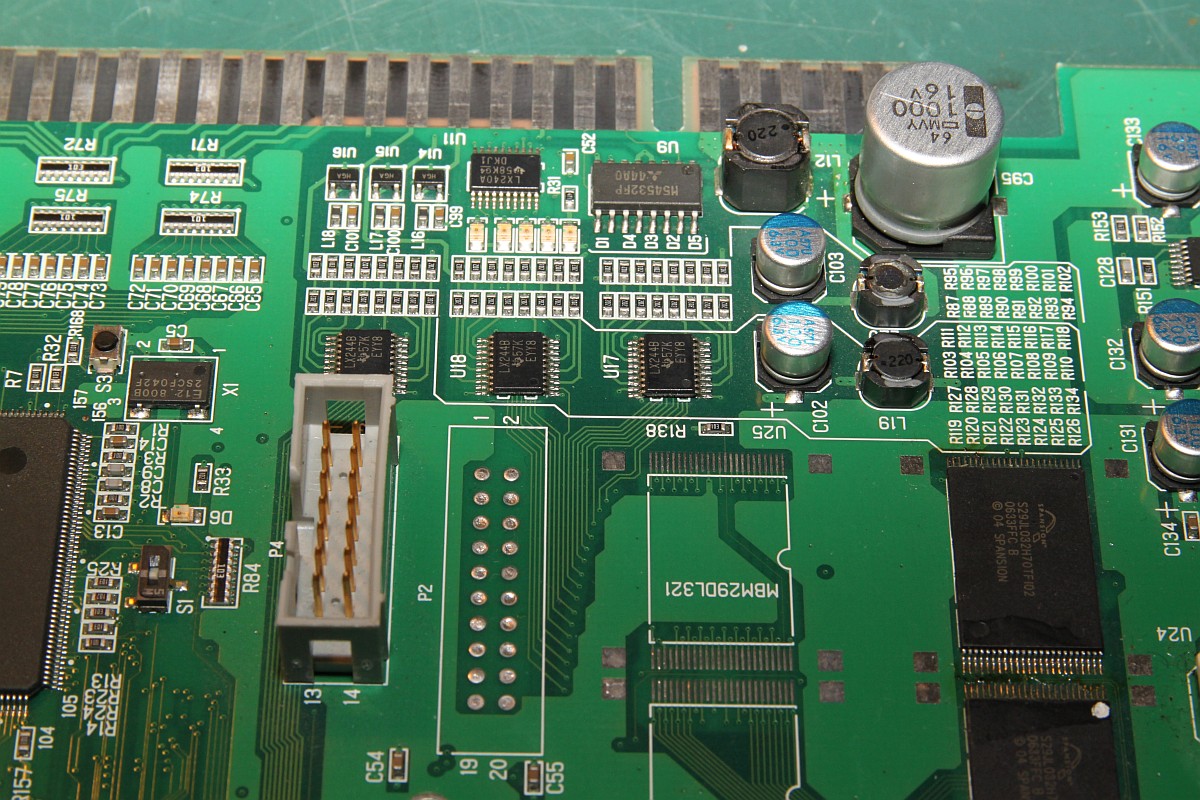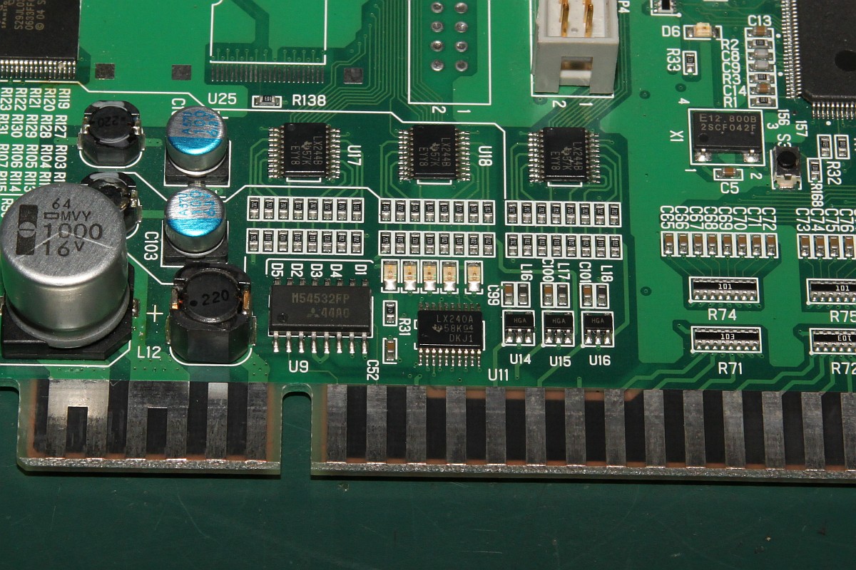{Fehlerbeschreibung} "Mushihime Sama Futari" - was für ein Name... was für ein Spiel... das ist nicht meine Zeit, aber ich reparier's trotzdem. Symptom: sauteuer, trotzdem fehlt Rot. Das sieht man gut im Testmodus (Sub-Miniatur-Druckknöpfchen 5 Sekunden gedrückt lassen...): {Screenshots} Ganz offensichtlich fehlt der Rot-Anteil: {Fehlersuche} Im Netz findet man eine tolle Anleitung für die Reparatur der sehr diskreten Video-Endstufe... Offenbar geht der OP-AMp am Ende gerne mal kaputt... also messen, ob was rein geht und ob was raus kommt... Das Oszillogramm der einzelnen Farbkanäle ergibt beim Testbild eine wunderbare Rampenfunktion - bis auf Rot... Ergebnis: bei U14 (rot) kommt nix raus... es geht aber auch nix rein... Mist. Mal den 8-Bit Buffer 74LV244 testen... kommt auch nix raus, geht aber was rein... Output-Enable ist auf low, gut so. Versorgungsspannung ist auch auf Low... Nicht gut! Mal auf die Unterseite sehen: {Reparatur} Kann ja nicht gehen, die Mini-Ferritspule, die in der 3,3V-Versorgung liegt, ist abgerissen... Spule hab ich nicht aber 0 Ohm gehen auch, kann schlimmstenfalls HF-Bildstörungen geben... Ist ja nur bei rot...: {Screenshots} Schon klappt's mit allen Farben: |