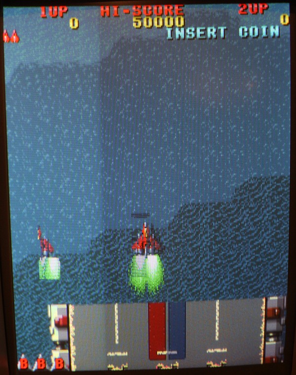 {Fehlerbeschreibung} Neuer Patient: eine Raiden Bootleg, eigntlich gut gebaut, nur Marken-TTLs, ein Sack voll PALs und zwei CXQ70116 Prozessoren (NEC V30 Kompatible). Symptome: Grafikfehler verschiedener Art und unregelmäßige Resets, der Start sieht noch ganz gut aus... Hier ist schon mal der Text verhackstückelt: Und die Sprites sind auch nicht so ganz an der richtigen Stelle... Ein interessantes Detail: je nach Kälte- oder Wärmebehandlung verschlechtert oder verbessert sich das Verhalten, aber nicht nachvollziehbar. Ich konnte zwischenzeitlich sogar mal ein paar Minuten spielen, dann wurde es wieder schlechter. Im Unterschied zu vielen anderen PCBs stürzt diese hier bei Grafikfehlern ab und resettet, eine Fehlersuche ist damit auch etwas schwer... Hat die schon mal wer in den Fingern gehabt? Ich würde als nächsten Schritt mal die Video-RAMs tauschen, die Programm-ROMs sind getestet und gut... |