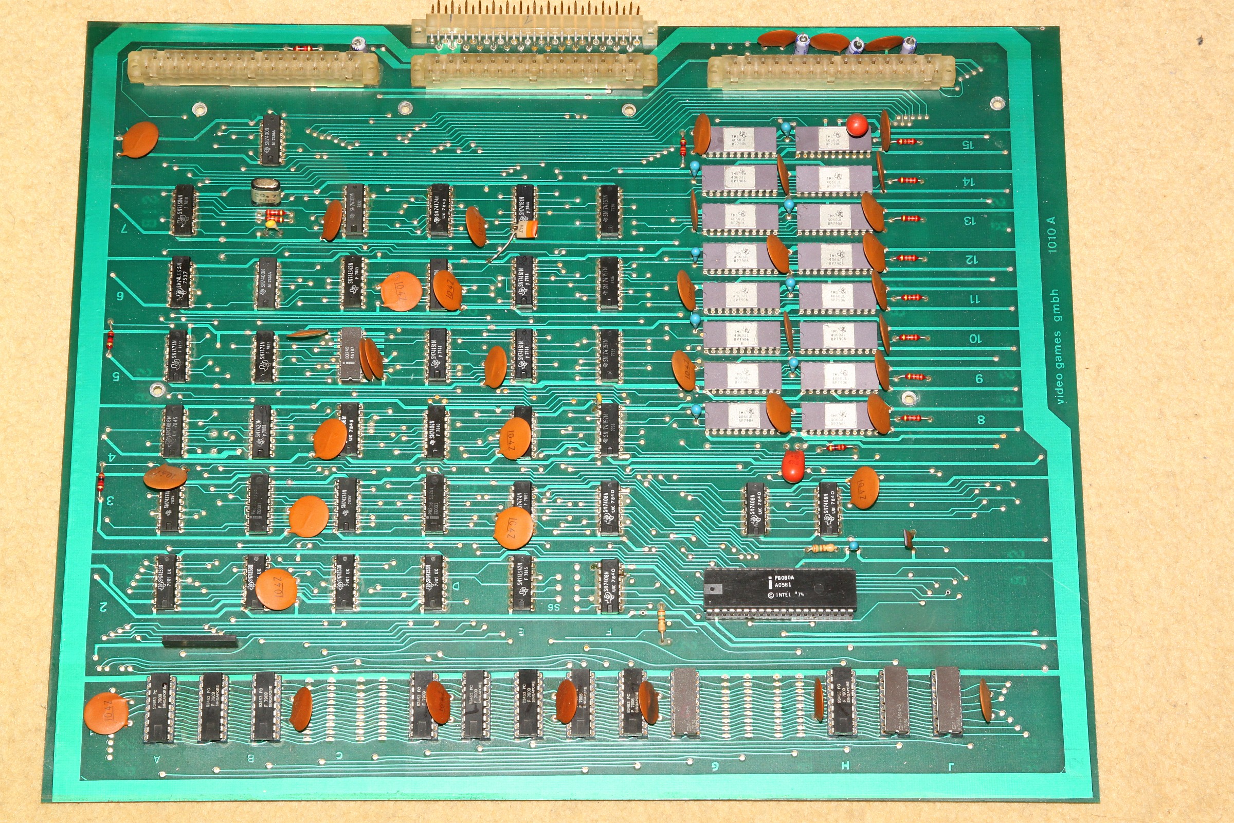 {Space Attack BPROM Version} Eigentlich heißt das Spiel bei Video Games Lich "Space Attack". Wie man aber schon am verschwenderischen Einsatz der TMS4060 RAMs erkennen kann, ist dies ein astreiner Space Invaders Clone! Erstmal der Aufbau in Fotos: schöne saubere deutsche Technik... alle ICs sauber ausgerichtet im Gleichschritt marsch! ;-)