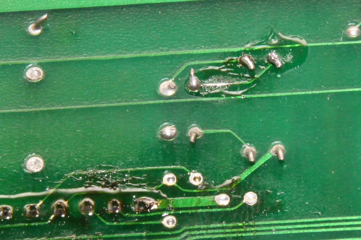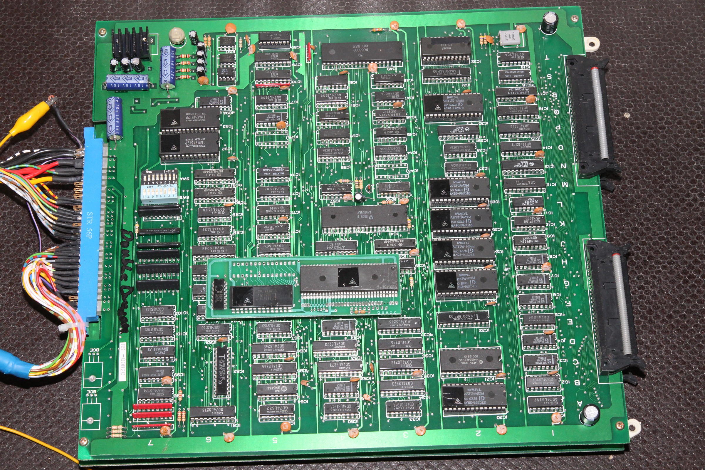 {Double Dragon Bootleg} Symptome: kein Ton, sonst geht alles... ein grenzwertiges Bootleg mit ultradünnen Leiterbahnen und miesen Sockeln. Dafür stimmt der Original-Schaltplan. Man nimmt, was man bekommt. {Fehlersuche} Speichertest O.K. Der Lautsprecher brummt, wenn man die AMP-Beinchen befingert, also muss der Fehler weiter hinten liegen. Die Soundchips bekommen keinen Input, also muss der Fehler weiter hinten liegen... Der gesamte Soundbereich bekommt überhaupt keinen Takt, der Quarz ist still, Treiber ist ein Goldstar 74LS04... also raus damit. Leiterbahn durchtrennt... kann ja nicht schwingen. Also Sockel und Original-IC rein - Takt geht und der Ton kommt auch, wenn auch recht krächzig... ich schiebe das auf das Bootleg. Dann - fünf Minuten später: die Grafik verändert sich signifikant... Da stirbt mir doch was in der Sprite-Generierung unter der Reparatur... na ja, ist ja nicht das erste Mal. Klar, das ich nach den Hinweisen im Netz erst mal die Sprite Buffer RAMs getauscht habe... hier stehen die Daten drin, welche Sprites an welcher Stelle zu erscheinen haben, noch nicht die Grafikdaten! Auch hier werden gerade und ungerade Zeilen in unterschiedlichen RAMs abgelegt... könnte also der Fehler sein. Ein Datenbus sieht so aus: Der im Nachbar-RAM so: (kommt aus einem Goldstar Bustreiber...) Aber daran lag es nicht. Sowohl RAM-Tausch als auch Brücken des schwächlichen Treibers brachte keine Änderung. Nun musste ich die komplette Grafikkette durchgehen. Das Umschaltsignal zwischen geraden und ungeraden Zeilen hilft dabei. Vor den GFX-EPROMs (Adressbus) war noch alles bei beiden Zeilen gleich... nach den EPROMs (Daten) auch... Aber am Datenausgang des letzten RAMs IC120 (enthält die echten Grafikdaten) erkennt man einen deutlichen Unterschied zwischen den Zeileninhalten:br> Entweder ist das RAM defekt oder davor geht was verloren... Die ersten vier Adressbits sehen gut aus... Die zweiten vier nicht so... Da liegt der Fehler... ein 74LS86 ist gestorben... Der Huckepacktest funktioniert hier gut: Schon ist die Grafik vollständig. Alle RAMs haben funktioniert. {Das Finale} Was noch gefehlt hat: der Quarztakt in der Soundecke. Nachdem weder original alte, noch "S" Typen noch neue "LS" 7404er getan haben, bin ich - Astro's Rat folgend - konsequent auf Fehlersuche mit dem Durchgangsprüfer gegangen. Diese Bootlegs mit unscharfen und ewig dünnen Leiterbahnen... hier war tatsächlich eine mit bloßem Auge nicht sichtbare Unterbrechung... Draht hilft. Und die PCB ist nicht mehr taktlos. Stabil und nun mit glasklarem Sound. Grafik O.K.: Harte Jungs... Was machen die da eigentlich? ;-) |