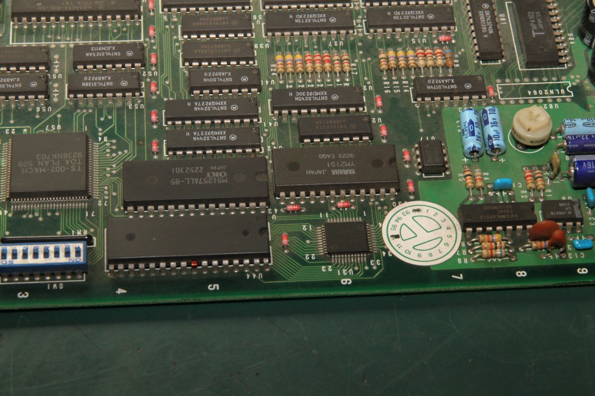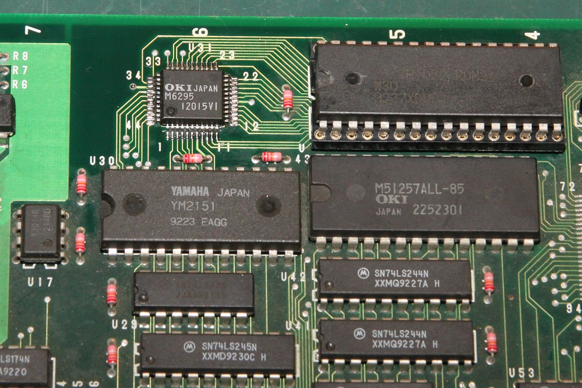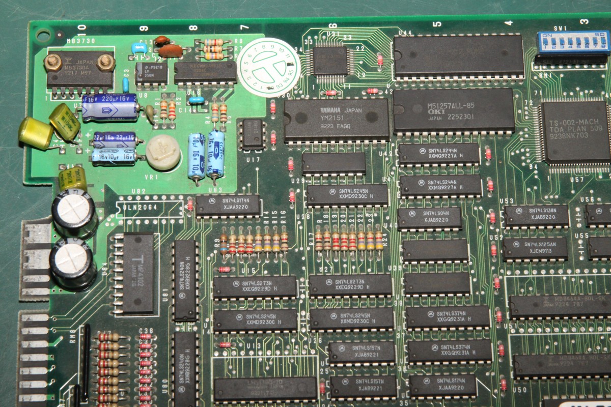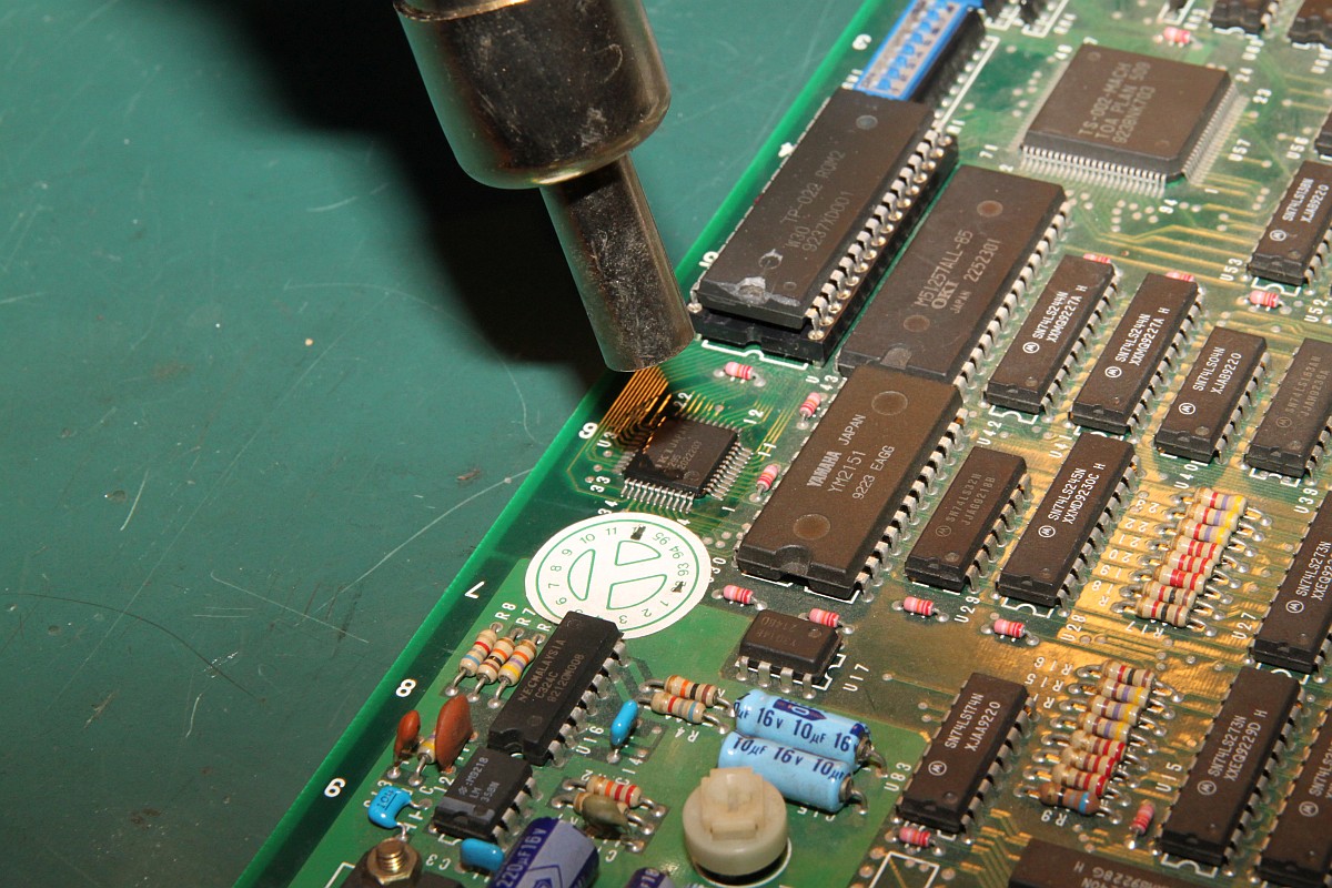 {Dogyuun Sound Reparatur} Dogyuun - ein schöner Shooter mit gestraffter Technik: {Diagnose} Natürlich gibt es auch hier keinen Schaltplan, aber die Platine ist wirklich sehr schön aufgeräumt. Fehlerbild: die Sound-Samples sind völlig wirr. Es kommt was raus, aber nicht das, was rauskommen soll. Hier mal der Audio Teil - das viereckige IC ist der MSM6295, ein "four channel mixing ADPCM voice synthesis LSI"... In aller Einfachheit: (E)PROM mit Sound-Samples ranklatschen und der Controller muss dem Baustein nur noch sagen "Spiel bitte Sample Nummer 25 ab!"... Falsche Samples kann heißen a) falsche Steuersignale an den 6295, b) defektes PROM, c) Datenbus kaputt, d) Adressbus kaputt. Die Steuersignale sind alle sauber am Pulsen, der Datenbus zwischen PROM und 6295 ist gut, Adressbus Bit 11 ist fast ganz low... als einziges... Hier ein gutes Adresssignal: Hier A11: Das erklärt, dass Samples nicht unbedingt falsch klingen, nur im falschen Moment die falschen Samples aktiviert werden. MASK-PROM ausgelötet - mit viel Mühe und einem Heißluftfön: Als 27C2001 ausgelesen und im ROM Wizard gecheckt: Das ROM ist gut, zur Probe hab ich mal das A11-Beinchen entkoppelt - das Signal vom 6295 ist immer noch hinüber! Ersatz ist geordert - Fortsetzung folgt! {Reparaturabschluss} Dank an Astro, der mich (trotz Briefmarkenherausforderung) unkompliziert mit OKI Chips versorgt hat! Ich liebe die Arcade-Zone! Erst mal den alten Chip runter: Saubere Pads: Und nach einer Stunde hatte ich auch die letzte kalte Lötstelle rausgefunden und der Sound tut wieder 100%ig, was er tun soll... |
