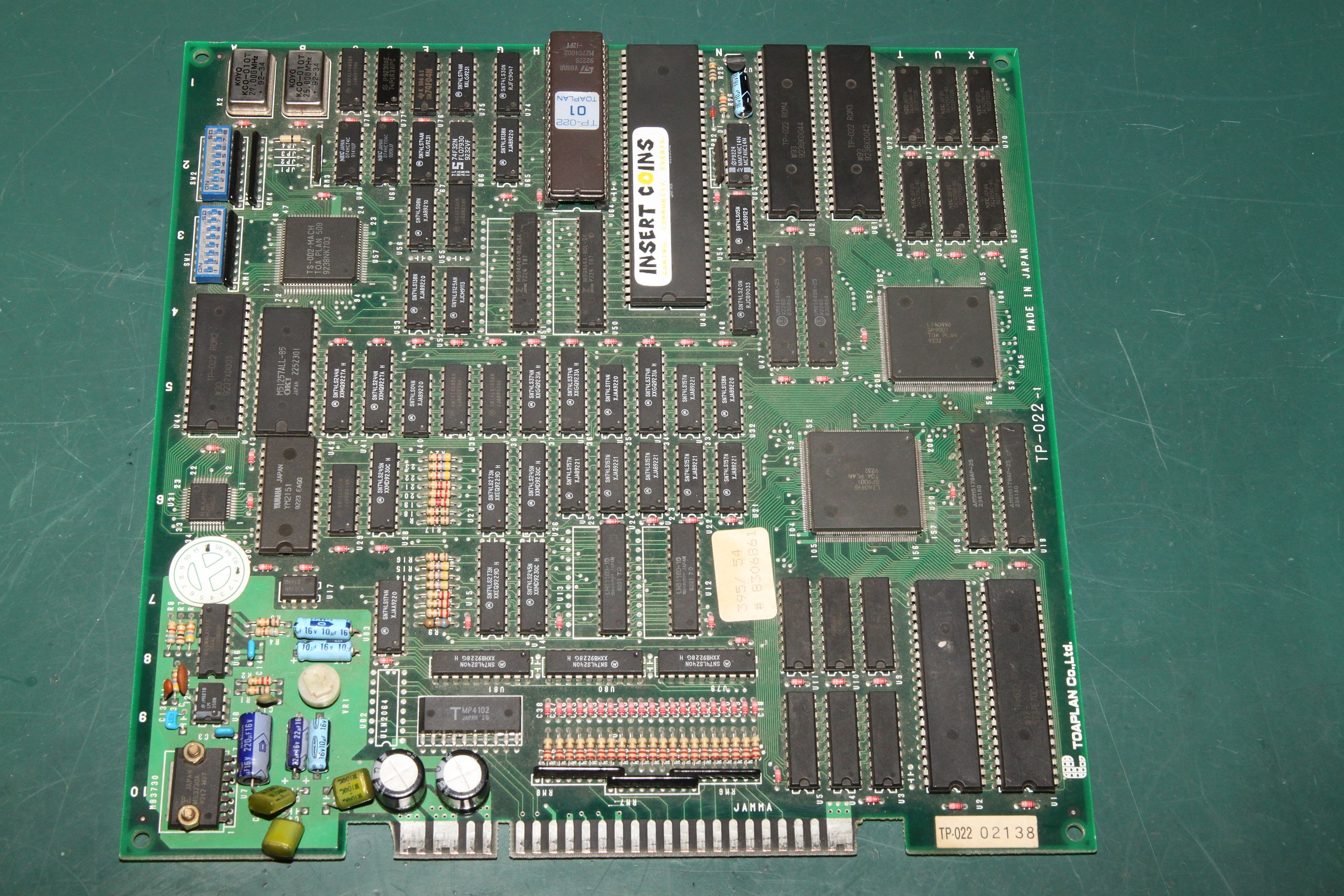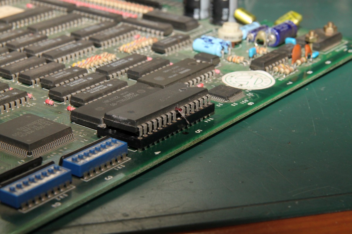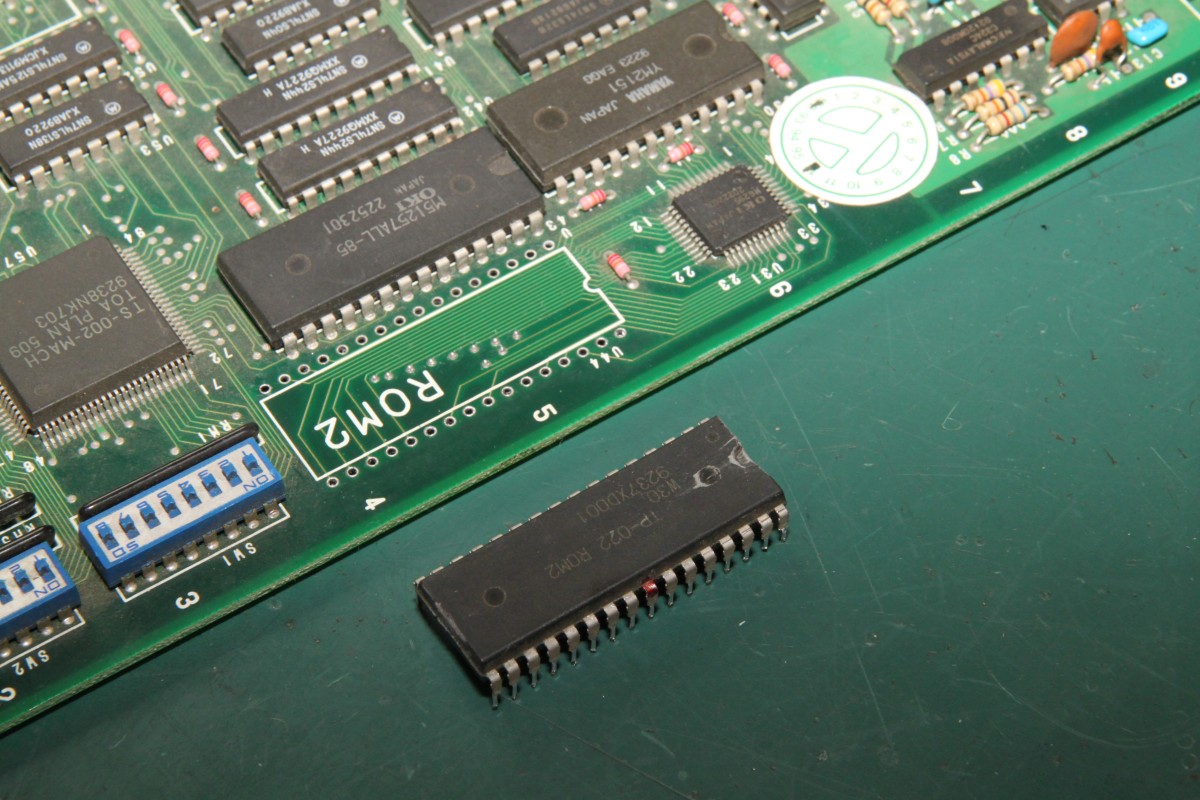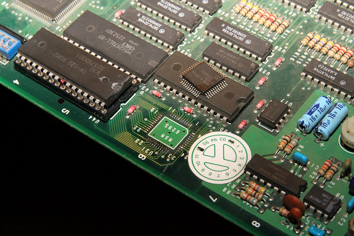{Dogyuun Sound Reparatur} Dogyuun - ein schöner Shooter mit gestraffter Technik: {Diagnose} Natürlich gibt es auch hier keinen Schaltplan, aber die Platine ist wirklich sehr schön aufgeräumt. Fehlerbild: die Sound-Samples sind völlig wirr. Es kommt was raus, aber nicht das, was rauskommen soll. Hier mal der Audio Teil - das viereckige IC ist der MSM6295, ein "four channel mixing ADPCM voice synthesis LSI"... In aller Einfachheit: (E)PROM mit Sound-Samples ranklatschen und der Controller muss dem Baustein nur noch sagen "Spiel bitte Sample Nummer 25 ab!"... Falsche Samples kann heißen a) falsche Steuersignale an den 6295, b) defektes PROM, c) Datenbus kaputt, d) Adressbus kaputt. Die Steuersignale sind alle sauber am Pulsen, der Datenbus zwischen PROM und 6295 ist gut, Adressbus Bit 11 ist fast ganz low... als einziges... Hier ein gutes Adresssignal: Hier A11: Das erklärt, dass Samples nicht unbedingt falsch klingen, nur im falschen Moment die falschen Samples aktiviert werden. MASK-PROM ausgelötet - mit viel Mühe und einem Heißluftfön: Als 27C2001 ausgelesen und im ROM Wizard gecheckt: Das ROM ist gut, zur Probe hab ich mal das A11-Beinchen entkoppelt - das Signal vom 6295 ist immer noch hinüber! Ersatz ist geordert - Fortsetzung folgt! {Reparaturabschluss} Dank an Astro, der mich (trotz Briefmarkenherausforderung) unkompliziert mit OKI Chips versorgt hat! Ich liebe die Arcade-Zone! Erst mal den alten Chip runter: Saubere Pads: Und nach einer Stunde hatte ich auch die letzte kalte Lötstelle rausgefunden und der Sound tut wieder 100%ig, was er tun soll... |