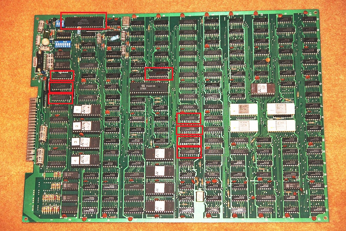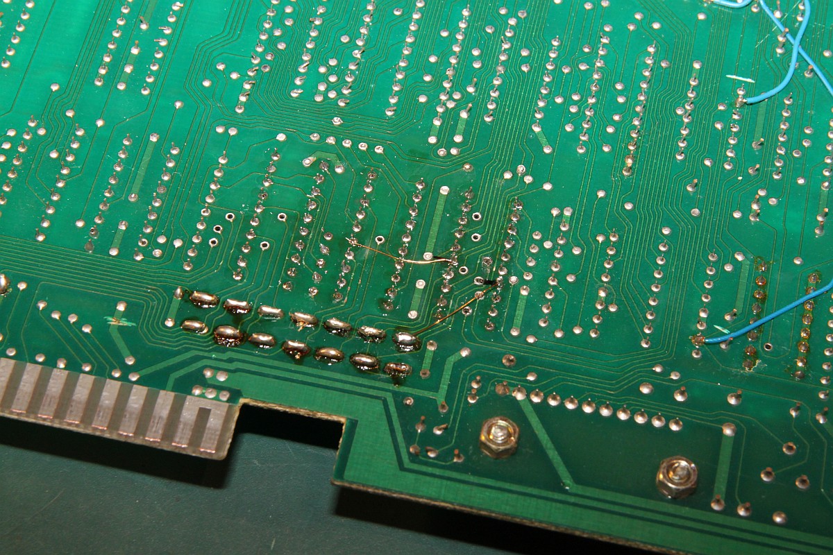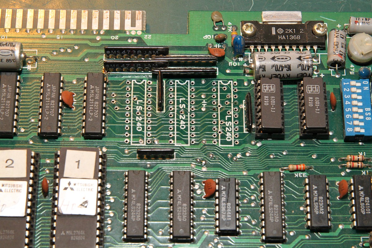 {Popeye Bootleg} Das Bild ist dem Bootleg entsprechend. Der Popeye Titelschirm hat massive Grafikfehler und Farbprobleme, das hatte ich aber bei einem baugleichen Bootleg auch schon und kann es somit auf das Bootleg schieben - Pfuscher, elende... {Fehlersuche} Der Elko hier hat sich schon halb ausgezogen, den sollte ich aus Kurzschlussvermeidungsgründen beizeiten ersetzen! Nachdem ich einen kompletten Jamma Adapter gelötet habe, entdecke ich einen erheblichen Sounddefekt. Sinnloses Gedudel entströmt dem Lautsprecher, nur im Hintergrund kann man das Coinen erahnen, alles geht in einer Kakophonie des Grauens unter... Der Datenbus des AY-3-8910 sieht ziemlich schwach aus... Klar, dass der Soundprozessor daraus nichts Gescheites erkennen kann... Der Nintendo-Schaltplan ist von den Bootleggern nur in Teilen kopiert worden, hilft hier aber trotzdem ganz gut: Auch die 2114 RAMs werden von diesem Datenbus versorgt... Alles kommt aus diesem Bustreiber raus: Schritt 1: diesen erstzen - die Huckepackmethode hat allerdings nichts gebracht und den AY aus der Fassung nehmen hat den Datenbus auch nicht stabilisiert - irgendwie befürchte ich, dass der Ärger noch wo anders liegt... {Fehlersuche} Weiter geht's: Bustreiber gewechselt - Ergebnis: keine Änderung Der Schaltplan hilft nicht wirklich, manches am Bootleg ist doch deutlich anders aufgebaut, als im Original Nintendo Plan. Die drei 74LS240 sind aber gleich. Sie hängen am Datenbus und lesen die Eingangssignale aus... Dabei gleich mal die Leiterbahnen beschädigt - die Bootlegqualität ist wieder mal unterirdisch... Ergebnislos wieder rein und die Leiterbahnen geflickt - wieder eine Stunde für nix... Die letzte Chance: 4 Stück LS244, die Leiterbahnen bleiben ganz, dafür delaminiert die PCB gleich großflächig... Ergebnis: keine Änderung... Also alles wieder rein und noch 'ne Stunde auf gut Glück gemessen, alles erscheint gut, bis auf die extrem niedrigen Datenpegel. Eine Ursache kann ich nicht finden. Nachdem ich folgende Bauteile entfernt / getauscht habe, kapituliere ich vor diesem Boot-Dreck! |