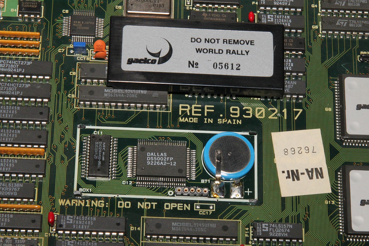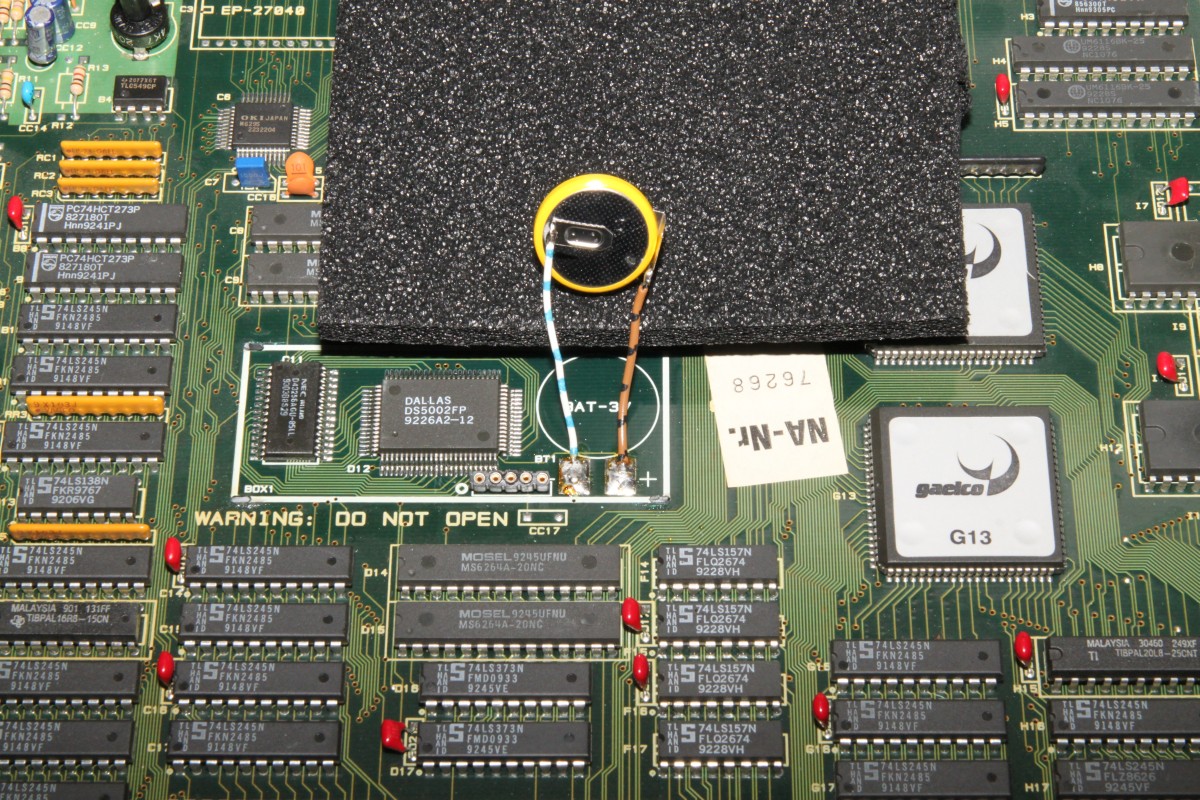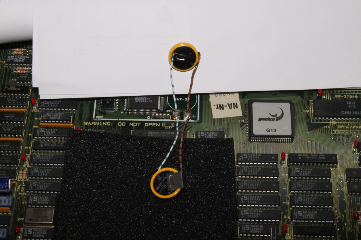 {World Rally Batterietausch} Eigentlich wollte ich das Teil wegpacken - dann überfiel mich hemmungsloses Verantwortungsbewusstsein: was, wenn die Backup-Batterie schlapp macht... wäre doch schade. Also sofort den Deckel abgesprengt, den man nie nicht öffnen soll... Darunter: ein Dallas Microcontroller, ein SRAM mit Decryption-Tabelle und eine Lithium-Zelle. Das Datenblatt des SRAM zeigt, dass dieses speziell für Batteriebetrieb ausgelegt ist. Mein Multimeter sagt mir, dass die Zellenspannung auf 3,1V abgesunken ist - eine frische Lithiumzelle hat 3,3V... Es wird Zeit!!! Das SRAM darf nicht stromlos werden, ein Puffer-Elko wie bei CPS2 fehlt hier. Dafür wird das SRAM bei angeschlossener PCB mit 5V versorgt - Sicherheitshalber sorge ich für eine Notstromversorgung, man weiss ja nie... Gute Vorbereitung und eine ruhige Hand beim Löten ist hier wichtig. Man muss vor Allem beim Auslöten der Originalbatterie darauf achten, dass die Überbrückungsbatterie nicht mit ausgelötet wird! Notstrom angeschlossen: Schlappe Zelle entfernt: Neue Zelle dran: Notstromversorgung abgeklemmt: Ein Tropfen Heißkleber fixiert das Ganze: Eigentlich kann ja wenig schief gehen, wenn man die PCB angeschlossen hat, das SRAM bekommt ja immer Saft, aber spannend ist es doch. Aber wenn der CoPro O.K. ist, dann ist alles gut, auch wenn das Foto zufällig einen Grafik-Glitch eingefangen hat... Und den Deckel als Berührschutz habe ich auch gleich noch mit Heißkleber fixiert, nicht, dass noch was kaputt geht. Es passt nicht mehr alles drunter, dafür lebt das Spiel wieder Jahre länger! |