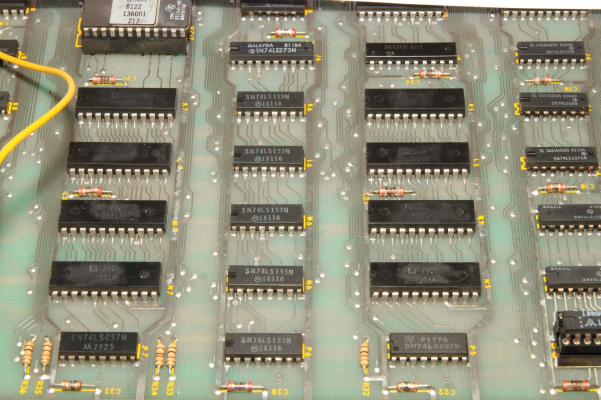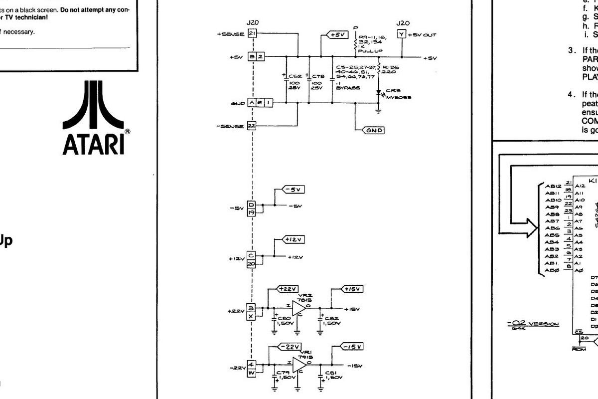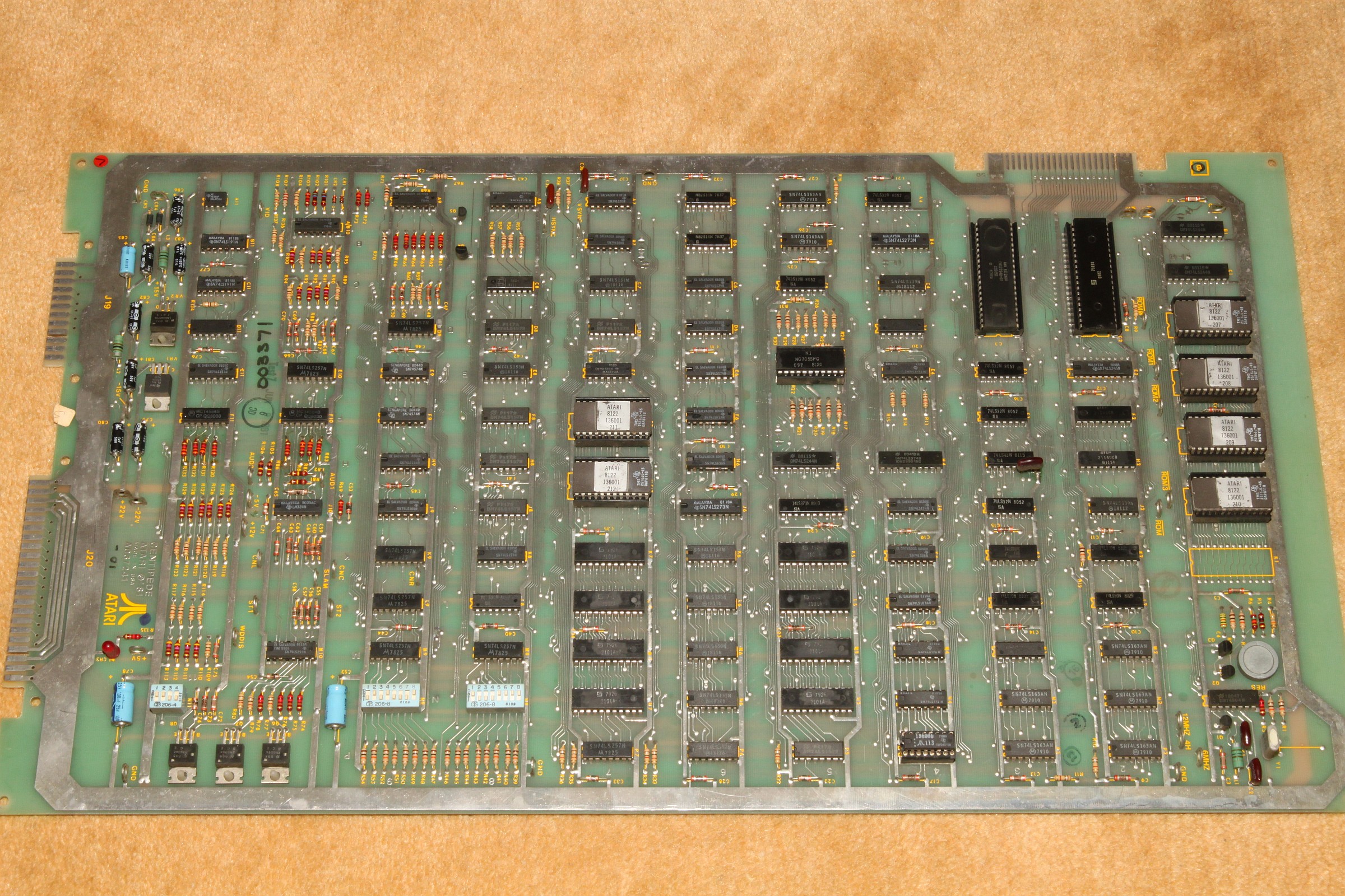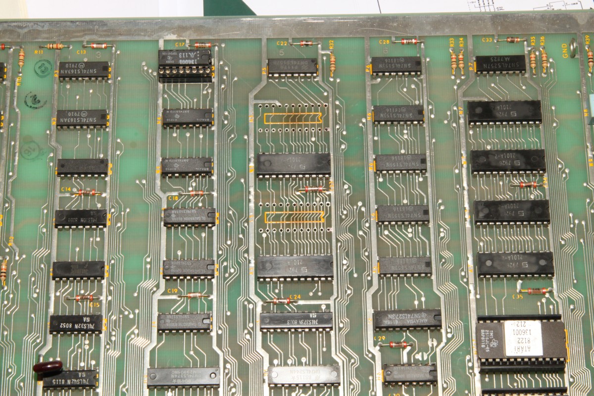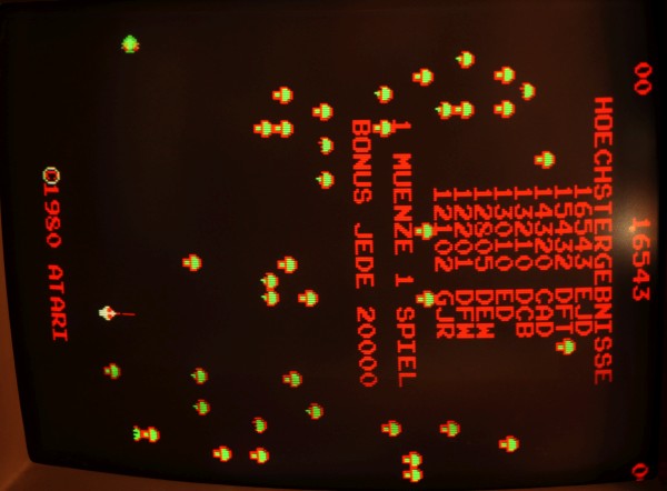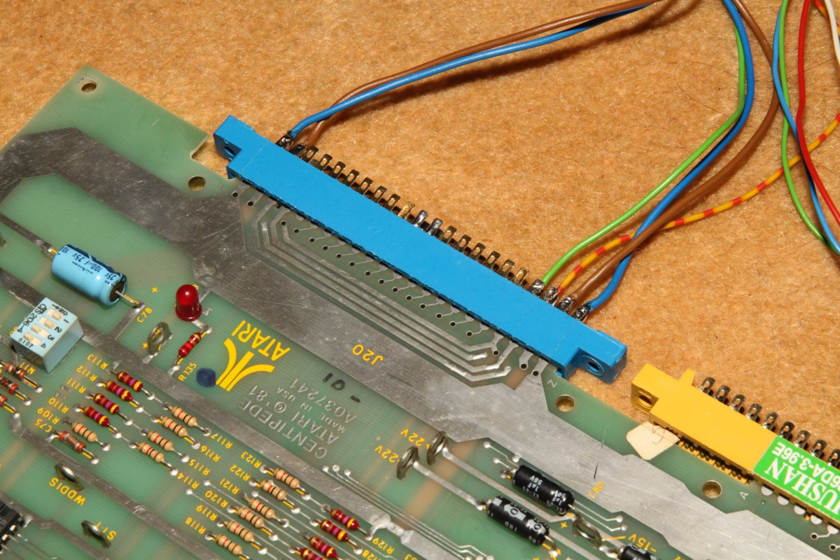 {Centipede} Mein neuer Patient: Centipede - Atari Original mit guter Dokumentation: Die zwei Platinenstecker werden beide benötigt - Power auf der einen, Video auf der anderen Leiste: Da der Patient nur Grafikfehler hat (so die Kundschaft), habe ich nur das Nötigste angeschlossen: +5V, -5V, 12V, Video... Auf die exotischen +/-22V kann man für den Test verzichten. Da kommen wir schon zum Thema gute Doku: während die eine Seite des Handbuches +12V und -5V auf C bzw. D vermutet... ...belehrt einen die nächste Seite, dass diese Spannungen auf auch auf den Gegenseiten 20 und 19 zu finden sind - hier hat sich mal jemand Gedanken gemacht, was passiert, wenn der User den Stecker verkehrt herum aufsteckt. DIagnose im Gameplay: alle Sprites tummeln sich in der obersten Reihe (also eigentlich ganz links) - die Pilze sind teilweise falsch rum... Die gezielte Fehlersuche führt mich zu tauben Datenausgängen der nicht mehr ganz so leicht zu bekommenden 2101A RAMs im Playfield-RAM. Das ist der gute Datenbus: Das hier ist die taube Nuss: Raus mit den Leichen... Sauber gesockelt rein die Guten: Die Sprites sind wieder da! aber die Pilze stehen immer noch falsch und die Highscore-Tabelle ist völlig daneben... Noch mal messen. Da war doch tatsächlich einer meine "neuen" RAMs auch defekt... Egal, hab noch einige. Gut, dass ich gewechselte Bauelemente konsequent sockele. |