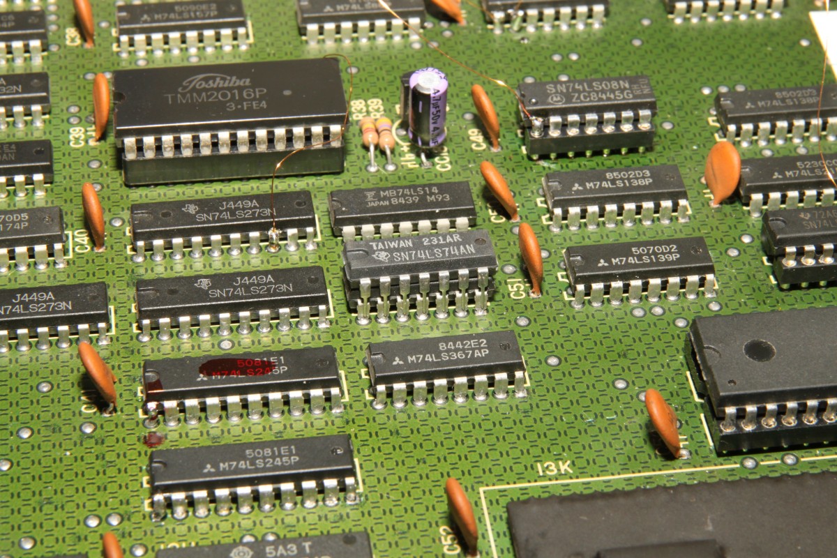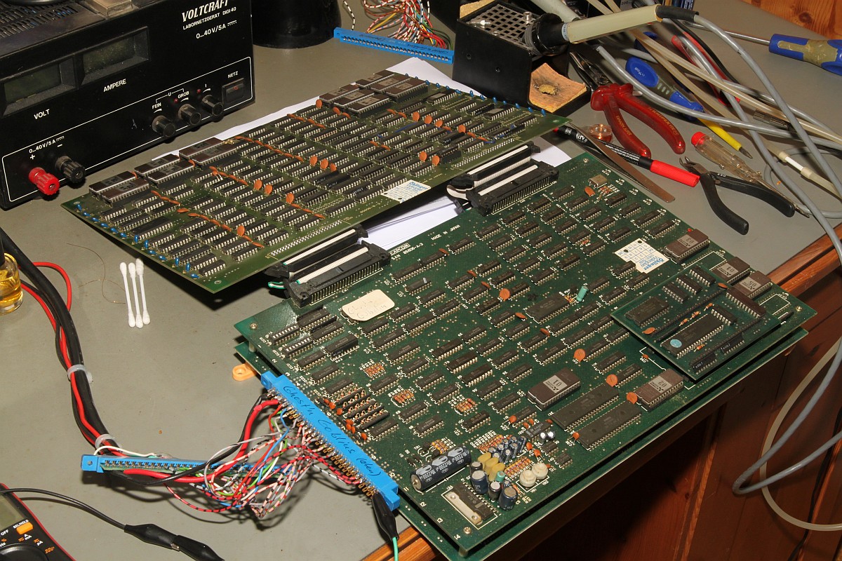 {Ghost 'n Goblins Original} So kann es kommen, wenn man ungezielt versucht, zu "reparieren": bei fast allen getauschten ICs sind die inneren Durchkontaktierungen gerissen, es ist mir persönlich unbegreiflich, wie das passieren kann, zumal man weder an den oberen, noch bei den unteren Pads irgendwelche Beschädigungen erkennen kann! Die G'n'G-Originalplatine ist speziell: Top- und Bottom-Layer sind durchgängige Spannungsversorgungsflächen, alle Leiterbahnen befinden sich in den inneren zwei Layern, unsichtbar und vor allem: man kommt nicht ran! Gut, dass es einen Schaltplan gibt, der zumindest zu 95% stimmt. Noch besser, wenn man eine Originalplatine zum Vergleich besitzt. Der Kunde hat zumindest versucht, seine Reparatur zu reparieren - leider mit begrenztem Erfolg. Solche Adressbusse braucht niemand, da fehlt wohl noch die eine oder andere Strippe: Wenigstens der Takt liegt an der CPU: Da kann ich doch gleich mal meine eigene G'n'G testen - sie hat anstelle des vergossenen Soundhybriden eine offene Adapterplatine, war sicher ein Glück für die Bootlegger... Läuft eine G'n'G nur mit dem CPU-Board? Eine Frage, die sich schon viele gestellt haben... einfach testen: In diesem Zusammenhang teste ich gleich mal, ob die Kunden-Sprite-PCB tut - sie läuft, also ist nur die CPU-PCB hin: Ich wurschtle mich durch fehlende Daten- und Adressbus-Verbindungen durch, manchmal fehlen auch Chip-Selcts... das gibt besonders lustige Signalformen: Nachdem ich eine fehlende Verbindung für ein Video-RAM-Enable gezogen habe, gibt es endlich sogar ein Bild. Statisch. Nachdem ich dann noch die defekte 68B09 getauscht hatte, ging grafisch die Post ab: O.K., das ist etwas zu viel Grafikoutput... Also nochmal genau die CPU-Signale checken... NMI ist Dauer-Low... dauernd Interrupt? das kann nicht gut gehen. Das Flip-Flop ist fritte... Hier läuft die Huckepacklösung wieder mal: Schon beruhigt sich die Grafik - die CPU läuft, mit ziemlichen Grafikfehlern, aber immerhin mal ganz grundsätzlich richtig... Wird sicher fortgesetzt... |