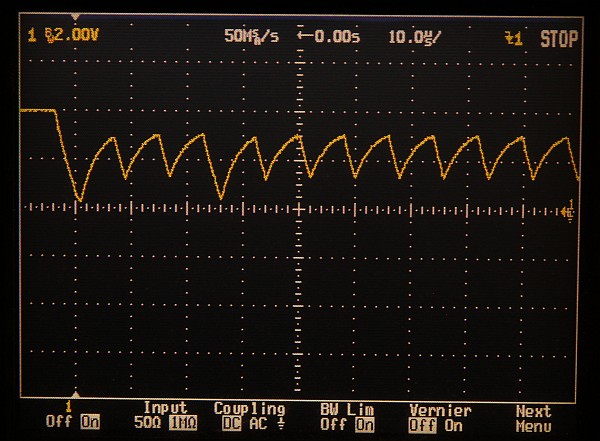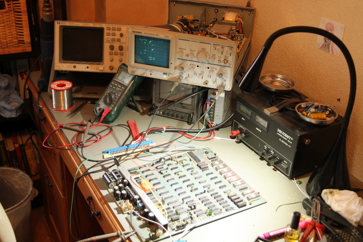 {Proel Meteorite} Ein Traum, der hoffentlich nicht zum Alptraum wird - Meteorite Wandautomat mit einer PCB, die absolut unbekannt ist und einem schicken Hantarex Vector Monitor. Status: geht nicht. In diesem Falle sollte man einem geschenkten Gaul aber mal so richtig ins Maul schauen! Proel war eine italienische Firma aus Turin, die nur einige wenige ziemlich unbekannte Bootlegs von Bootlegs hervorgebracht hat. Dieses hier ist ein Bootleg von Sidams Asterock, welches wiederum ein Bootleg von Ataris Asteroids ist. Immerhin existiert von "Asterock" ein Schaltplan... Die DACs - ohne Typenbezeichnung - und nein, es sind nicht die üblichen Asteroids AD561, doch davon später mehr... Ein bipolares Prom ist auch verbaut, wäre ja sonst auch zu einfach... Die EPROM-Bank - 2708 - wäre ja sonst auch zu einfach... Sagte ich das schon? Die Inspektion sagt: Kondensator ab. Aber mit neuem C wird es nicht besser. Das Spiel läuft, man hört es am Ton, doch als Bild kommen nach einiger Zeit nur kleine aufblitzende Punkte... Ich will das Teil jetzt auf meinem Labortisch testen und nicht in der Garage bei -5°C... Aber woher nimmt man die üble Spannungsversorgung? Sicherheitshalber entferne ich alle Linearregler und speise direkt ein: Jammafiziert... Doch der DAC benötigt laut SIDAM Asterock Schaltplan noch eine -15V Hilfsversorgung... dafür hab ich immer einen Sack voller DC/DC-Wandler: Hier ist er (Jetzt die Frage: aber da steht doch +15V drauf... das Teil ist galvanisch getrennt, einfach die +15V mit Masse brücken, schon ist die Masse -15V.): Alle Spannungen dran - leider kommt immer noch nichts Gescheites raus, obwohl an den DA-Wandler-Dateneingängen die Hölle los ist... Ach ja, D/A-Wandler - nach langer Suche habe ich rausgefunden, was das für einer sein könnte: Analogausgang an Pin 3 - sollte also ein DAC100 sein... Gestern hab ich in der kalten Garage noch mal im Automaten gemessen... Pin 16 des DAC liegt stabil auf 0V, obwohl der doch eigentlich auf der Referenzspannung dümpeln sollte... Da kann nichts Analoges rauskommen, wenn ich das richtig verstehe. Vielleicht ist ja auch der nachfolgende TL084 hin... Oder aber der nachfolgende OP-AMP reguliert das auf 0V nach... (So ist es übrigens auch!) da der Automat im Gegensatz zum Video des Vorbesitzers bei mir gar kein Bild hatte, hab ich mal ein thermisches Problem vermutet und bin mit dem Heißluftfön in die Garage gewandert. Das wäre sicher ein seltsames Bild gewesen - Mike hält einen Fön in einen offenen Wandautomaten und freut sich... Heureka, nach wenigen Minuten hatten wir das beschriebene durchlaufende Bild. Cool. Der Hantarex-Vector ist gestochen scharf! Also Fazit: der Analogteil funzt. Mal so ganz grundsätzlich. ...und einen 74LS00: Leider lag es auch daran nicht... Die beiden TTLs waren es nicht - die alten Vektor-Hunde haben die unangenehme Eigenschaft, digitale und analoge Teile trickreich miteinander zu mischen, da kommen solche seltsam geplätteten Kurvenformen vor... Also dachte ich bei mir: sieh Dir mal das Vektor-Bild auf dem X-Y-Kanal des Oszis an. 3000 DM Digitaloszi - 500MHz Bandbreite - völlig unbrauchbar für sowas... Aber hey - ich war ja nicht blöde und hab mal bei einem Analogoszi-Wrack mit Dellen und ohne Deckel für 'nen Zehner zugegriffen... Das geht schon besser: Man sieht: die X-Ablenkung funktioniert leidlich, die Y-Ablenkung kennt nur eine Zeile... Da stimmt doch was mit den Zählern nicht - die werden mit der Anfangskoordinate vorgeladen und zählen dann je nach Vektor rauf oder runter und malen dabei einen Strich... LDSTROBE nach dem LS32 war dauerhigh - es gab also kein Vorladen... So kann es nicht funktionieren. Das erklärt auch das Durchlaufen des Bildstreifens: es konnte keine neue Anfangskoordinate gesetzt werden, es ging nur immer auf- oder abwärts... Der LS32 sitzt links vom orangen Custom-Block - mittendrin im Vergussmassen-Schmodder. Sein Eingangssignal ist platt. Ich finde keine Verbindung zu anderen Bausteinen. Also alles raus und sauber machen... {Reparatur - endlich!} Custom raus... 74LS32 raus... ...und den 74LS138 auch noch, da ist auch Schmodder drunter... Nach dem Putzen offenbart sich Grusliges: da fehlen einige Kupferatome... geradezu weggefressen von der sich auflösenden Vergussmasse: Das kann so nicht funktionieren: Den "Custom" hab ich gleich mal entschärft, dass der mit nichts anderem mehr in Berührung kommt: Die zerfressenen Leiterbahnen auf der Unterseite geflickt: Alles wieder sauber bestückt: Das Billigoszi liefert doch gleich mal einen guten Eindruck... Juchu... Mein Arbeitsplatz im Warmen: Draußen im Kalten - in der Garage - steht einsam der Automat... Wieder bestückt: Er bestraft mich mit akuter Bildlosigkeit - hab ich auch irgendwie verdient. Erst, als ich ihm mit meinem Heißluftfön auf Zimmertemperatur bringe, wird das Bild hell... ich denke, hier muss ich mich noch mal mit der Technik des Hantarex auseinandersetzen. Aber wenn er kuschelig warm ist, belohnt er mich mit gutem Bild: Erstaunlich, dass eine italienische Firma ein Bootleg eines Bootlegs eines Originalspiels tatsächlich mit deutschen Texten ausgestattet hat... Ist es nicht schön? Nächster Halt: 2708 auslesen - MAME zuführen - Hanta fixen. |