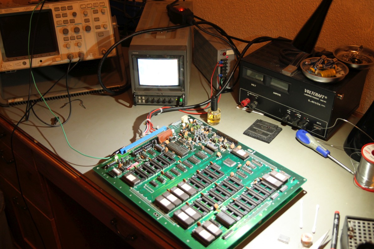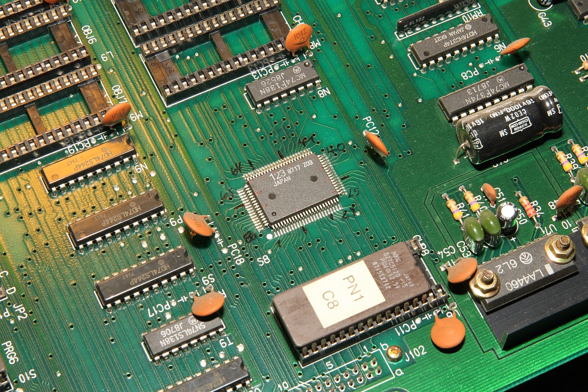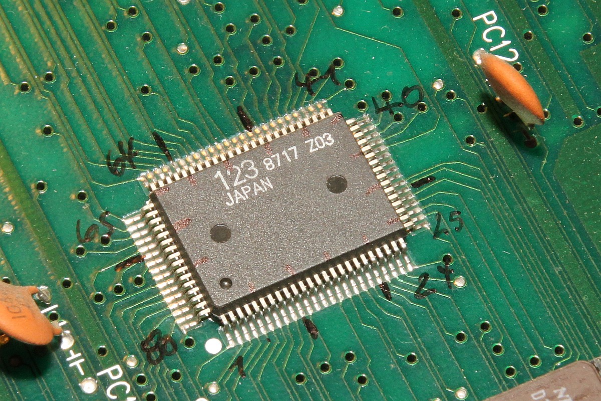 {Pacmania} der Patient - Pacmania, Namco System 1. Symptome: kein Tiles Layer, kein Text Layer. Messungen zeigen: Null Aktivitäten an den entsprechenden EPROMs, kein Datenbus, kein Adressbus... Zuständig ist hier der freundliche Custom Chip CUS123... Zum Messen sollte man die Beinchenzahlen ordentlich numerieren: Interessantes Bild: alle Sprites gehen, Sound ist gut... leider nicht spielbar, man sieht vom Spielfeld nichts. Upps... an den Beinchen 72 und 73 liegen +5V und GND direkt nebeneinander - nicht schlimm, weil a) die Versorgung noch an einigen anderen Beinchen anliegt und b) der Custom eh platt ist... Grün: Action. Rot: völlige Stille... Ich weiss gar nicht, was ich sagen soll... Soeben kam ein Paket an... Es gibt in den Arcadeforen freundliche Helferlein. Ein großer Dank geht an Tom von Arcadiabay!!! Schrott kann manchmal sooo hilfreich sein - gleich kanibalisiert. Auf dem Patienten die Leiche entfernt - man sieht die angeschmorte +5V-Leitung... mea culpa... Gut geputzt - die Schmorleitung ist gleich mal komplett abgegangen. Mal sehen, ob die übrigen Stromversorgungsleitungen ausreichen. Der Custom wird ja nicht mal warm... Hübsch aufgelötet und geputzt: Mein Arbeuitsplatz (mit freundlicher Genehmigung von meiner Lütten...): Huston, wir haben ein Bild!!! (auch wenn es viel zu hell ist...) Bei dem Videopegel wundert mich das nicht - da muss das Herrchen der PCB wohl Dioden oder Widerstände in die RGB-Leitungen legen. |