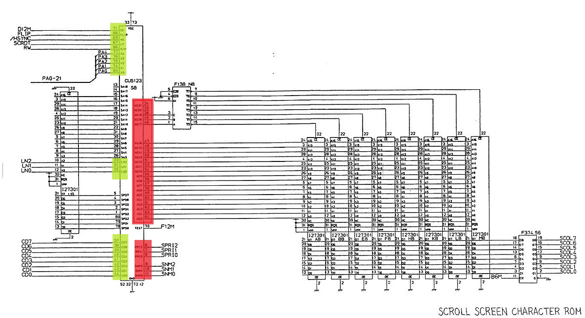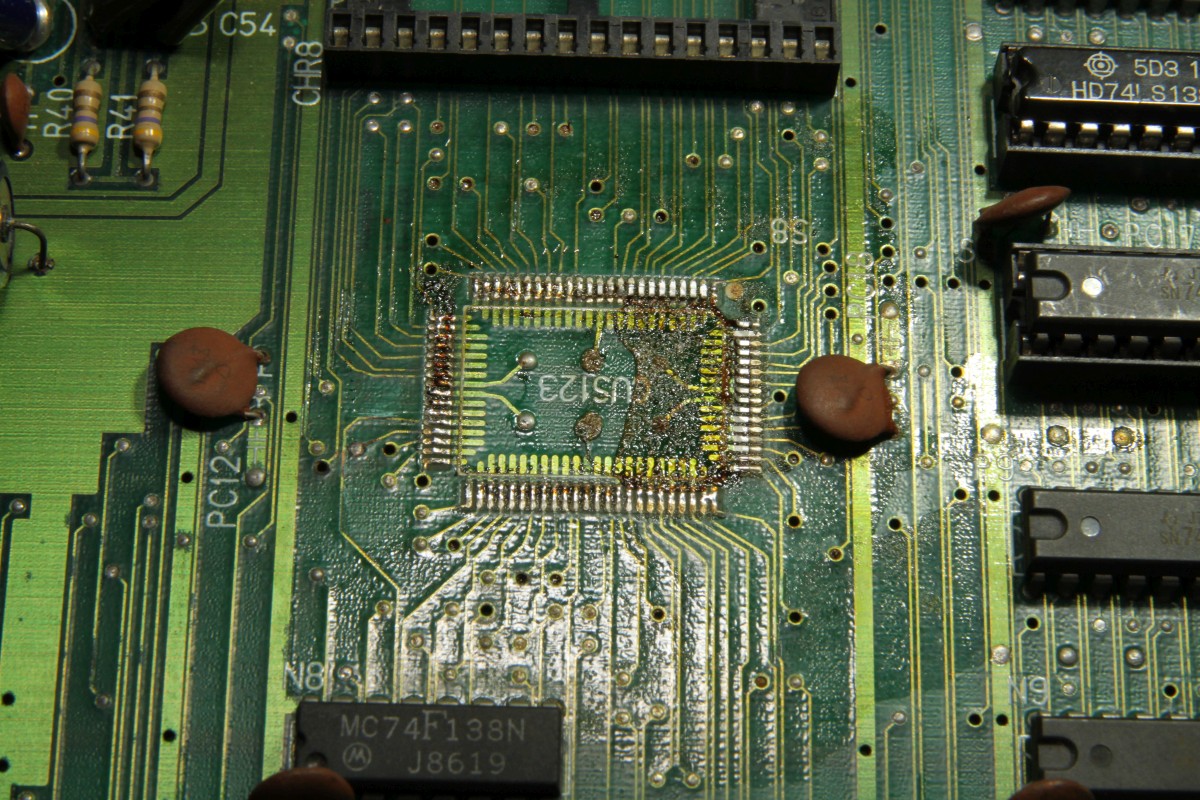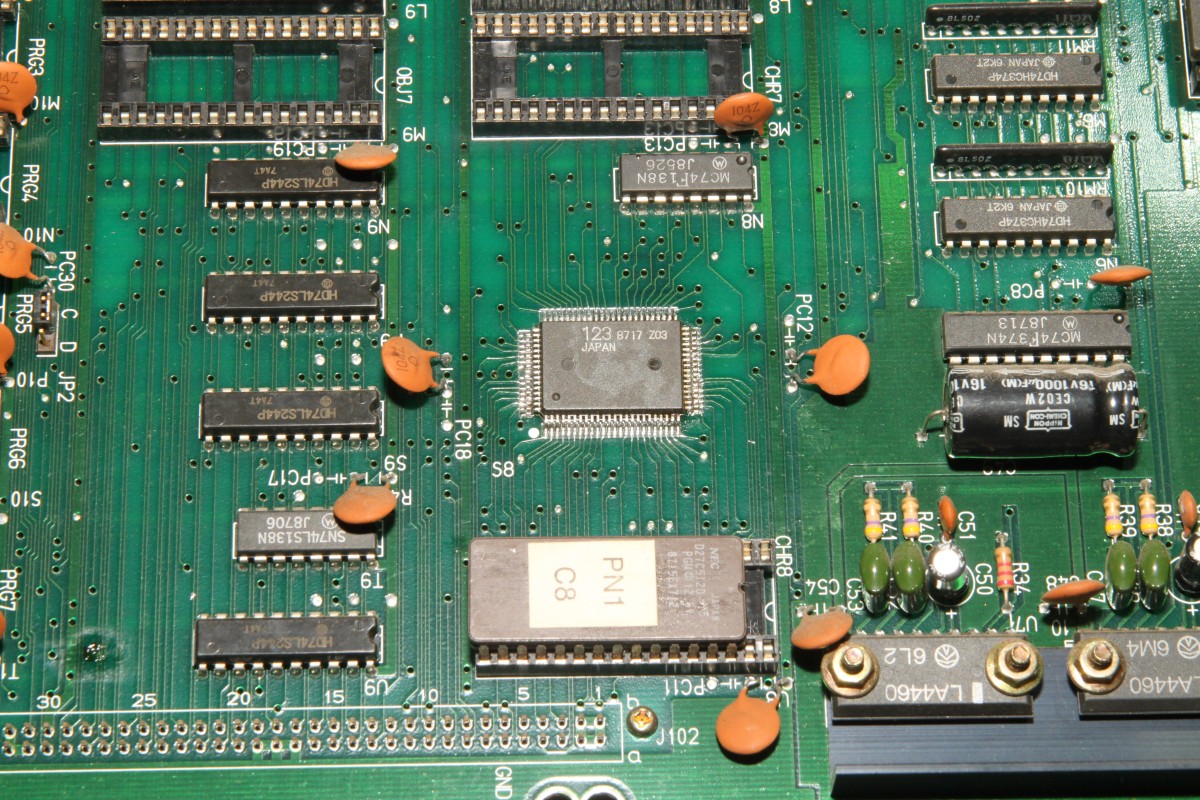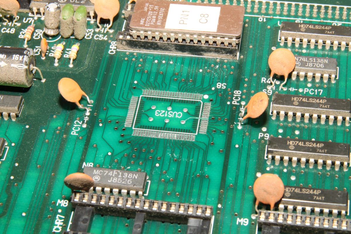 {Pacmania} der Patient - Pacmania, Namco System 1. Symptome: kein Tiles Layer, kein Text Layer. Messungen zeigen: Null Aktivitäten an den entsprechenden EPROMs, kein Datenbus, kein Adressbus... Zuständig ist hier der freundliche Custom Chip CUS123... Zum Messen sollte man die Beinchenzahlen ordentlich numerieren: Interessantes Bild: alle Sprites gehen, Sound ist gut... leider nicht spielbar, man sieht vom Spielfeld nichts. Upps... an den Beinchen 72 und 73 liegen +5V und GND direkt nebeneinander - nicht schlimm, weil a) die Versorgung noch an einigen anderen Beinchen anliegt und b) der Custom eh platt ist... Grün: Action. Rot: völlige Stille... Ich weiss gar nicht, was ich sagen soll... Soeben kam ein Paket an... Es gibt in den Arcadeforen freundliche Helferlein. Ein großer Dank geht an Tom von Arcadiabay!!! Schrott kann manchmal sooo hilfreich sein - gleich kanibalisiert. Auf dem Patienten die Leiche entfernt - man sieht die angeschmorte +5V-Leitung... mea culpa... Gut geputzt - die Schmorleitung ist gleich mal komplett abgegangen. Mal sehen, ob die übrigen Stromversorgungsleitungen ausreichen. Der Custom wird ja nicht mal warm... Hübsch aufgelötet und geputzt: Mein Arbeuitsplatz (mit freundlicher Genehmigung von meiner Lütten...): Huston, wir haben ein Bild!!! (auch wenn es viel zu hell ist...) Bei dem Videopegel wundert mich das nicht - da muss das Herrchen der PCB wohl Dioden oder Widerstände in die RGB-Leitungen legen. |