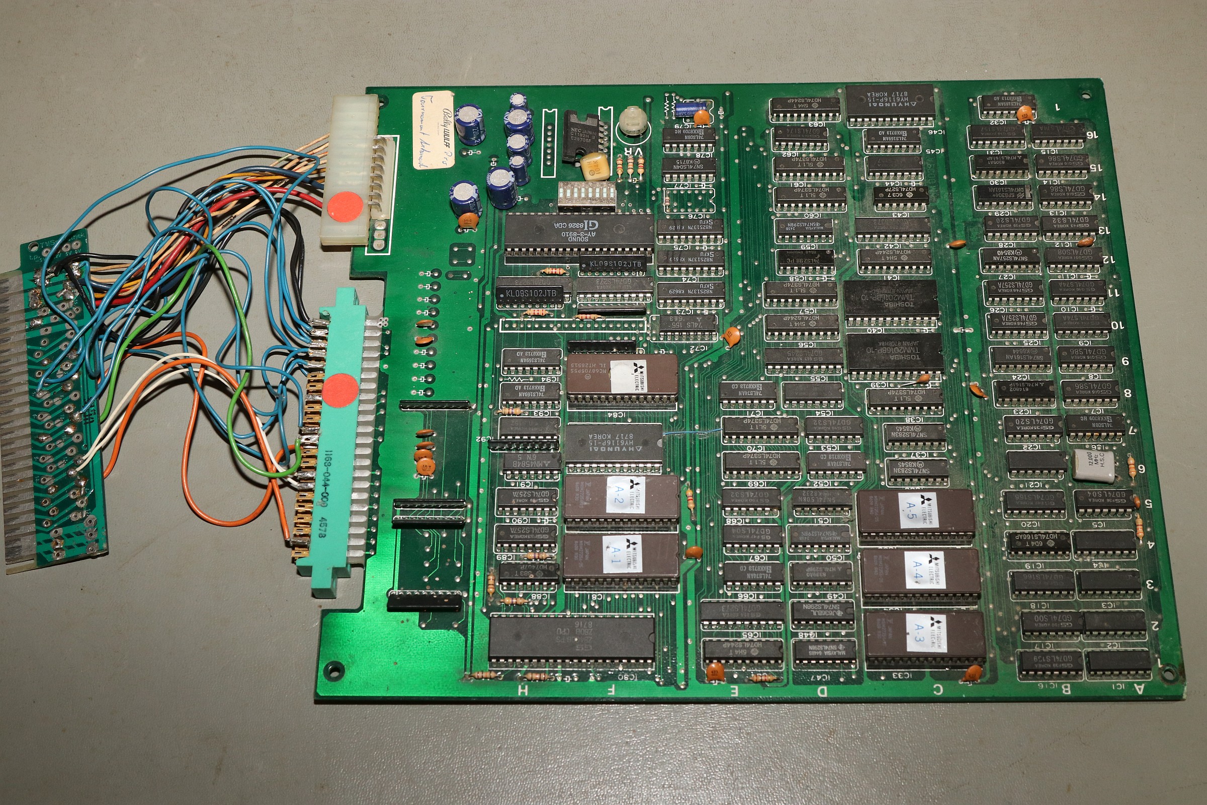 {Arkanoid im Original} vielen nicht bekannt: die Originale Taito Arkanoid-Platine ist eine Schönheit in Weiß! Was die Konstruktion nicht besser macht... Hier erst mal ein Blick auf eines der weithin bekannten Bootlegs: Das hier ist das seltenere Original, leider funktionsuntüchtig und nicht leicht zu reparieren... Die PCB-Bilder sind hoch auflösend und werden auf Klick ganz groß! Der Bildschirm begrüßt mich mit einem bekannten Fehler - ausgelöst mit großer Wahrscheinlichkeit von einer Teilnahmeverweigerung des bekannten Taito-Custom-Hybrid-Chips PC030CM. Der ist in so einigen Taito-Spielen verbaut, liest die Coin-Switches und steuert die Coin-Counter und Lockouts. Mittlerweile gibt es dazu sogar einen recht kostenintensiven Nachbau... ist nicht viel drin, aber dazu später! Nach Herumdrücken mit dem Tastkopf auf dem PC030CM lässt sich das Spiel sogar zum Starten bewegen, das Drama nimmt seinen Lauf! Das sieht jetzt grafisch mal gar nicht so gut aus... manche Sprites sind schlichtweg falsch. Gut, dass das Verhalten stark berührungsempfindlich ist. Da lässt sich der Fehler schnell eingrenzen: Adressbus A12 an den Sprite-GFX-EPROMs ist fritte... Da ist er... wer zum Teufel setzt 74LS298 ein - die hatte ich in meinem ganzen Arcade-Leben noch nie gebraucht, hab ich natürlich nicht da. Ein Blick in die Elektrobucht sagt mir, dass die Teile so teuer wie selten sind. Aber eine geduldige Suche führt mich zu 74298 ohne LS... die gibt es zeitweilig günstiger. Hier mal der entscheidende Schaltplanteil: Ich bin ein Magier - ich kann das Bild durch Fingeranlegen scheißig machen... ;-) Solange die TTLs noch nicht da sind, kann ich mich ja mal mit dem Hybridbaustein beschäftigen. Eigentlich macht der oft Probleme, weil er durch Biegung am Keramiksubstrat bricht... Der hier sieht eigentlich gut aus - zumindest bis zu den Pins. ...die sich mit der Platine teilweise nicht wirklich verbunden fühlen... Das Teil muss sauber raus! Von wegen Pins, der hat ja keine mehr... Das muss sauber gemacht werden, sonst sieht man nichts... Von unten sieht die Platine gut aus... Von oben fallen zu Allererst die schwarzen Ringe um die Vias auf, da fehlt wohl Kupfer... Jetzt merkt man, wie blöd es ist, eine Platine vollflächig weiß zu lackieren, man erkennt nicht, wo die Leiterbahnen langgehen. Der Glasfaserstift ist hier mein bester Freund: Also: die mechanische Belastung auf den Hybridbaustein hat vermutlich die oberen Lötaugen abgerissen und dabei die haarfeinen Leiterbahnen abgetrennt, da hift auch Lötgeschmodder nichts, da muss ich chirurgisch ran. Das ist hier mal der Blick durch das Mikroskop: Vias vorhanden, Restrings sind weg. Das wird was Längeres, bei dem viel Geduld und Fingerspitzengefühl gefragt ist - es geht ganz sicher weiter mit dieser Geschichte! {Reparatur} ...und so schnell... die TTLs sind da - danke, Kessler! Alt raus... ...und den neuen rein - ohne LS funktioniert das hier auch, die Teile sind etwas schneller und verbrauchen dafür etwas mehr Strom. Das spielt hier absolut keine Rolle! Der PC030CM erhält eine Luxus-Gehhilfe: ein 40poliger DIL-Sockel musste dafür sein Leben geben... Die Platine bekommt die zweite Hälfte, ich mag es lieber demontierbar, man weiß ja nie, ob der Hybride ganz in Ordnung ist! Die abgerissenen Leiterbahnen kann man prima auf der Unterseite flicken, das sieht sauber aus und hält vor Allem auch mechanisch! Lötbrücken auf der Oberseite wären sicher wieder demnächst abgerissen. Der Patient wird eingesteckt und die Platine bestromt... Tschacka - alles wieder gut... Coinup und Controls laufen auch einwandfrei! |