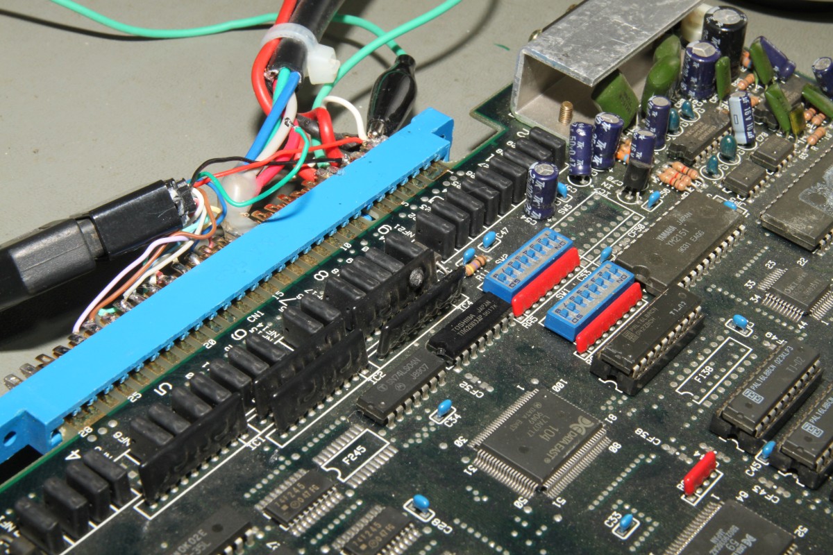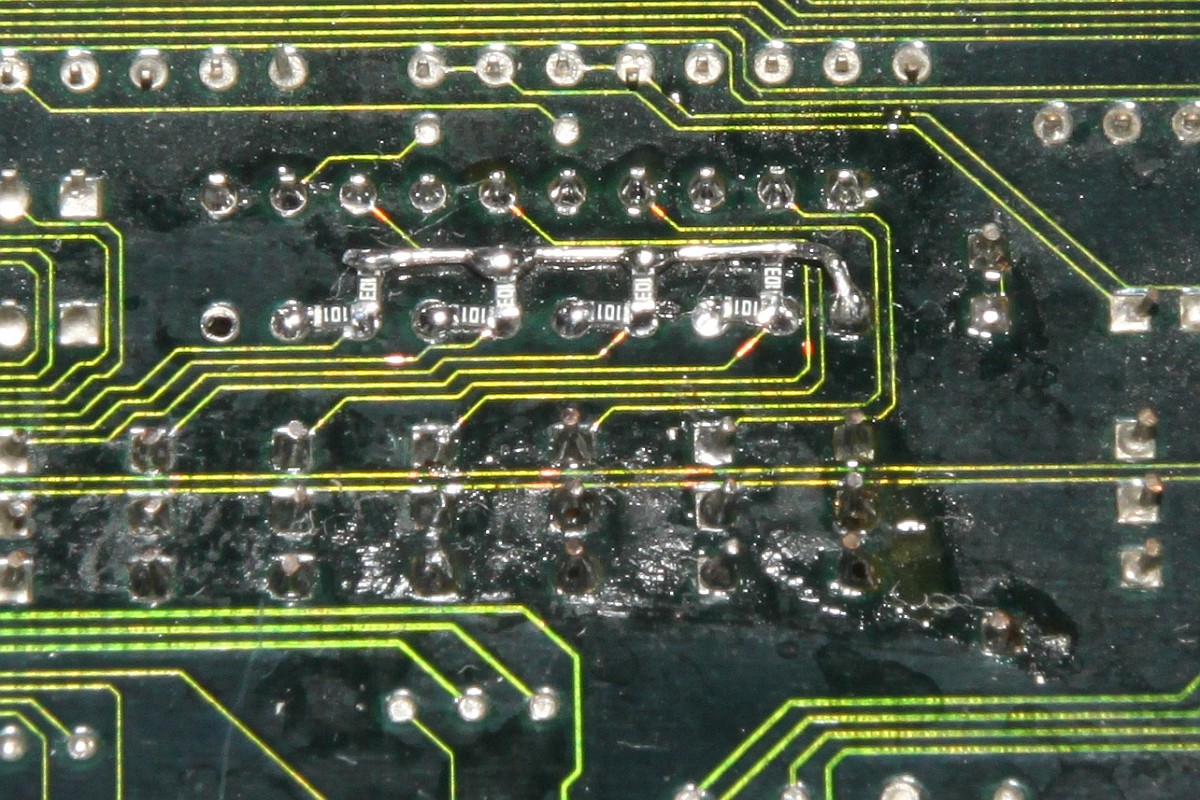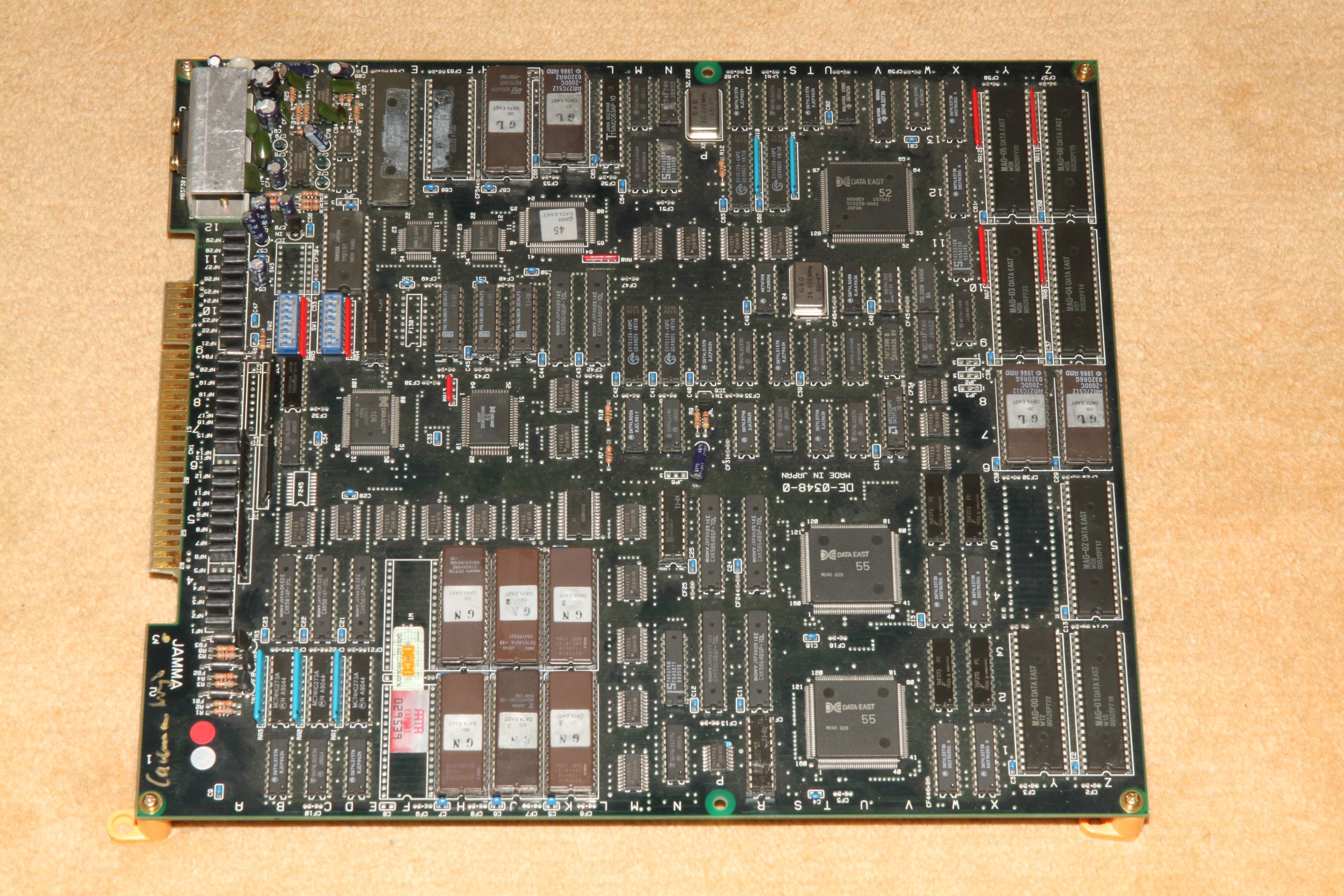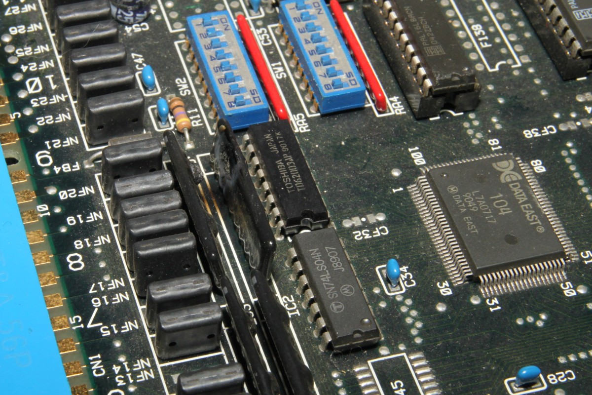 {Data East Caveman Ninja} Mal wieder eine Reparatur, bei der eindeutig ist, warum sie nötig wurde. Caveman Ninja von Data East - ein wüstes Custom-Grab. Angeblich funktionieren Button 1 und Button 2 nur gemeinsam, also der Caveman springt immer beim Schießen... Die elektronische Inspektion ergibt ein Signal bei beiden Knöpfen, egal, was man drückt... Die optische Inspektion ergibt Kohlenstoff und Ruß, wo er nicht hingehört. Das passiert immer genau dann, wenn man bei diesen PCBs den JAMMA-Stecker verkehrt herum aufsteckt! Dan ballern die 12V für den Audio-Amp auf die Button-Kanäle... Meist reißt es dann den Custom 104 mit, der blockiert zuweilen dann auch den CPU-Datenbus... Erstmal die Leiche ausgelötet - Ersatz hab ich leider keinen. Bei den funktionierenden kommt aber auch blos Low raus, wenn man den Eingang gegen Masse brückt... Vermutlich ein Pullup mit Filter, ggf. mit Transistor - Egal... Ich probiere einfach mal die einfache Variante: 100 Ohm als Strombegrenzung Richtung 104 und einen 10k Pullup am Eingang. Versuch macht kluch! Und was soll ich sagen? Es funktioniert! {DATA EAST RCDM-I107} Weil ich immer alles genau wissen will: Heißluftfön auf 220°C, feiner Uhrmacherschraubendreher und der Lack geht prima ab! Von beiden Seiten... Die SMD Teile unter dem Mikroskop - Kennung A5 ist unmissverständlich... Duale schnelle Schutzdiode - alles was hier über 5,6V ist, fließt gegen +5V ab... Da kommt bei 12V ganz schön was an Strom raus... Das ist der Schaltplan - ich lag als gar nicht so falsch. Funktioniert natürlich auch ohne Kondensatoren und Schutzdioden. |