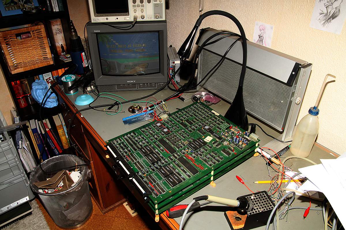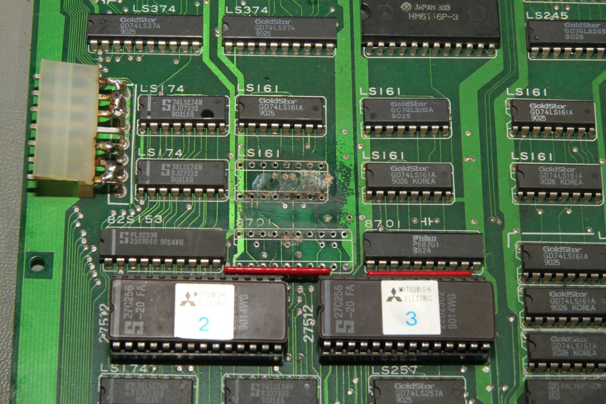 {Outrun Bootleg} Wieder mal - ich konnte mich nicht verschließen, zumal ich noch zwei Bootleg Leichen hier irgendwo rumliegen habe... Diese Platine ist eine der reparaturunfreundlichsten, die ich je hatte - 3 Lagen Monsterplatten, verbunden über Flachbandleitungen aber mit separaten Spannungsversorgungsleitungen. Kaum sinnvoll aufgeklappt in Betrieb zu nehmen... Hier mal die oberste Platine: Mein OP-Tisch: Diese hier hat ein interessanten Grafikproblem: der Untergrund wird meist (aber nicht immer... ) als Zebrastreifen dargestellt... hat das schon mal wer von euch behoben? Zeitweilig ist es mal kurz gut... Dann wieder wie vorher: Zebrastreifen, wohin das Auge blickt! Endlich habe ich die zwei defekten Bootlegs aus meiner Schrottsammlung gefunden - hoffentlich bringt ein Kreuztausch der Platinen eine Besserung! {Reparatur} Endlich dazu gekommen: die erste Schrottplatine (CPU-PCB) hat es gebracht: die Straßen und Felder sind wieder da! Sieht gut aus: Sieht richtig gut aus: Ach, Manno... die PCB hat auch einen Schuss... Keine Rede, kurzer Sinn: die Ersatzplatine hat ein RAM-Problem (Restart), das ist mit Tausch behoben - trotzdem gibt es hier so viele kleine Grafik-Glitches, dass ich das Teil dann doch nicht hernehmen will. Da bleibt mir wohl nichts Anderes übrig, alls die PCB zu reparieren. Erster Schritt: Grafik-RAMs tauschen. Alles neu... Hilft leider nix... Ist ja ätzend: da ist wohl mal was ausgelaufen. Könnte der Grund sein, in den EPROMs daneben werden die Straßengrafikdaten aufbewahrt... Sieht schlimmer aus, als es ist: Putzen, testen, alles O.K.... Gesockelt und TTL getauscht - präventiv... Hilft leider nichts, auch der PLD mit komischen Signalen liefert getauscht nur einen anderen Fehler. Hab Dich, du Sau! Der Philco Custom-Chip PK8701 (sieht gar nicht wie ein Custom aus...) war der Übeltäter - da hätte ich mir den Rest ja sparen können. Kein Absturz mehr, keine Grafikfehler - uff! Ohne Vergleichsplatinen und Teilespender wäre diese Reparatur aber unmöglich gewesen. Den Custom gibt es nicht zu kaufen! |