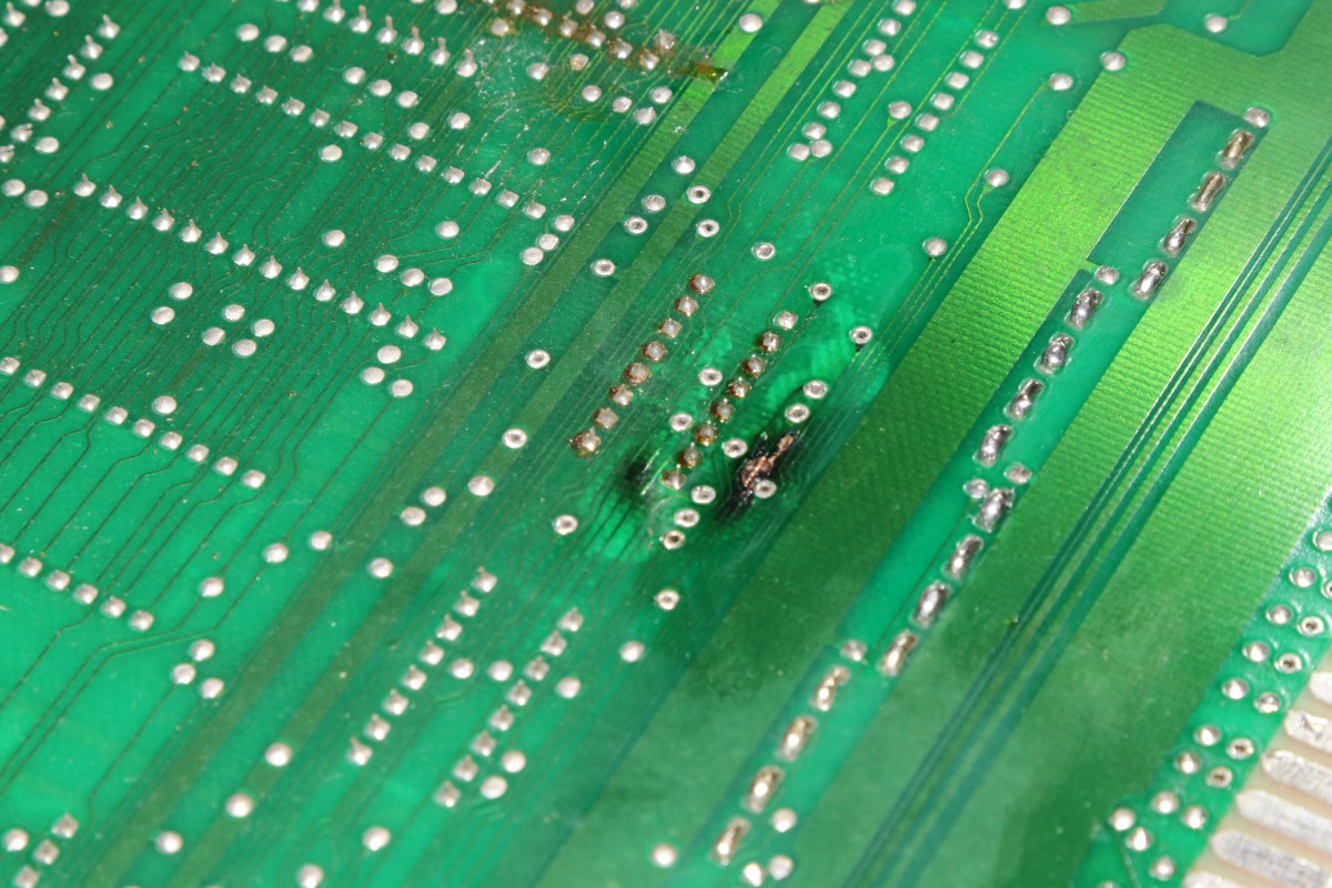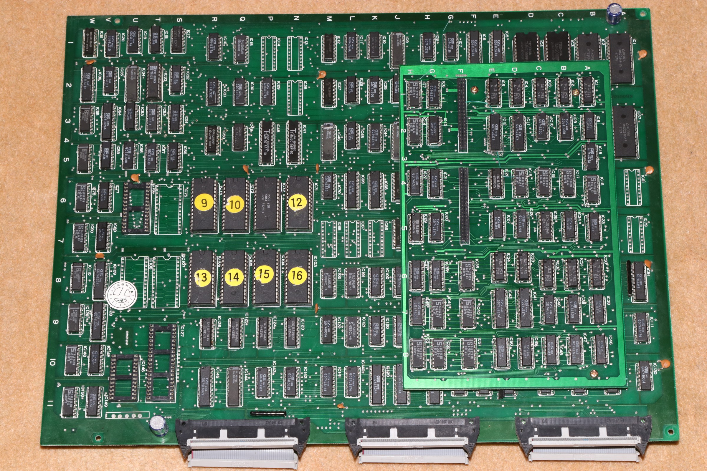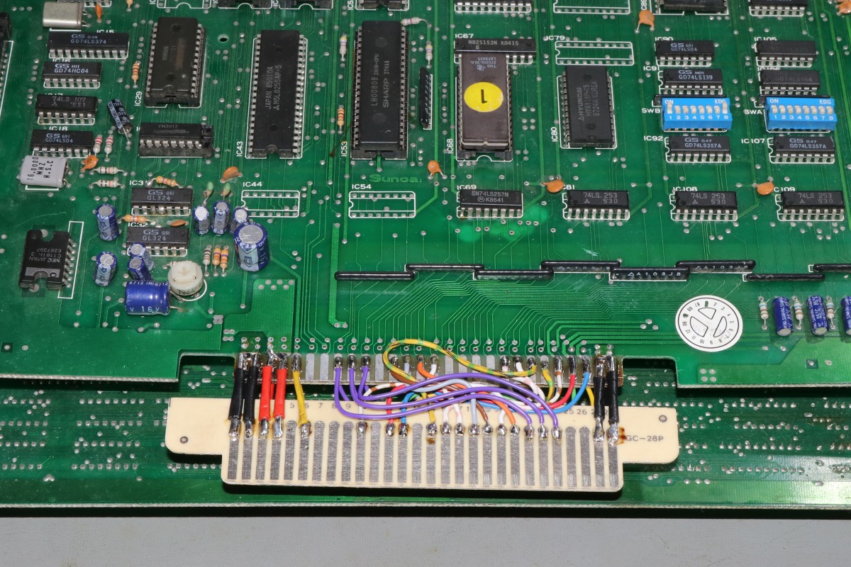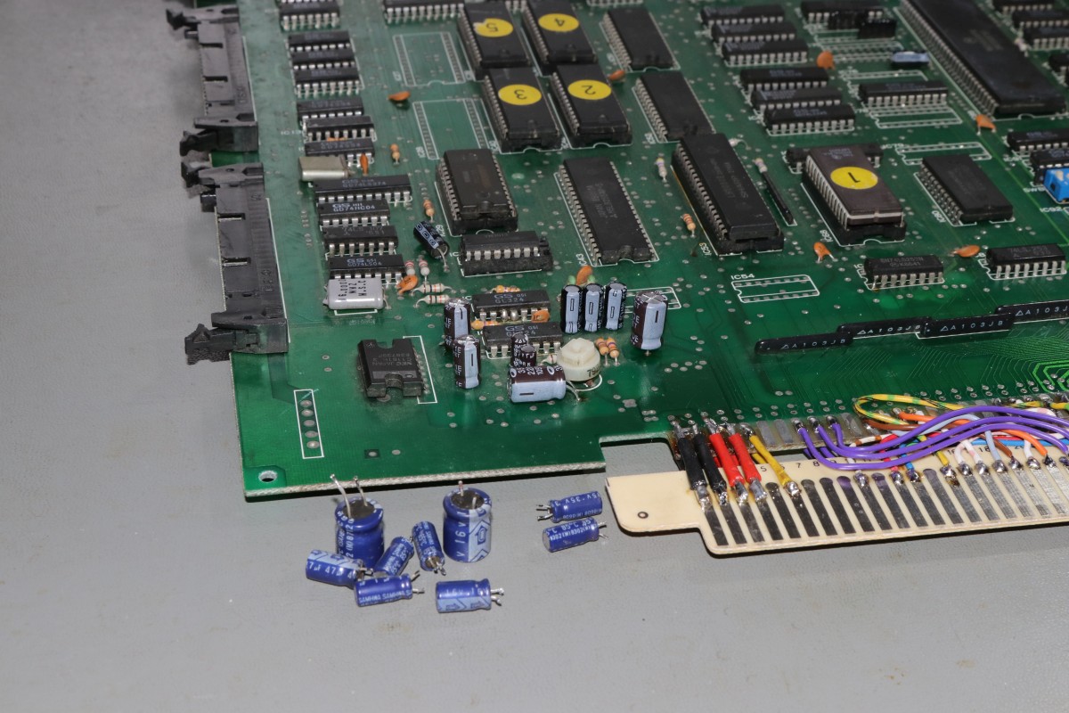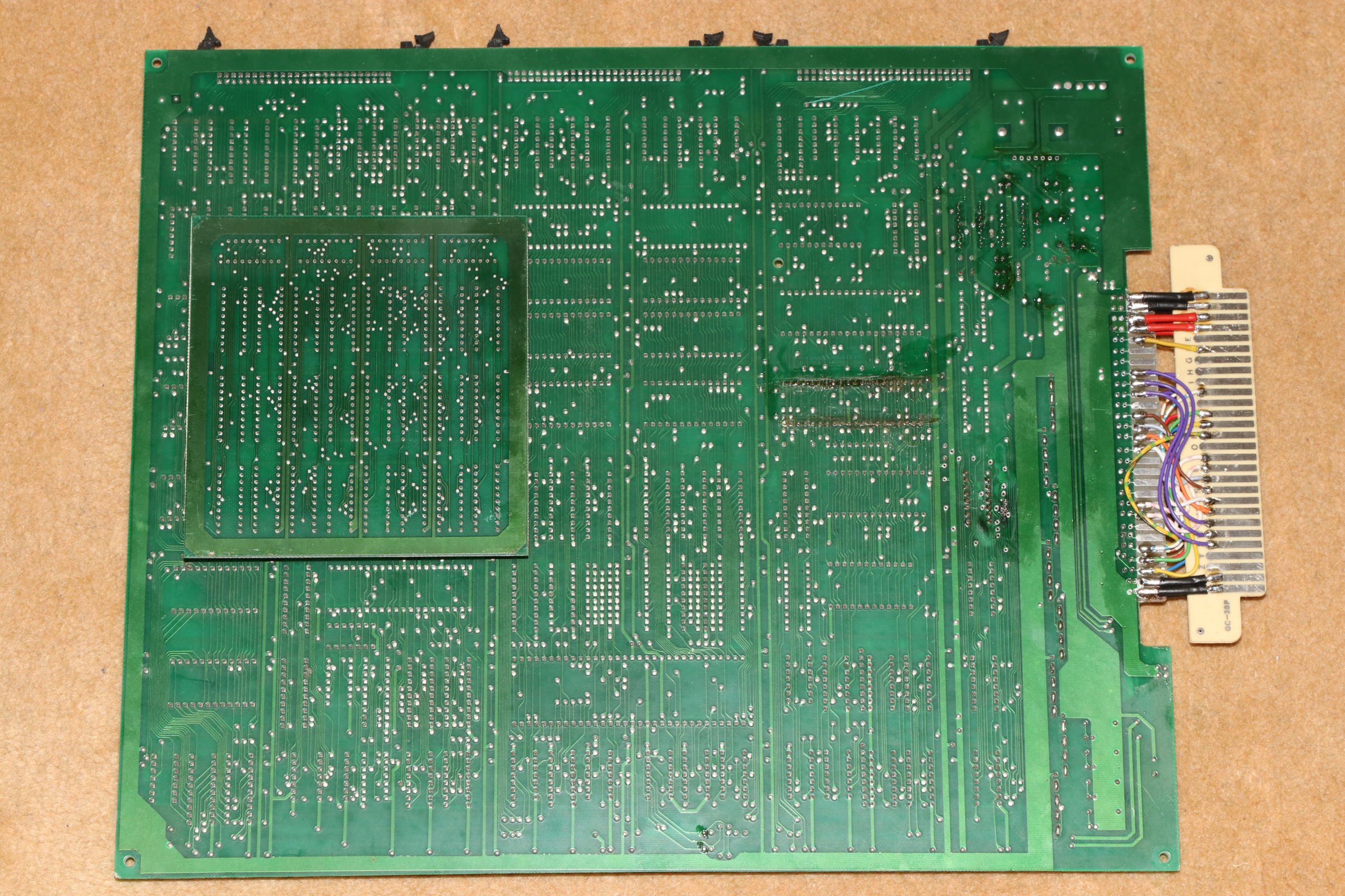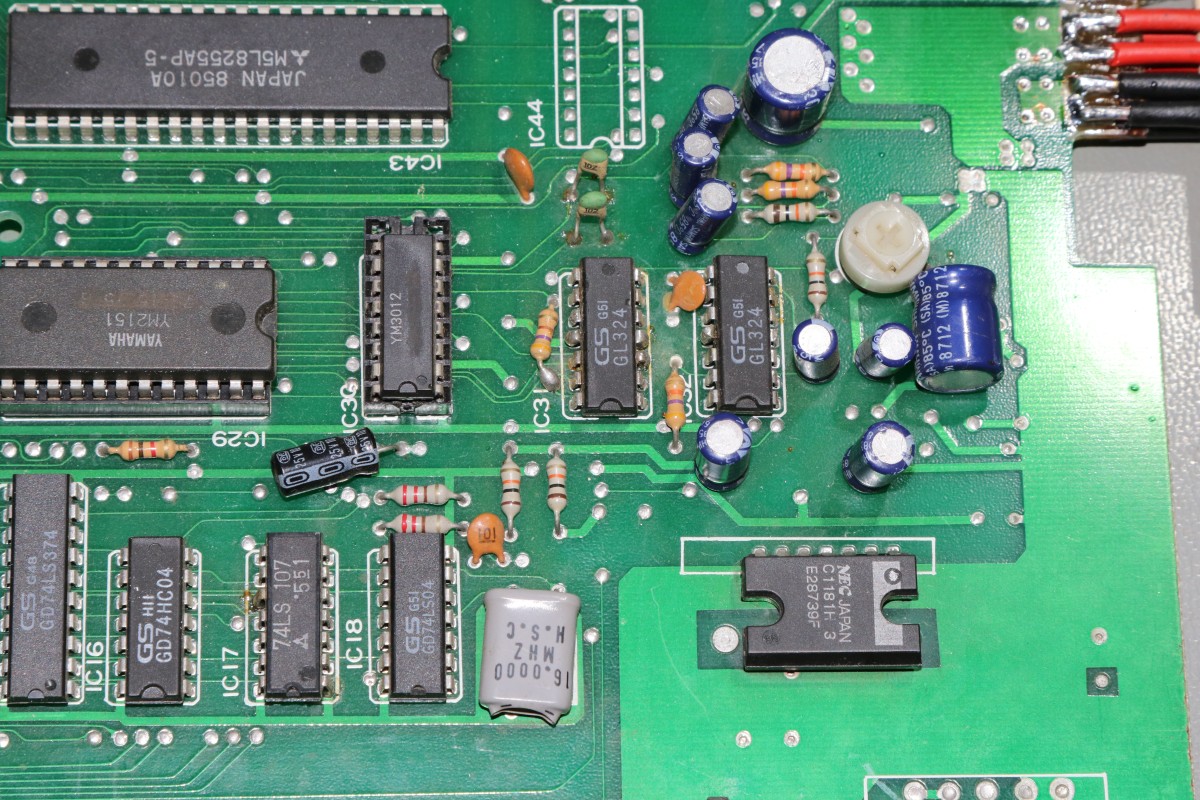 {Shinobi Bootleg} Hier mal ein Vertreter derjenigen Bootlegs, die man nicht haben will. Schlechtes Platinenmaterial, billige Bauteile, haarfeine Leiterbahnen und die Hälfte der Soundbausteine fehlt... Nur das Bild ist ganz passabel... Manchmal verliert man und manchmal gewinnen andere... Bootlegs sind ganz oft Sieger - im Scheiße sein. Das fing schon mal damit an, dass die Platine nach einigen Monaten Lagerzeit nicht mehr starten wollte... Na ja, Quarz abgefault. Keine große Sache. Interessant ist hier, dass die Bildgenerierung unabhängig vom Prozessorquarz läuft! Generationen von Spezialisten haben hier schon rumgebraten... Die Anschlüsse waren eh schon angekokelt und Sega 16 ist halt nicht JAMMA, auch wenn es so aussieht... da mach ich doch gleich einen stationären Adapter und schlage zwei Fliegen mit einer Klappe... Der Sound ist grauenvoll schepperig - also sehe ich mir die ganze Soundsektion an... Ein Elkotausch bringt nichts... sieht trotzdem gut aus... Auch der Tausch des Endverstärkers, der OPAMPs davor, des Stere-DACs , des FM-Bausteins, des 8255 Portbausteins, des Z80 und des EPROMs mit dem Soundprogramm hat nicht die geringste Änderung gebracht... dafür viele Stunden Spaß. Spiel und Spannung... Vielleicht ist dieses Bootleg einfach so scheiße... ich weiß es nicht... Oder es fehlt tatsächlich die Soundsamplebestückung auf der Unterseite... |