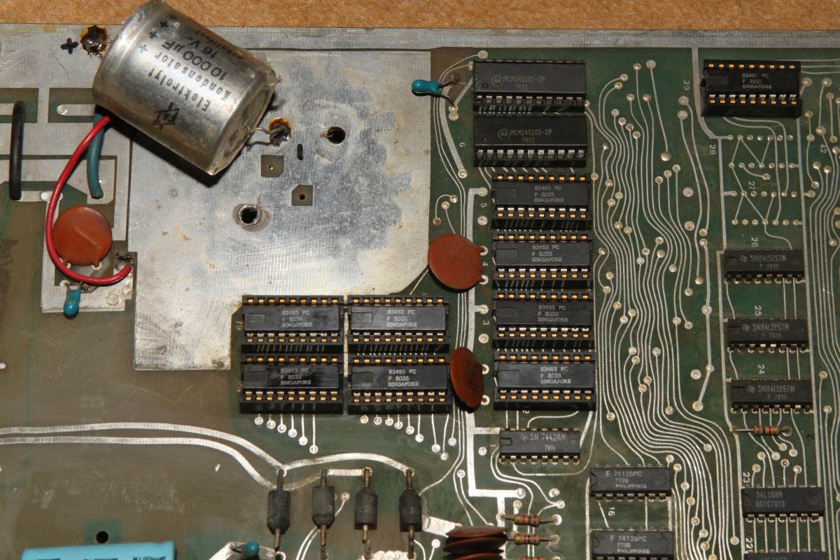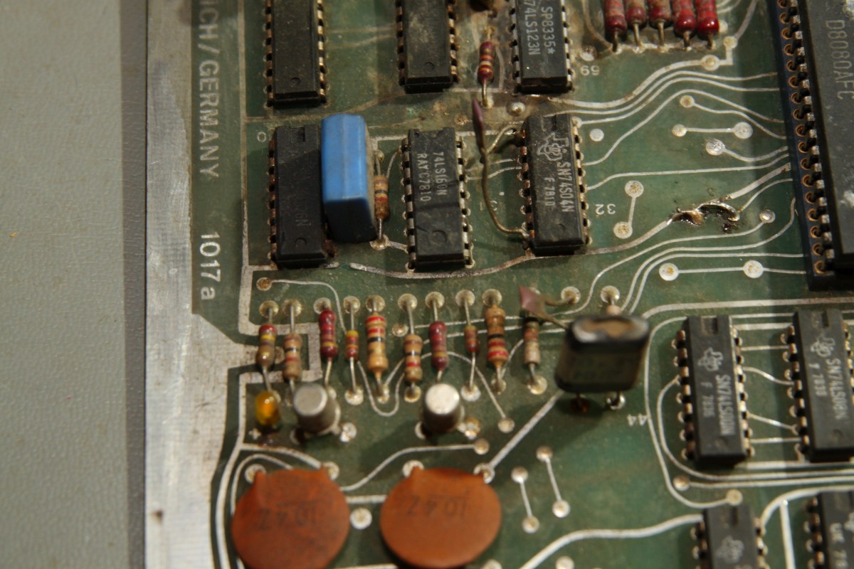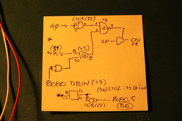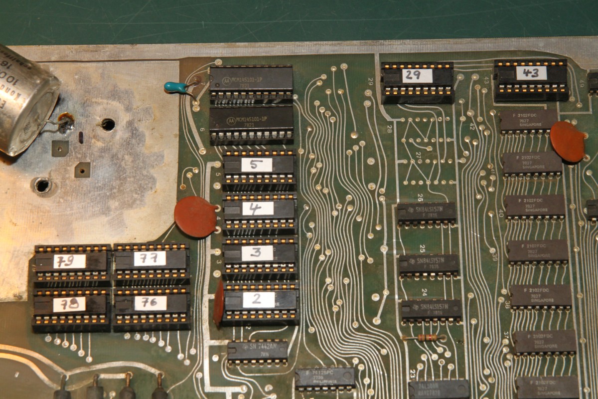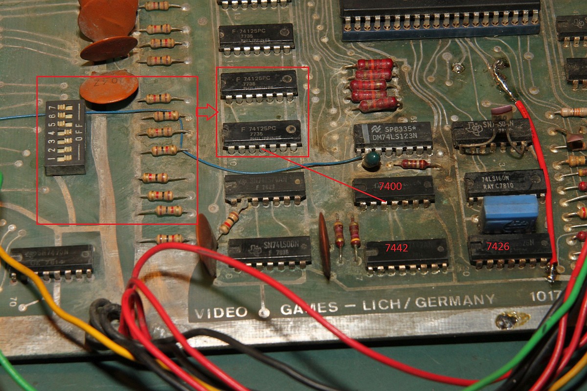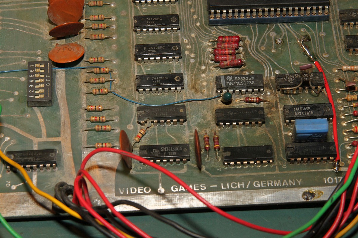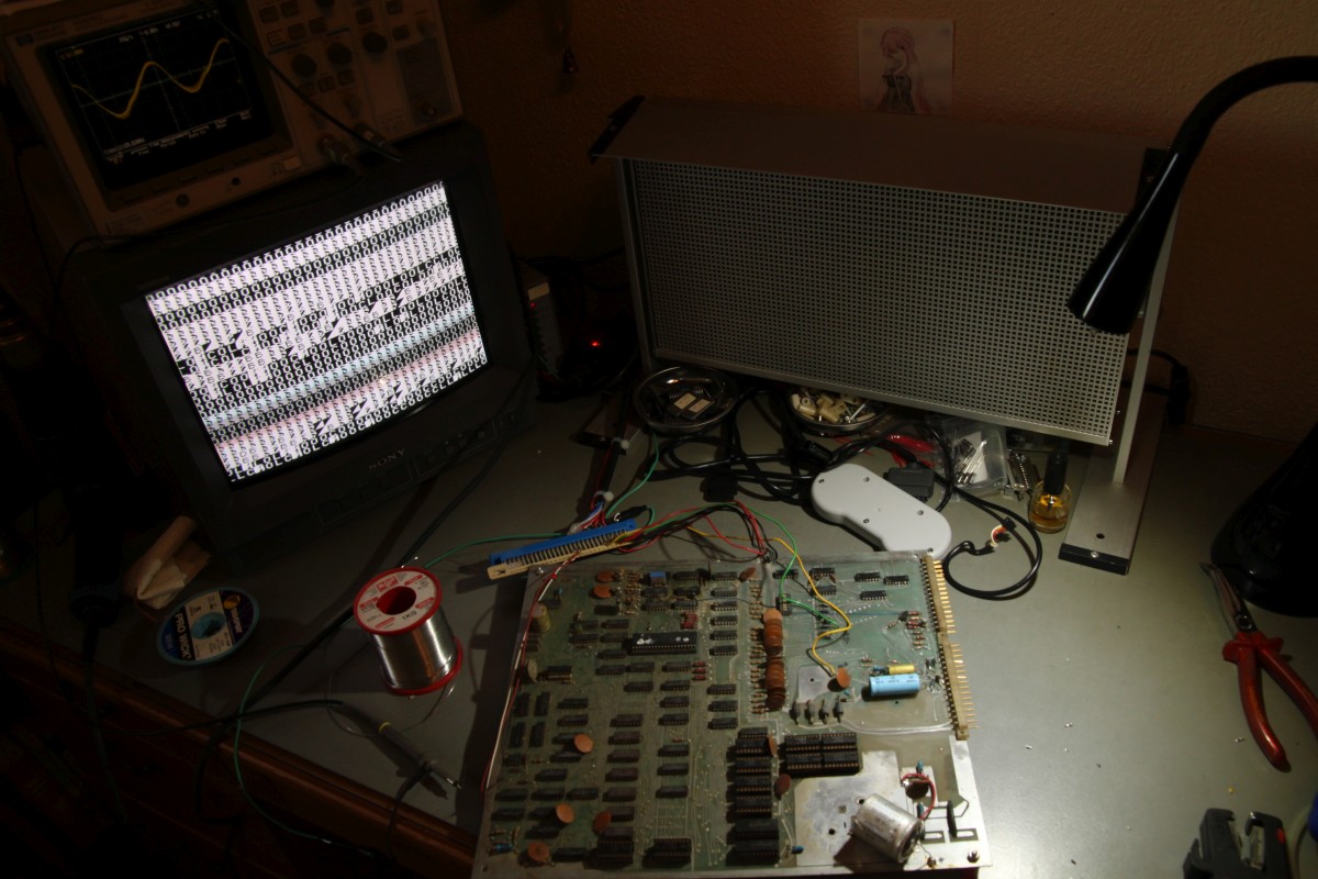 {Lich - eine unbekannte PCB} Von einem ehemaligen Foristo einfach so zugeschickt bekommen: eine Video Games Lich PCB unbekannter Bauart (PCB 1017a) - PROG-RAM: 2xMCM145101 (µPD5101) - CPU: 8080 - Video RAM: 7x2102 1kx1 - Die ROMs sind bipolare PROMs... F93453 = 82S137 (1kx4) - GFX: 29+43 - PRG: 2H+3L / 4H+5L / 76H+78L / 77H+79L. Ein völlig irrer Quarztakt: 20.79 MHz... Anschlüsse über Steckerleisten, Video in S/W... cool alt. Bauteile Codes zwischen 1978 und 1980... Beim Messen schon gleich mal eine Leiterbahn verglüht - egal, sowas hält mich nicht auf... Ein schönes Monster - eigentlich ist nicht viel drauf. Auflösung 2400px... auf Klick! Die Programm-ROMs: Da alle ROMs unbeschriftet waren, hab ich sie erst mal markiert - sonst geht hinterher gar nix mehr... Die IC-Nummern stehen aud der Platine, ganz klein... Eines der Probleme bei 8080-Systemen ist das unsägliche Verhalten bei Reset... wenn da was nicht stimmt, dreht die CPU hohl und macht irgendwas, nur nicht das Richtige. Zwischenzeitlich konnte ich dann sogar mal ein rudimentäres Programmverhalten rauskitzeln... scheint kein spannendes Spiel zu sein.... Die ROMs sind schon mal gedumpt und an MAME geschickt... vielleicht können die Jungs was damit anfangen! Dazu muss ich mir den Aufbau der PCB genau zu Gemüte führen - ohne Schaltplan nicht ganz trivial. Hier die Signalkette DIP-Schalter -> Buffer -> CPU: Hier das dazu gehörige Enable-Signal... Das MAME Team hat die ROMs zum Laufen gebracht: es handelt sich um Video 21, von dem bisher nur ein Satz Flyer bekannt war: Die Emulation hat geschafft, was mir bis jetzt noch nicht gelungen ist: das Spiel läuft! {LICH VIDEO 21 - ROMs} Wen es interessiert: hier sind die ausgelesenen bipolaren PROMs mit Grafik- und Programmcode:
