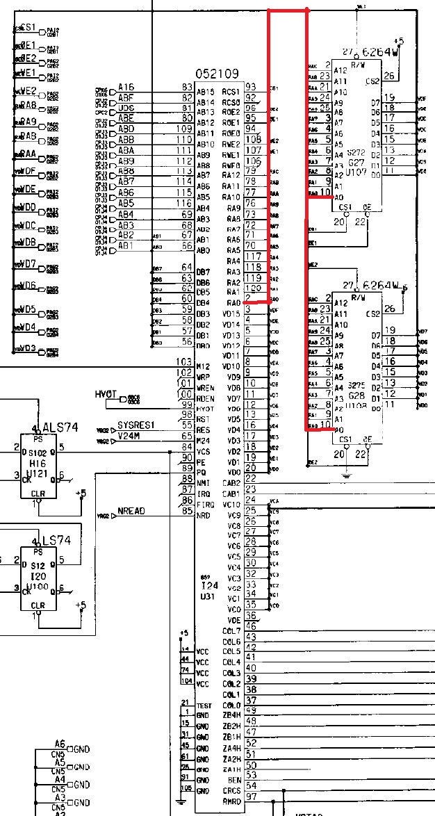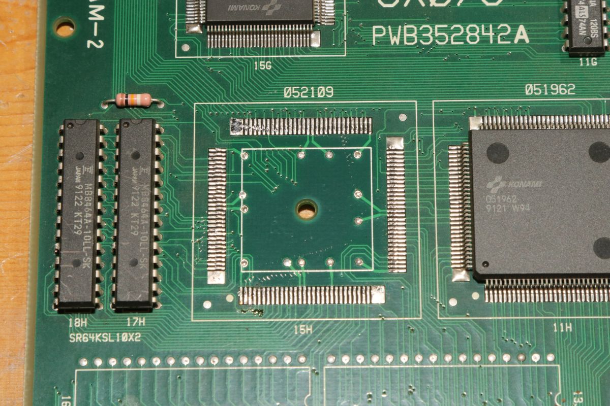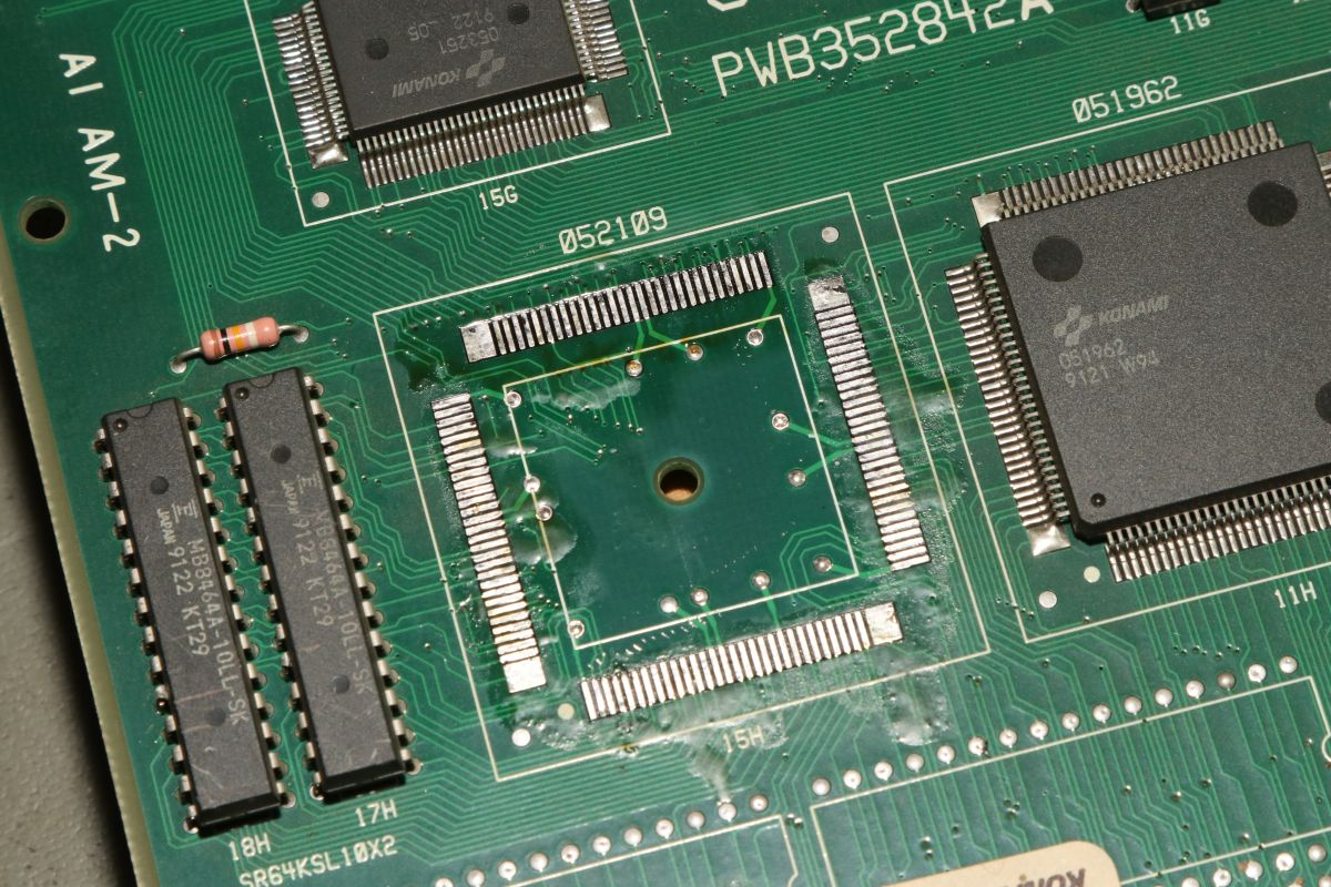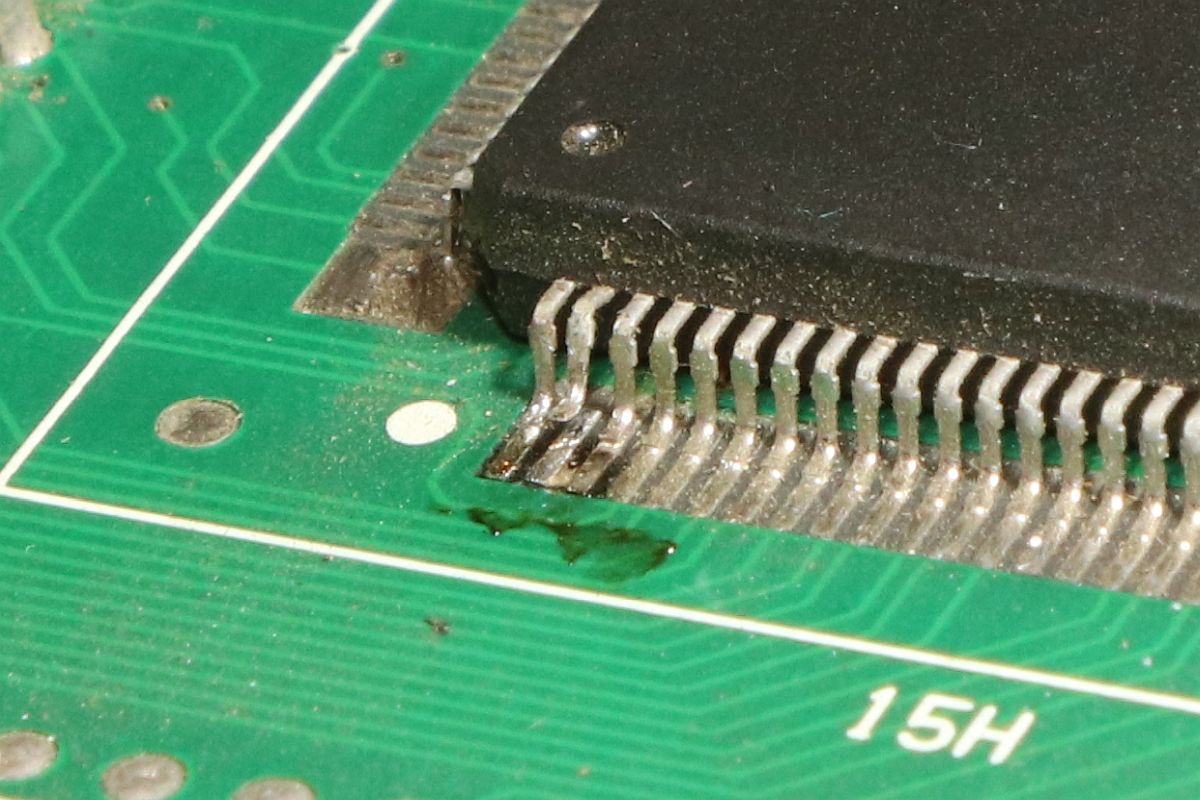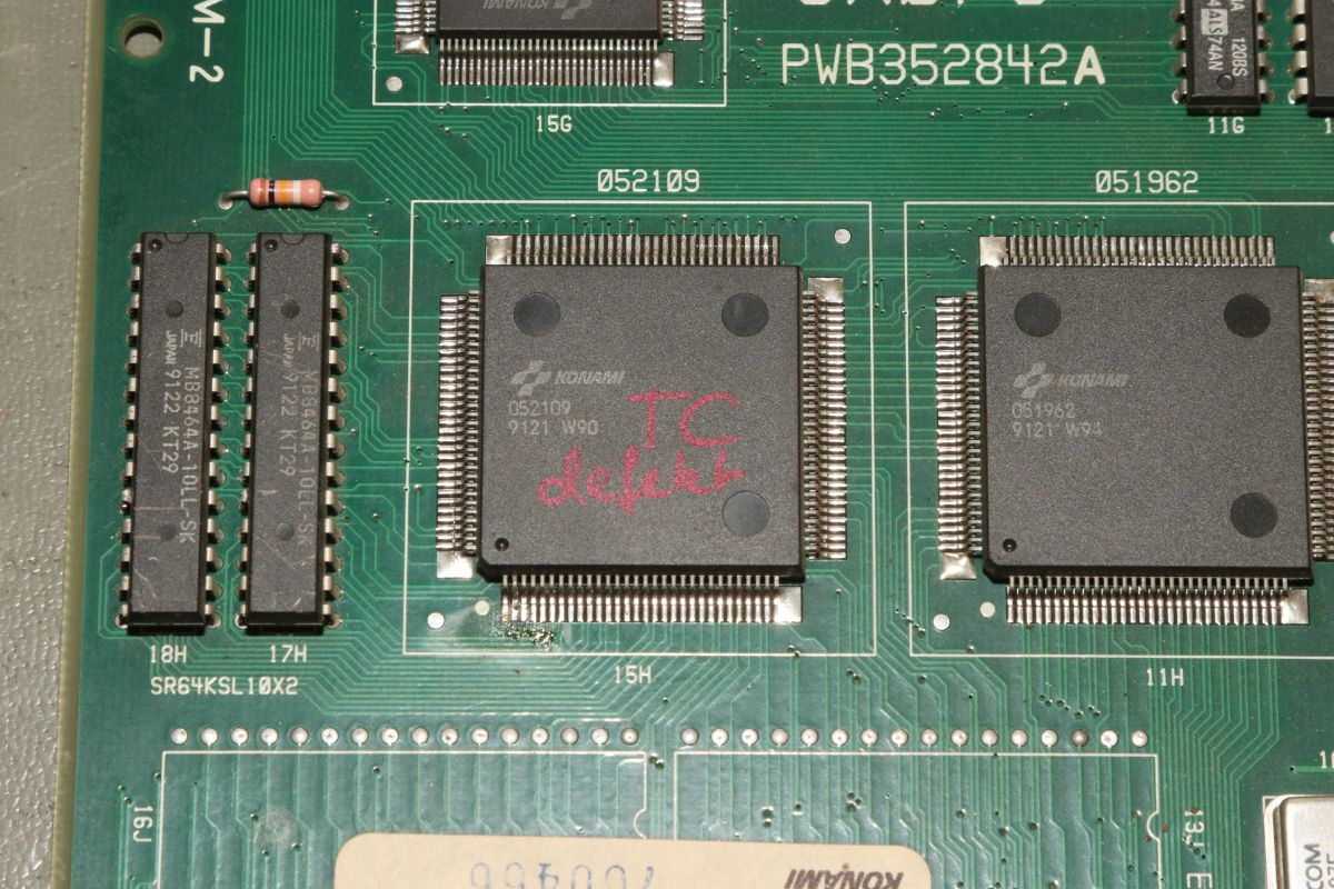 {Thunder Cross II} Ich mag es, wenn Spiele eindeutige Fehlermeldungen geben... hier mal eine Konami Thunder Cross II Platine: OK, so ganz eindeutig ist das jetzt nicht... die Platine stottert... Um genau herauszufinden, was mir die Testroutine sagen möchte, suche ich mal einen Reparaturbericht aus dem Internet... So sieht das aus, wenn die Platine noch keinen Logopäden braucht: Folglich sind also RAM 17H und 18H suspekt. Da kann man schon mal gezielt suchen und siehe da - Adressbit A0 ist stuck high. Das erklärt die Doppelung der Textzeichen. Die beiden RAMs hängen ausschließlich am Konami Custom 052109. Ein Durchzwicken des Adresspins am RAM zeigt, dass die RAMs selber nicht die Fehlerquelle sind. Ich befürchte einen Defekt im Custom - die Adressleitung hat immerhin nur noch 2,7 Ohm gegen +5V. Ich lifte mal das Beinchen 2... Yepp... der Custom ist hin. Den gibt es leider nicht mehr im Konami-Fachhandel. Aber ich habe zeitgleich eine Parodius mit zur Reparatur bekommen, die völlig defekt ist... vielleicht haben wir ja Glück. Der Custom hier muss raus - dafür ist der Heißluftfön gut... ...entfernt... ...geputzt... Die Parodius wird einer sinnvollen Zweitverwertung zugeführt: Dann wird der Custom unter dem Stereomikroskop sauber ausgerichtet und Pin für Pin vorsichtig wieder verlötet. Das dauert seine Zeit... ...lohnt sich aber... Ein gutes Ballerspiel lebt wieder! Gerade bei Spielen mit Unmengen an Custom Chips ist es gut, diverse Leichen zum Schlachten griffbereit zu haben! |