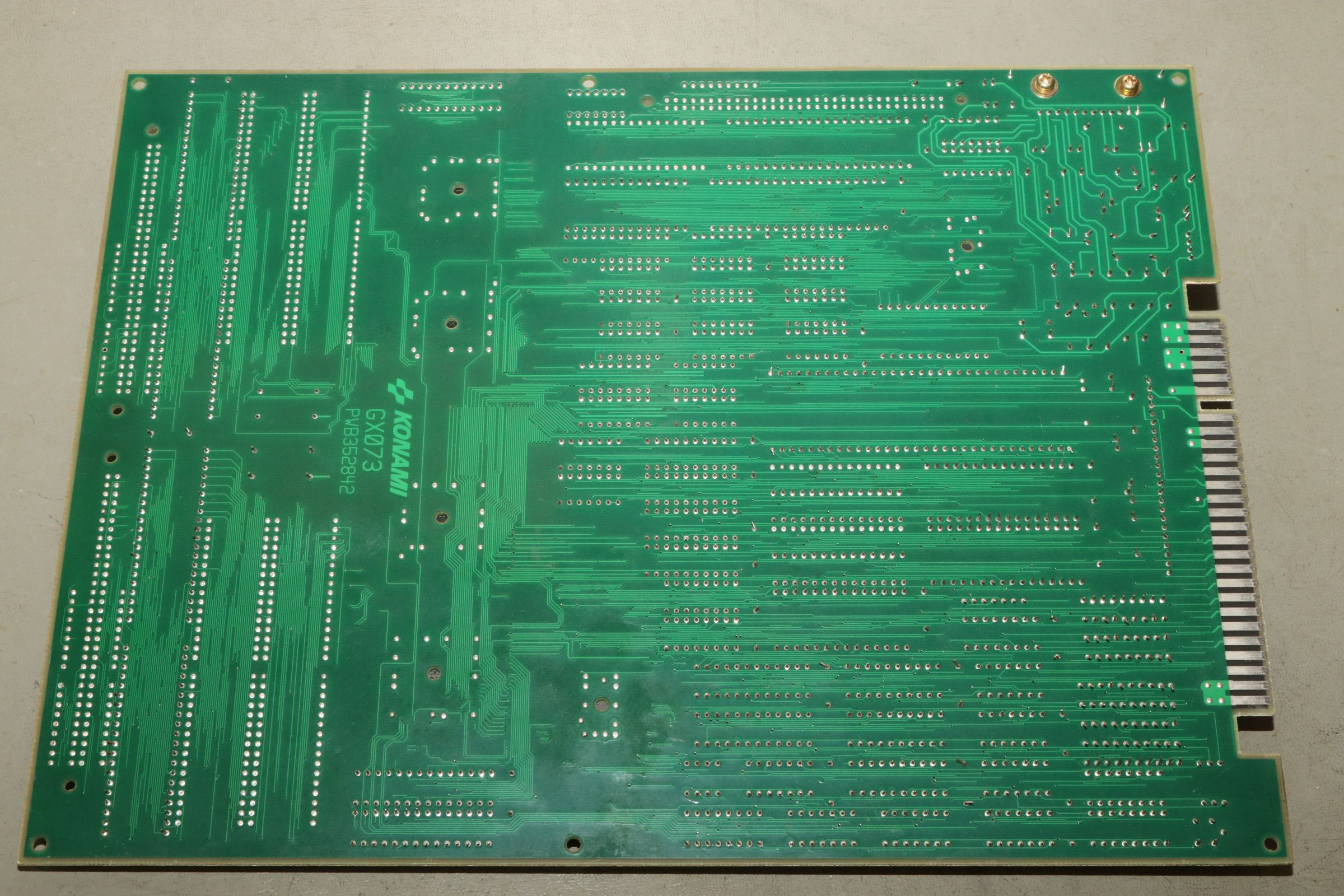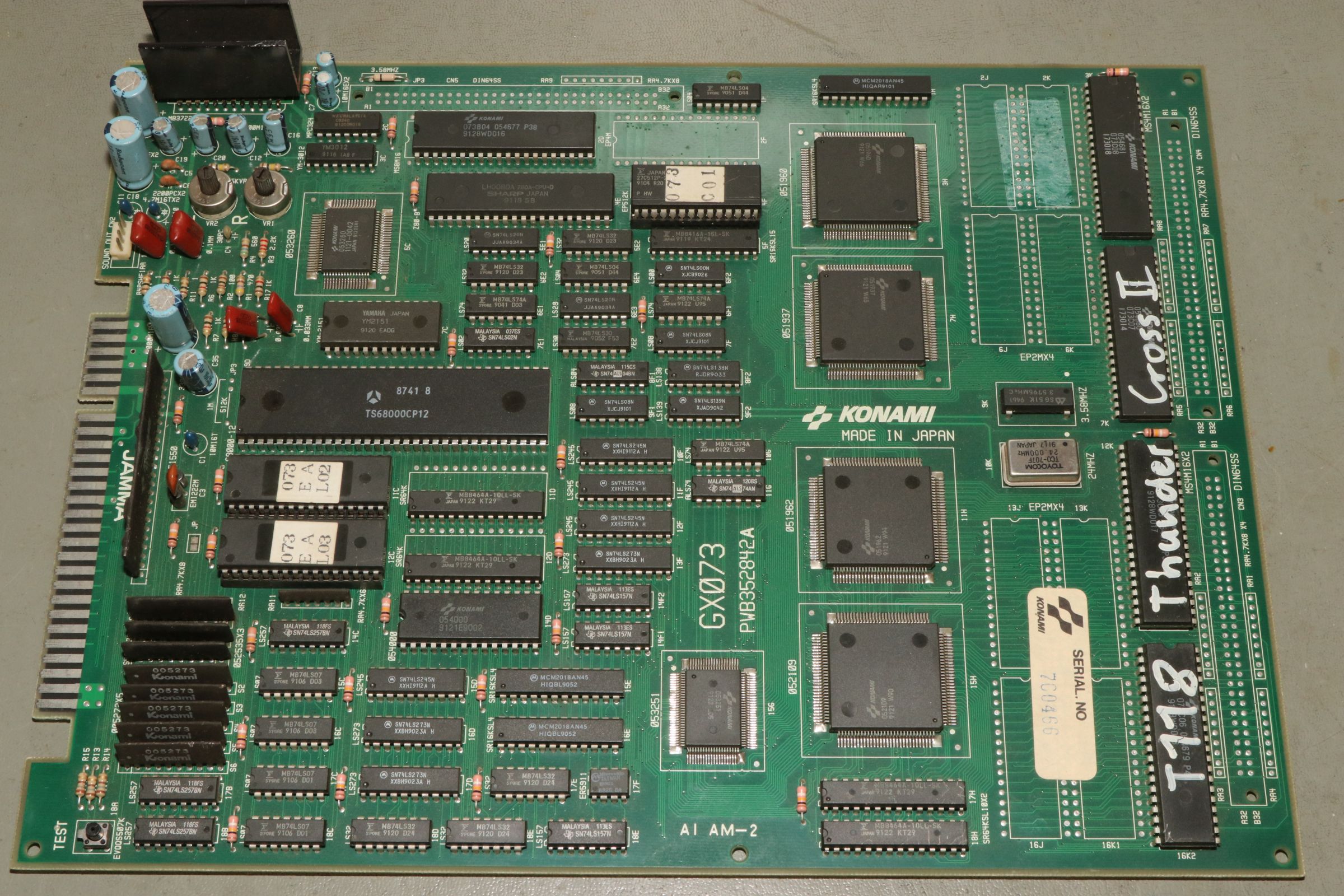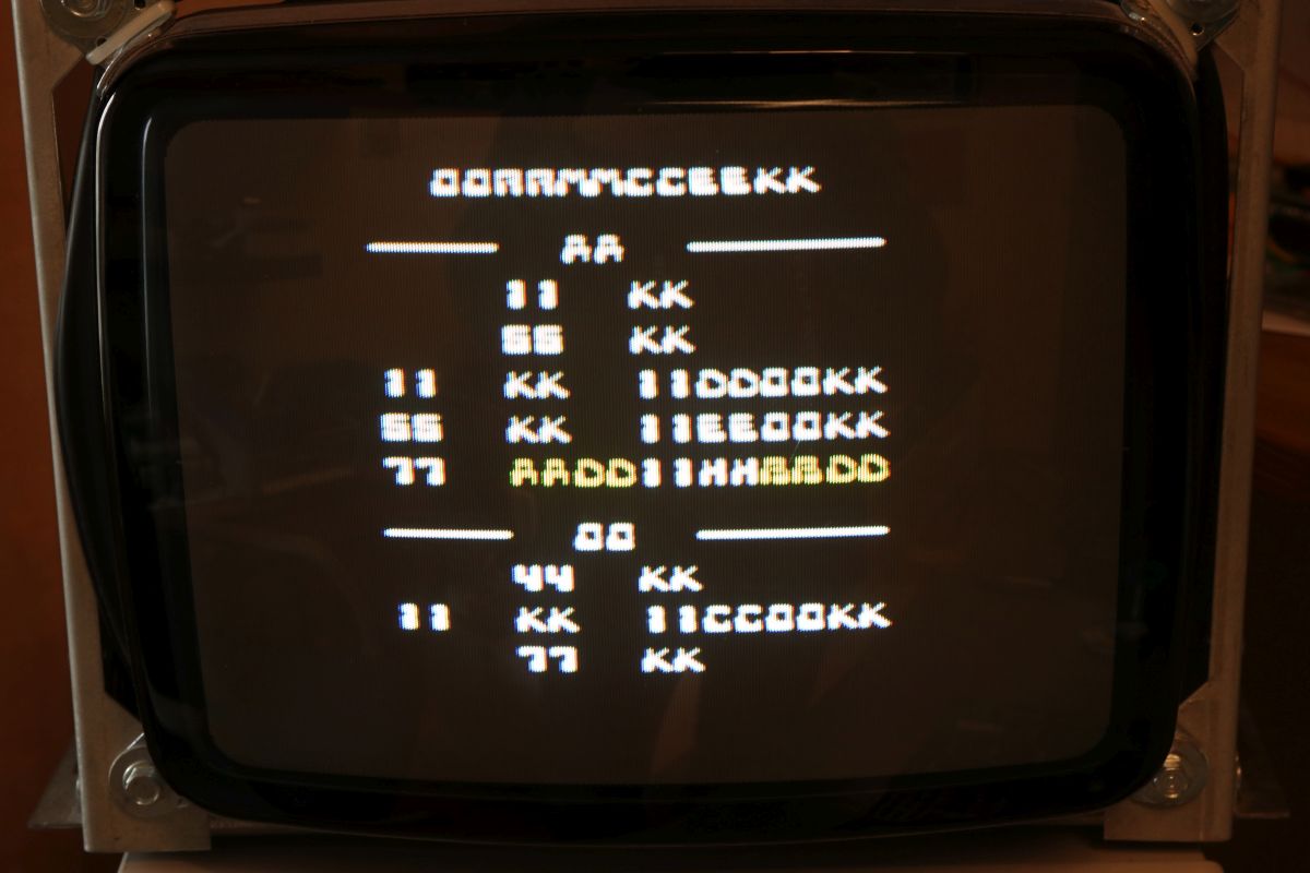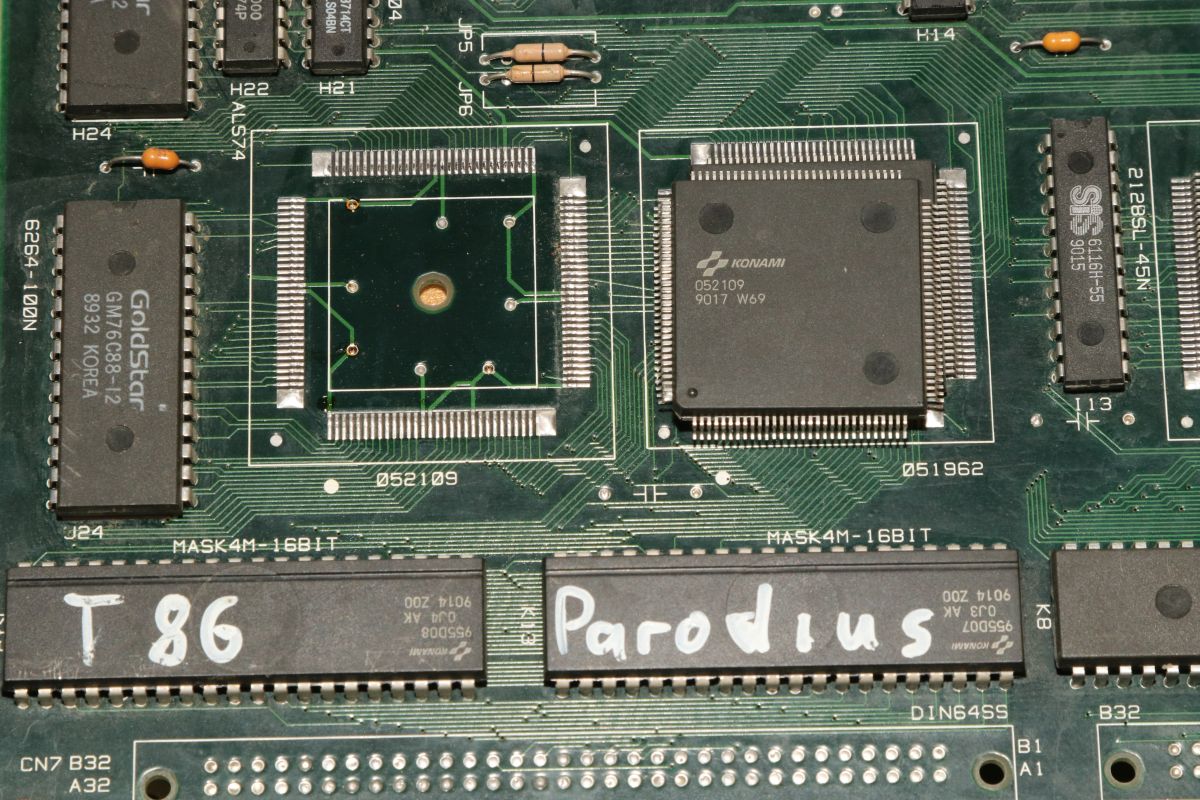 {Thunder Cross II} Ich mag es, wenn Spiele eindeutige Fehlermeldungen geben... hier mal eine Konami Thunder Cross II Platine: OK, so ganz eindeutig ist das jetzt nicht... die Platine stottert... Um genau herauszufinden, was mir die Testroutine sagen möchte, suche ich mal einen Reparaturbericht aus dem Internet... So sieht das aus, wenn die Platine noch keinen Logopäden braucht: Folglich sind also RAM 17H und 18H suspekt. Da kann man schon mal gezielt suchen und siehe da - Adressbit A0 ist stuck high. Das erklärt die Doppelung der Textzeichen. Die beiden RAMs hängen ausschließlich am Konami Custom 052109. Ein Durchzwicken des Adresspins am RAM zeigt, dass die RAMs selber nicht die Fehlerquelle sind. Ich befürchte einen Defekt im Custom - die Adressleitung hat immerhin nur noch 2,7 Ohm gegen +5V. Ich lifte mal das Beinchen 2... Yepp... der Custom ist hin. Den gibt es leider nicht mehr im Konami-Fachhandel. Aber ich habe zeitgleich eine Parodius mit zur Reparatur bekommen, die völlig defekt ist... vielleicht haben wir ja Glück. Der Custom hier muss raus - dafür ist der Heißluftfön gut... ...entfernt... ...geputzt... Die Parodius wird einer sinnvollen Zweitverwertung zugeführt: Dann wird der Custom unter dem Stereomikroskop sauber ausgerichtet und Pin für Pin vorsichtig wieder verlötet. Das dauert seine Zeit... ...lohnt sich aber... Ein gutes Ballerspiel lebt wieder! Gerade bei Spielen mit Unmengen an Custom Chips ist es gut, diverse Leichen zum Schlachten griffbereit zu haben! |
