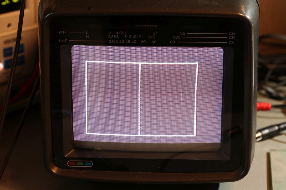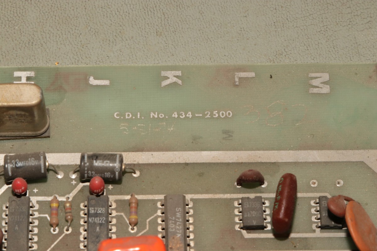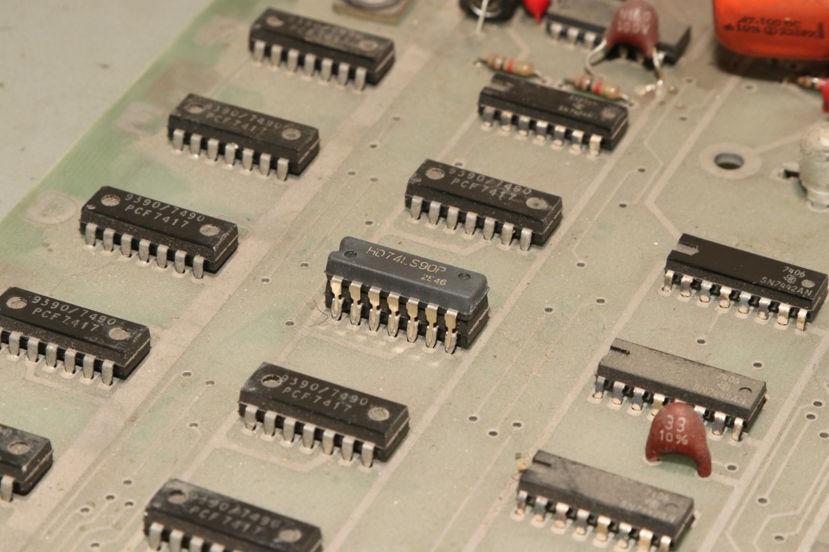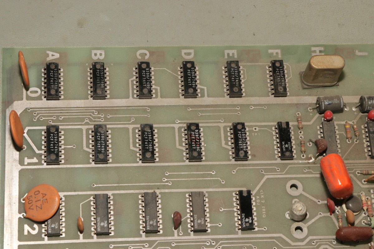 {T.V. Goalee von Chicago Coin (Chicago Dynamic Industries)} Der Werbetext verspricht ein hyperrealistisches Spielerlebnis - und ja, das Design dieses Spielautomaten von 1974 ist außergewöhnlich. Hier hat man sich echt Mühe gegeben, das Spielgeschehen wie ein echtes Fußbalfeld aussehen zu lassen! Die Chicago Skyline im Hintergrund und kleine Bäumchen am Spielfeldrand... Dann kamen die Limitierungen der damaligen Digitaltechnik... Dieses Spiel zählt noch zur Generation der "Discrete Electronics", der Spiele ohne Prozessor und ohne Programmspeicher. Obwohl, auch ein 7474 ist als Flipflop ja ein Speicher... Nur ein unscheinbares Kürzel weist auf den Hersteller hin: Ein Schaltplan für dieses Spiel existiert nicht, so muss ich mich Schritt für Schritt, IC für IC durch die Platine arbeiten. Als Erstes reichen mal separat eingespeiste 5V, um die TTLs zur Mitarbeit zu bewegen. Der Systemtakt liegt an. Ein Videobild gibt es nicht. Aber immerhin sind Hsync und Vsync da... Der Informationsgehalt des Videosignals (S/W, BAS) ist überschaubar. Gleich nach dem Quarz und dem üblichen 7404 als Taktgenerator kommt eine Batterie aus 7490 Dezimalzählerbausteinen. Die machen üblicher Weise die ganzen Horizontal- und Vertikal-Zählimpulse. Zwei davon sind taub. So sieht es dann aus, wenn alle mitzählen. Zahlreiche Zähler... ... zählen Zeilen. Immerhin: die Funktion ist schon umfangreicher geworden. Wir haben ein Spielfeld. Der Realismus ist kaum noch zu steigern. Fortsetzung folgt! |