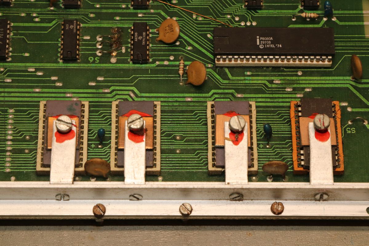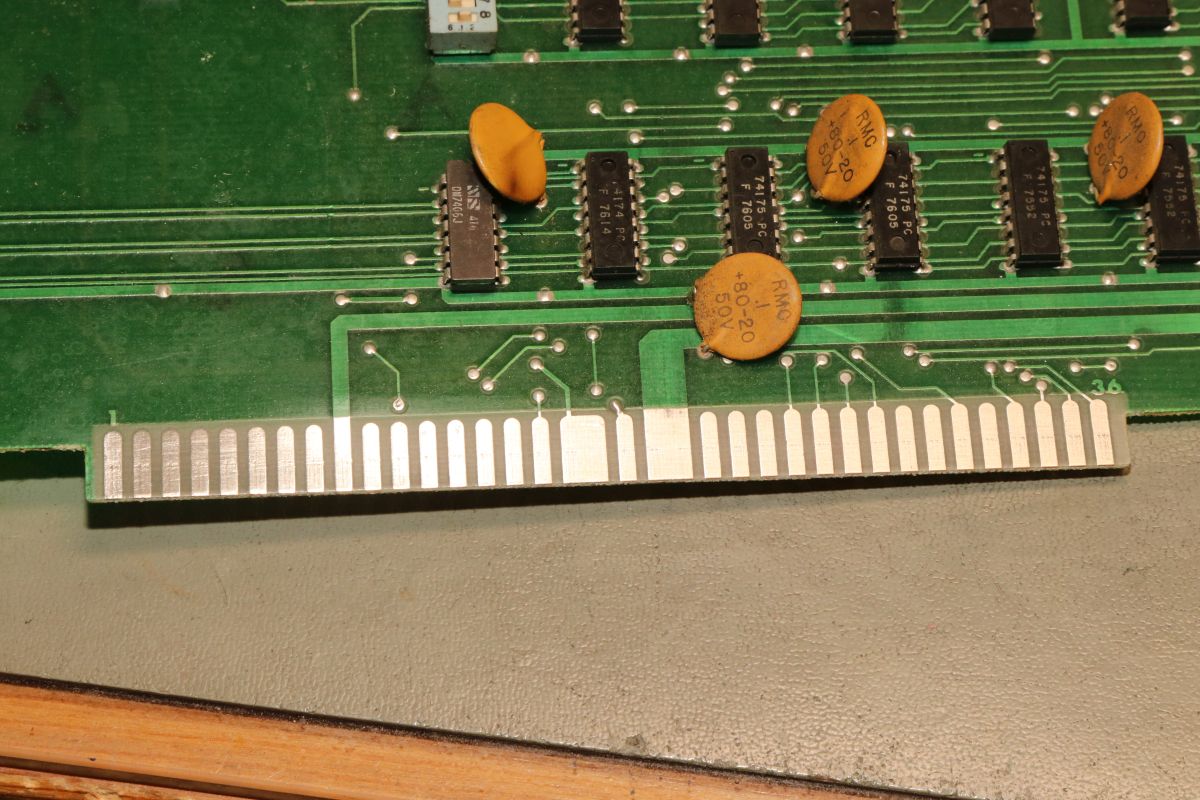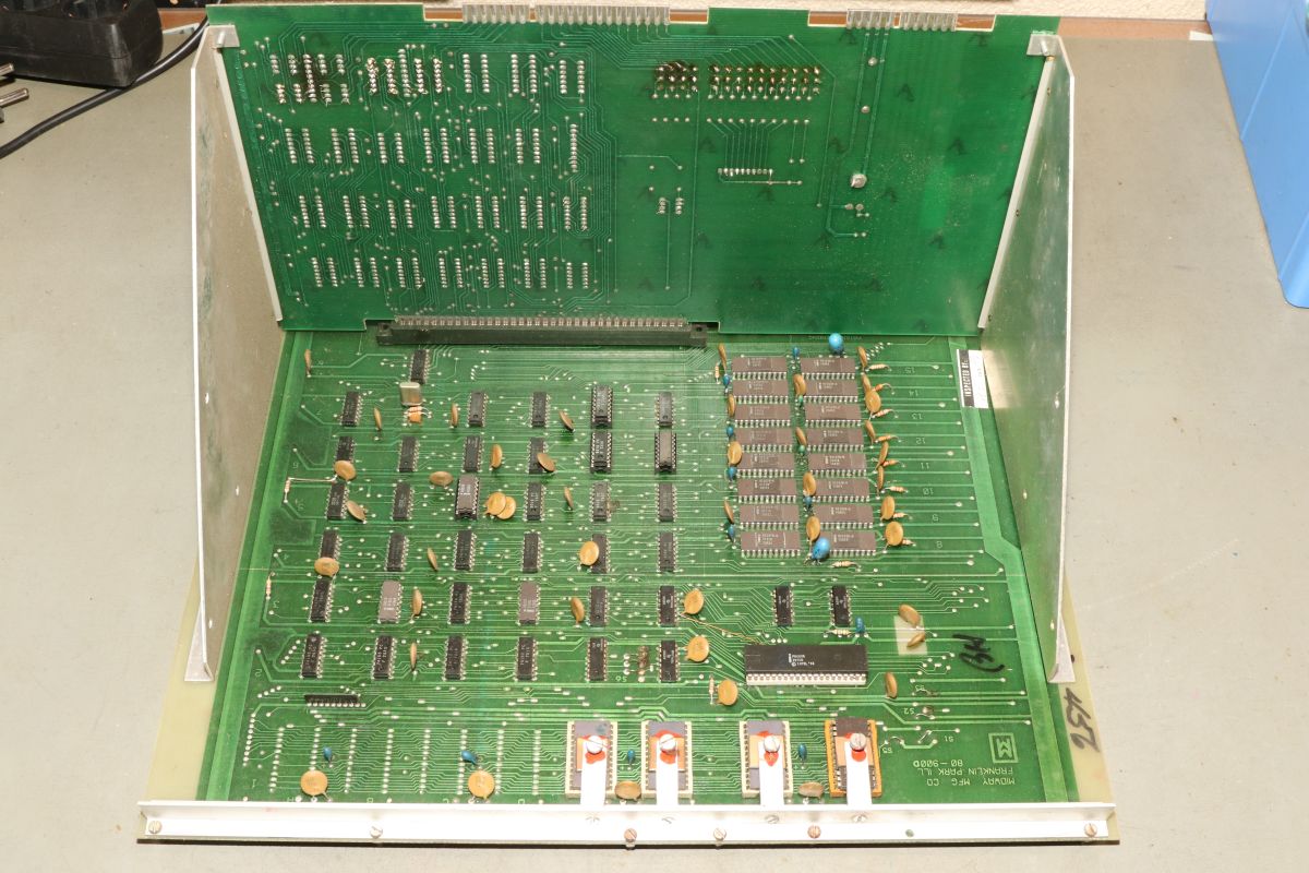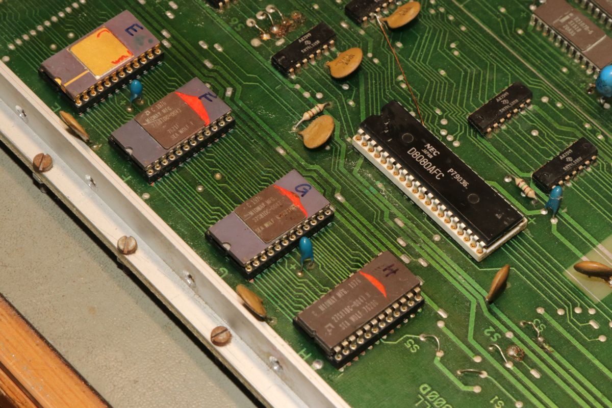 {Midway Sea Wolf} Auf meinem Labortisch landete wieder eine Midway Sea Wolf. Space Invaders Hardware und eigene Zusatzplatine mit I/O und diskreten Schieberegistern auf der senkrechten Platine. Ein vollständiger Test ist ohne Automat kaum möglich, aber hier startet das Spiel schon mal nicht richtig. Das Programm steckt hier in vier bipolaren PROMs mit je 1kx8. Weil die Dinger gut heiß werden, hat sich mal jemand sinnvolle Gedanken zur Kühlung gemacht. Außerdem halten die Teile so ganz gut in den Sockeln Der Programm- und Bildschirmspeicher steckt in Intel 2107 - 4k x 1 dynamische RAMs. Der Rechenknecht: Intel 8080. Auf der senkrechten Platine sind auch noch Logikbereiche untergebracht, die man nicht vegessen sollte. Einerseits wird hier die I/O abgevespert, andererseits geschieht hier auch einiges zum Bildaufbau: für die bewegten Sprites residieren hier vier 4-Bit-Schieberegister vom Typ 25S10. 1975 gefertigt und 1978 schon repariert... Egal... die Garantie ist eh abgelaufen. Vor 47 Jahren... Es sieht aus, als ob die PCB eine Fehlfertigung war, bei der man Kurzschlüsse beseitigt hat... Und auch sonst ist da schon ganz schön herumgebraten worden... Das ist das minimale Setup für die Stromversorgung. Hinzu kommen noch der FBAS-Anschluss und die Reset-Leitung. Ohne händischen Reset tut sich erst mal nichts, der muss nämlich von außen herangeführt werden und ist High-Aktiv! Hey... da läuft ja was... Sieht gut aus, wenige Sekunden lang, dann stürzt das Programm ab. Reproduzierbar! Die Steckverbinder geputzt - hilft aber nichts. Kurzfristig kommt dann mal ein Sprite mit senkrechten Fehlern. Aber auch das hält nicht lange. Die 4-Bit Bustreiber 8216 sind suspekt - gut, dass ich sowas in meinen Schatzkisten auf Lager habe... Die alten Bausteine raus... Sie sind eigentlich hübsch, aber kaputt. Die neuen Bausteine rein - jetzt sehen die Signale ordentlich aus, das Spiel läuft aber trotzdem nicht. Der Multiplexer war mit in den Abgrund gezogen worden. Sauber ersetzt: Und schon läuft das Spiel langfristig und ohne Absturz: Die Sprites sind streifig und das ganze Konstrukt ist extrem stoßempfindlich. Nächster Schritt: PROMs sockeln. 27S81 - diese PROMs sind echt selten. Auf der Platine kann man auch 2708 und ähnliche EPROMs einsetzen, das wird dann über Drahtbrücken gejumpert. Die Schraubkonstruktion mit einem Platinenstückchen dazwischen diente wohl eher der mechanischen Stabilität. Einige Komponenten auf der Platine heizen gut, das ist aber bei den alten 8080-Systemen normal. Auch die neuen NEC Bustreiber heizen... ... die schnellen Zählerbausteine sowieso. Die Programm-ROMs halten sich in Grenzen. Die Sockel haben ihre besten Zeiten lange hinter sich. An einem der ROMs ist schon rumgebraten worden, das geht besser. Raus mit dem alten Mist! Gut reinigen... Vor allem auf der Unterseite! Und dann kommen die guten gedrehten Sockel rein. O.K., das war's jetzt nicht... Da hat doch tatsächlich eine Durchkontaktierung aufgegeben. Wir haben ein stabiles Bild mit Fehlern, aber dafür völlig ohne Wackelkontakte. Die Fehler sind nur bei den Sprites und diese werden auf der senkrecht stehenden Tochterplatine über Schieberegister bearbeitet, weil der 8080 das pixelweise Verschieben in der Zeit nicht hinbekommen würde... Die Schieberegister laufen, aber die Flipflops davor sind teilweise defekt (74175). Schon viel besser: Da war noch eines... Endlich haben wir ein fehlerfreies Bild! Auch das Coinen und das Abschießen der Torpedos funktioniert (wenn man 12V an den Pin für VLED anlegt - die extra-Versorgung für die Optokoppler...). Reparaturen an der I/O-Platine: Reparaturen auf der Hauptplatine: |