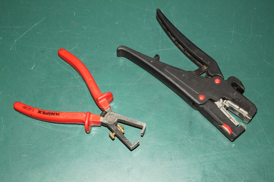 {Abisolieren} Wer öfter Jamma-Adapter oder Ähnliches bauen muss, weiss, welchen Aufwand es bedeutet, diese Vielzahl von Kabeln abzuisolieren. Im schlechtesten Fall benutzt man die eigenen Zähne als Werkzeug, das geht und macht auf Dauer den Zahnarzt glücklich. Ein Seitenschneider ist auch eine Möglichkeit, allerdings wird das Kabel in der Vielzahl der Fälle immer ein kleines Stückchen kürzer, wenn man den richtigen Druckpunkt nicht findet. {Besseres Werkzeug} Wie fast überall gibt es hier einfache und automatische Varianten. Die einfache Abisolierzange muss auf den Radius der Kupferlitze mittels eines arretierbaren Stellrädchens eingestellt werden, die automatische Zange stellt sich über einen justierbaren Druckpunkt automatisch auf die Kabeldicke ein. {Automatik macht's einfach...} Bei der Automatikzange geht das Ganze recht fix: das Kabel wird auf die gewünschte Abisolierlänge in die Zange eingelegt, die Zange wird zugedrückt. Die vorderen Backen fixieren die Isolierung und die hinteren Klauen reißen den Isolierrest einfach ab. Erinnert irgendwie an Alien, ist aber weniger blutig. Nach dem Abisolieren sollte man die Lfreien Litzenenden verdrillen, um ein Aufspleißen zu verhindern. |