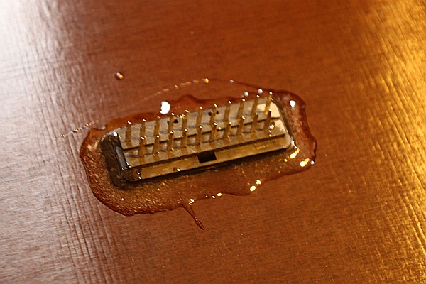 {MAK Eigenbau - Video} Am Originalautomaten nicht vorhanden, für die eigene MAK aber von großem Vorteil: standardisierte Video-Steckverbinder. Hir kann man über eine SCART-Buchse z.B. das Videosignal mit einem normalen SCART-Kabel zum Monitor führen. Ich habe einen lötbaren Scart-Stecker mit geraden Kontakten gewählt. Dieser wird in eine gefräste Aussparung in der Geräterückwand gelegt und rundherum mit zweikomponentenkleber eingegossen. Das hält ewig und sieht außerdem sehr sauber aus.