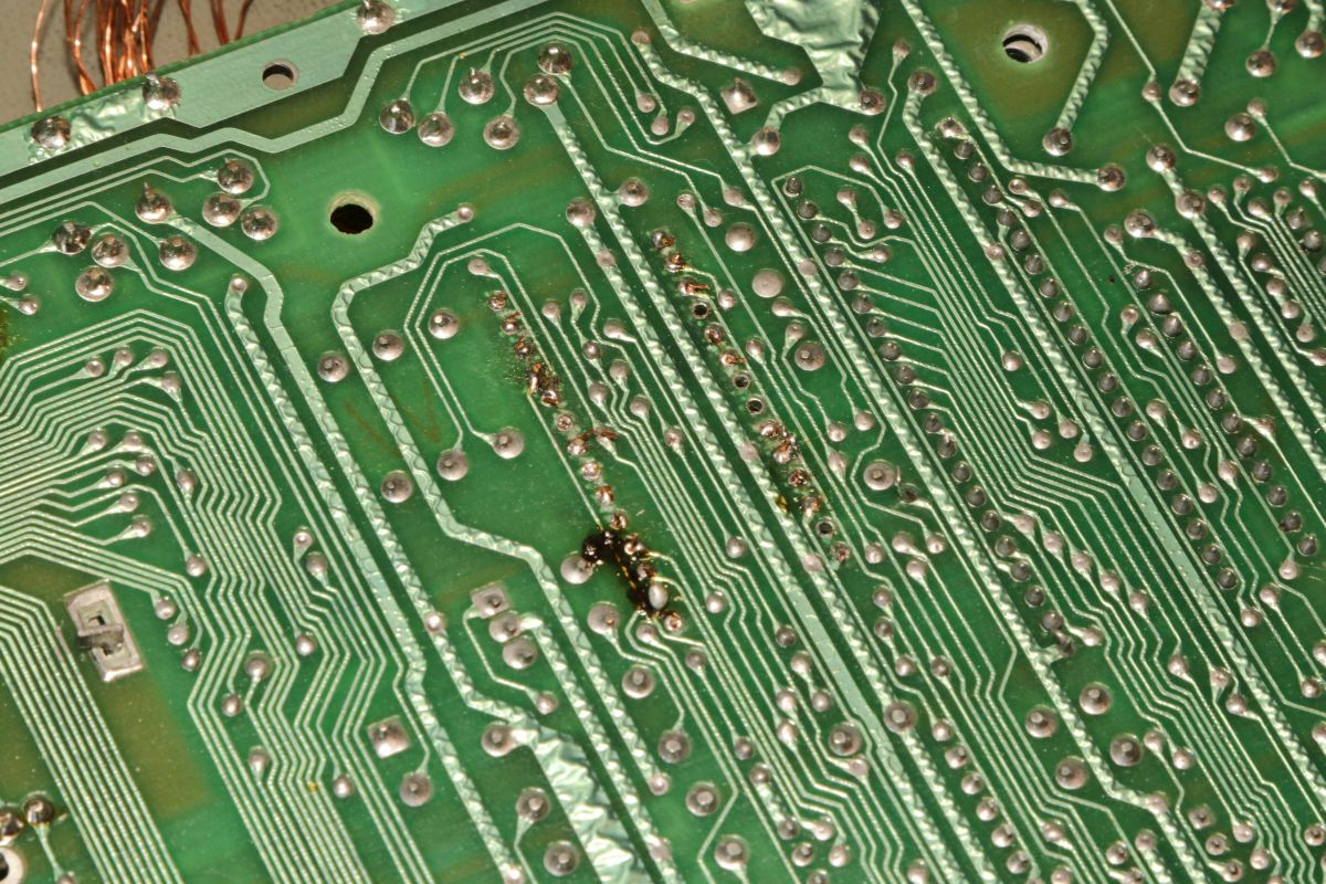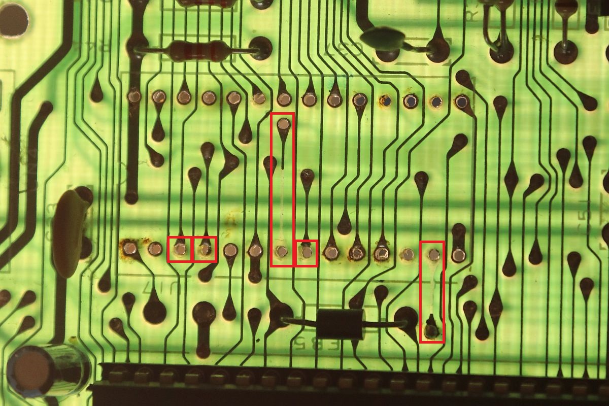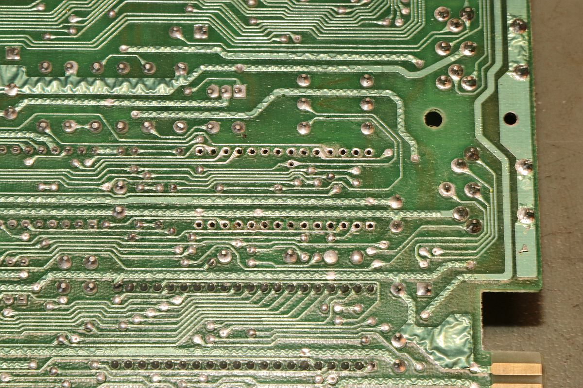 {C64 Motherboard - Das Massaker} Mich erreichte als Spende ein bemitleidenswertes Motherboard: PLA-Nachbau an Engelshaar... Auf die eine oder andere Weise hat sich da wer richtig Mühe gemacht! Etwas angebrannt... Fast alle Bausteine sind gesockelt - nachträglich. Auch die großen ICs, ich hoffe, besser als die ULA... Wie immer: erst einmal alles entfernen, dann sieht man, was sich darunter verbirgt. Fast gut... aber eben nur fast. Auf der Unterseite ist eigentlich alles komplett - vorausgesetzt, der Täter hat die Vias nicht mit herausgerissen. Das Ohmmeter wird es zeigen. Auf der Oberseite haben sich zwei Leiterbahnen verabschiedet und diverse Restrings fehlen. Das wird spannend. Ach ja, der ULA-Ersatz dürfte so auch nicht funktioniert haben... Ich bin gespannt, ob man das Board wieder zum Leben erwecken kann... Ohne Engelshaar! |
