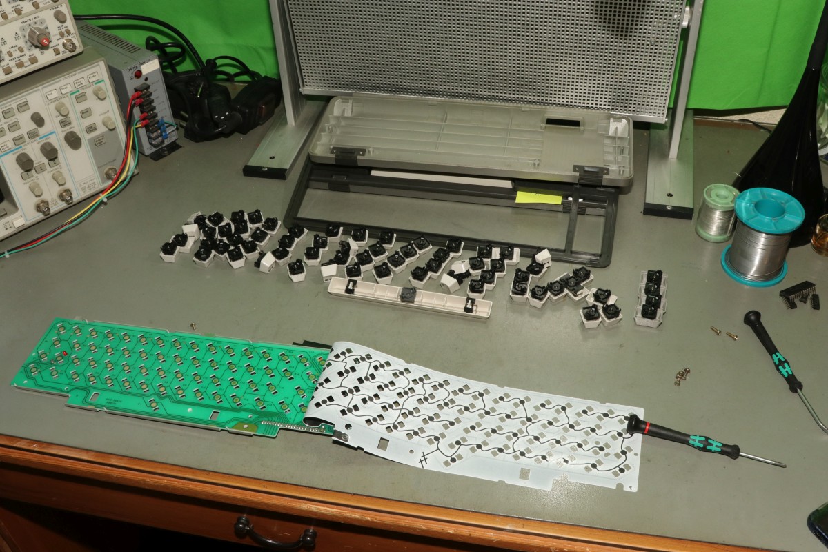 {SX-64 - Tastatur im Doppelpack} Eigentlich wollte ich nur mal rasch jemanden glücklich machen... zwei Tastaturen aus der Elektrobucht in unterschiedlichem Verwesungsfaktor mit zwei neuen Tastaturmembranen ausstatten... Kleinigkeit, dachte ich... Das übliche nervige Tastenrauspopeln war noch unspektakulär... Wie gehabt: Membrane sorgfältig abheben und die Graphitflächen säubern und polieren... Den Unterschied sieht man deutlich: Brennspiritus ist hier das Mittel der Wahl! Dann die Tasten wieder mühsam reingepopelt... Leider zeigte sich nach dem Zusammenbau, dass die Membran doch zu beschädigt ist, um damit sinnvoll was anfangen zu können. Aber egal, es liegen ja zwei neue Membranen mit bei... Dazu muss die Alte raus, was immer die Kontaktreihe irreparabel beschädigt. Die neue Membran bringt aber wieder frische Kontakte mit. Hier waren mal Kontaktstreifen drauf, die kleben jetzt auf der Platine. Nach dem alle Kontaktflächen gereinigt sind: hier die neue Membrane mit Unterlegfolie für einen besseren Kontaktabstand. Die klare Folie kommt zwischen Platine und Kontaktmembrane! Der separate Kontaktstreifen muss vorher weg - die Kontaktflächen müssen so weit wie möglich gereinigt werden! Bei den neuen Membrane die Kontaktschraube für die Abschirmfläche nicht vergessen! Die neue Membrane hat extra eine Schaumstoffauflage über den Kontakten, damit diese zuverlässig kontaktieren: Super, da gehen schon mal eine ganze Reihe Tasten nicht, das fängt ja gut an... Wenn der Fehler immer so - äh... anders wäre... OK, das war ja einfach... Jetzt fällt auf, dass auch mit der neuen Membran ein Taster dauernd auslöst. Da hatte wohl wer gedacht, die ranzige Altmembran mit mehr Federkraft pimpen zu können... Mit einer Flachzange und Geduld lässt sich die derart gelängte Feder gottseidank wieder auf Maß bringen. Toll... dafür hab ich jetzt jede Menge Doppelauslösungen... diese sind darauf zurückzuführen, dass die neue Membran nicht 100%ig ausgerichtet ist und an den Durchbrüchen von den Tastengehäusen quasi aufgewölbt wird - da geht es um Zehntel Millimeter! Die beiden Befestigungsbohrungen für die Kontaktklemme sind unsauber ausgerichtet! da hilt ein Lötkolben, dann kann man die Membran auch passgenau ausrichten. Links und rechts mit einem Streifen Tesafilm fixiert, hält das dann auch bis zur Montage der Tasten. Drei Stunden Später und ich habe eine perfekt funktionierende Tastatur vor mir. Und bei der zweiten Tastatur, bei der so gut wie keine Tasten mehr gingen, dachte ich mir, mache ich es doch gleich richtig. Leider musste ich feststellen, dass einzelne Tasten nicht ansprachen. Das lag jetzt nicht an meinem Unvermögen, sondern an einem Fertigungsfehler der Membran: Eine Unterbrechung in der Leiterbahn (die natürlich überlackiert und unsichtbar ist) macht mir das Leben schwer. Vorsichtig mit Aceton freigelegt (auch der Silberlack löst sich ab! also sehr vorsichtig!) kann man sich an die Reparatur wagen... Hauptsache, links und rechts sind noch Leiterbahnstummel übrig... Viel Silberleitlack hilft viel... Und zu guter Letzt ist auch die zweite Tastatur funktionabel - Silberlack sei Dank! Alle Tasten funktionieren zuverlässig und gewaltfrei. Jetzt habe ich nur noch das Problem, dass bei einem Taster der malträtierten Tastatur ein Rastnäschen der inneren Mechanik gebrochen ist. Die Taste funktioniert, hängt aber im nicht gedrückten Zustand schief... Hat jemand eine vollig vergnaddelte SX-64-Tastatur als Ersatzteillager? Bevor ich die groben Varianten ausprobiere... Alternativ habe ich einen 3-D-Druck in Auftrag gegeben - und UV-härtenden Kunststoffkleber bestellt... irgendeine Variante wird schon klappen. Ich halte euch auf dem Laufenden. Aceton als Auflöse- und Klebemittel hilft hier übrigens leider nicht, der Kunststoff ist nicht Aceton-löslich! {UV-Kleber im Einsatz} Er ist eingetroffen - der UV-Kleber mit UV-LED-Taschenlampe. Nicht billig, aber billigst verarbeitet. Egal: der Kleber ist leicht zähflüssig und lässt sich gut dosieren. Wenn man mit der UV-Lampe dann draufhält, dampft es etwas und der Kleber verwandelt sich innerhalb von Sekunden in eine glasharte durchsichtige Substanz. Leider haftet dieser Kleber an dem Kunststoff ebensowenig, wie alles Andere... der Haken ist wieder abgefallen. Dafür hat der UV-Kleber selber eine sehr haltbare Nase gebildet, die in der Tastatur einwandfrei hält. Gut, dass ich den unteren Teil des Elementes großflächig benetzt hatte. |
