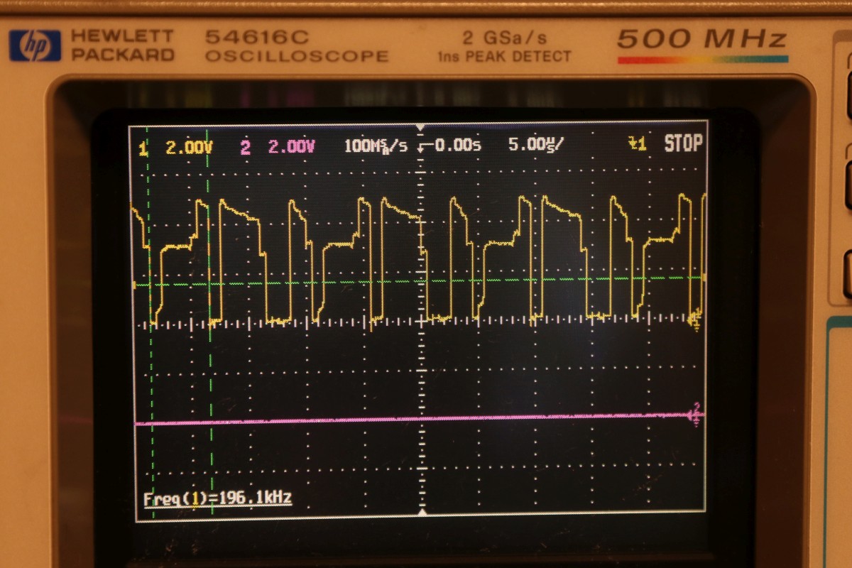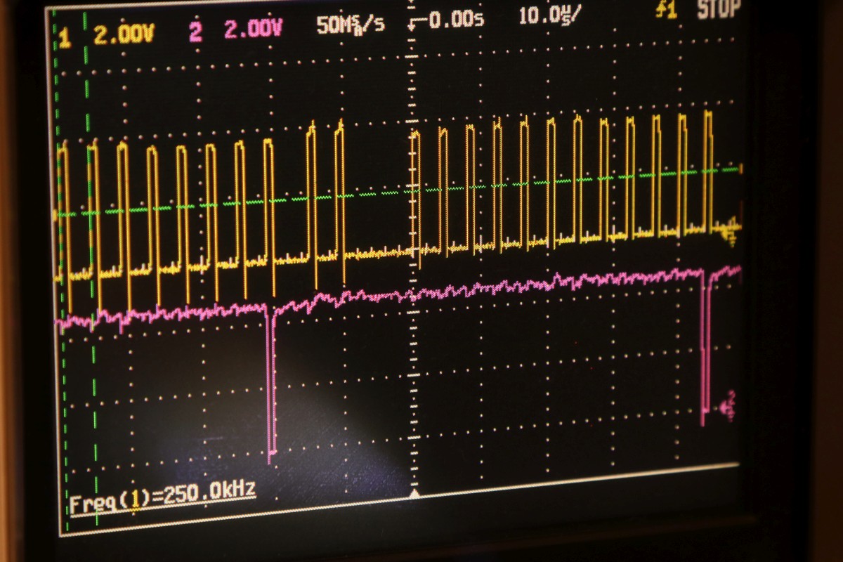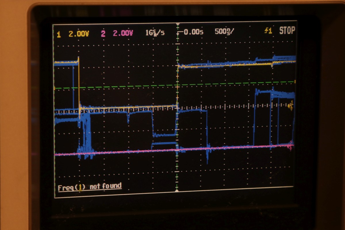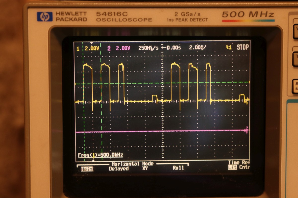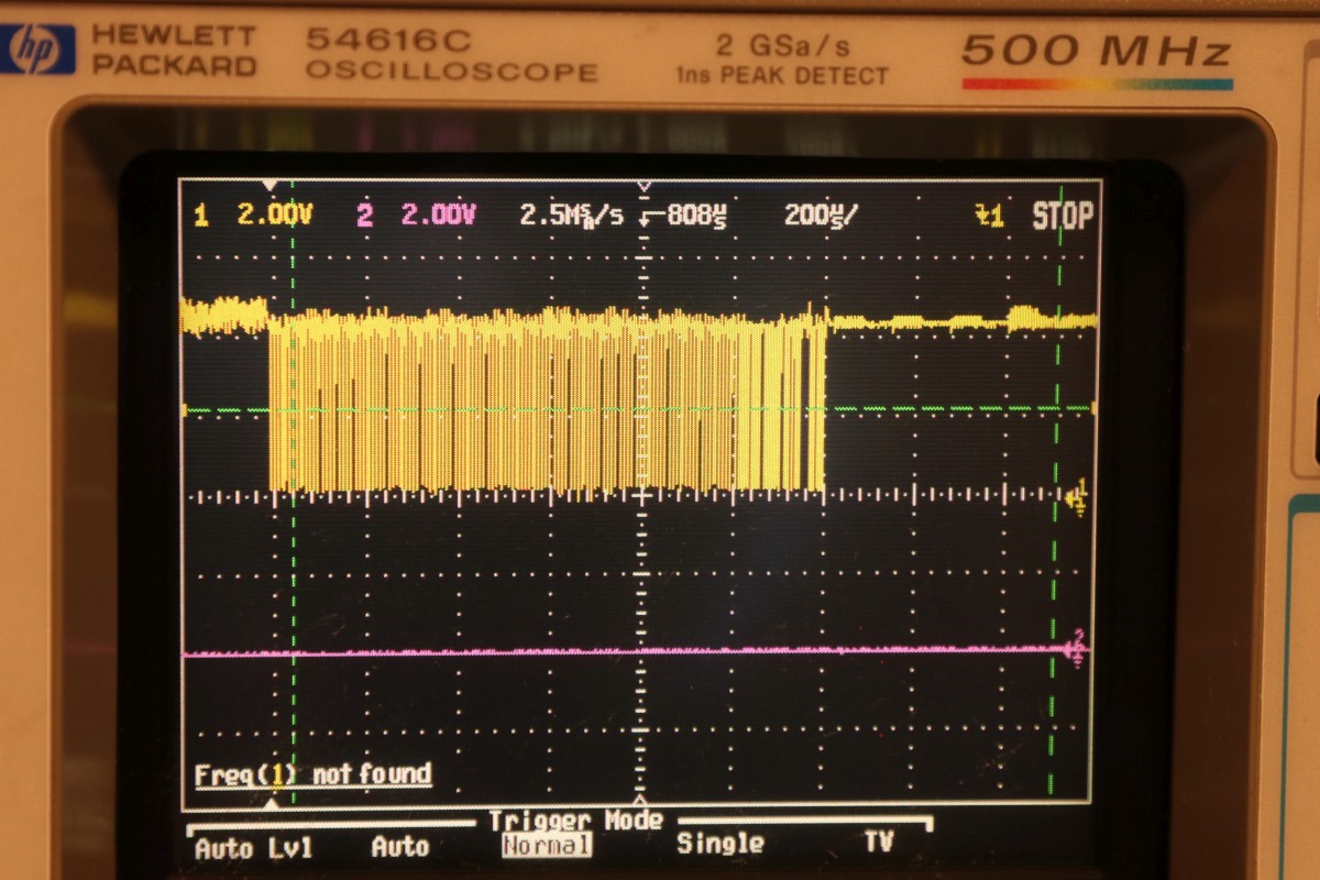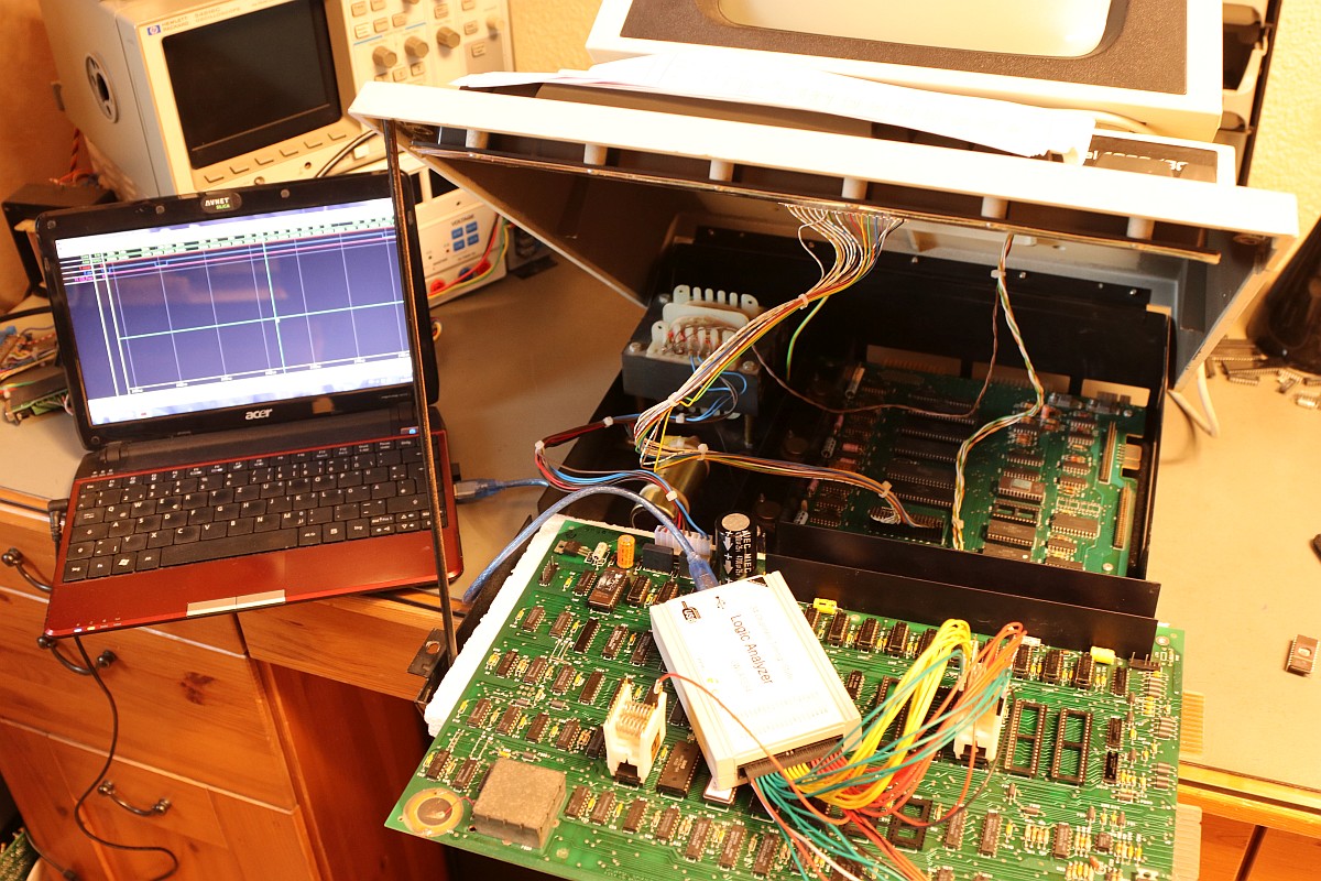 {Universal PET Motherboard} Mich erreichte eine Reparaturanfrage aus dem Altcomputerforum: ein Universal-PET-Motherboard. Die Diagnose des Besitzers wies auf sterbende 4116 hin, es ging immer weniger, am Ende ging garnichts mehr. Allerdings hatte das Teil auch bereits ersetzte defekte ROMs und einen defekten CRTC zu verzeichnen. Seltsam... Mein 8096 zeigte sich sofort bereit, als Netzteilverleiher zu fungieren. Die Diagnose wurde bestätigt. Es geht fast nix mehr auf diesem Board. Reset geht nach 1s brav auf High. Der IRQ von den Schnittstellenbausteinen ist dauernd low - nicht gut, aber den Programmablauf sollte das nicht blockieren. Trotzdem startet die CPU nur sporadisch. Der Datenbus ist nicht wirklich gut - ich teste die Datenausgänge der dynamischen RAMs... Zwei der bereits getauschten RAMs sind defekt - schlechte Idee, die defekten Teile wieder in den Sockel zu stecken. Mit "neuen" RAMs sehen die Datenpegel wieder gut aus. Bit 0 und 1 sind auch platt - ich tausche gleich beide Bänke, man kann die ja eingelötet schlecht auseinanderhalten, die Datenleitungen liegen parallel. Die Leiterplatte ist von sehr guter Qualität, Auslöten mit Entlötpistole und moderater Heißluftfönunterstützung geht prima! Neue RAMs beruhigen den Datenbus - das Programm läuft trotzdem nicht richtig an. Nur als Beispiel: so muss das IRQ#-Signal an der CPU aussehen, wenn alles gut läuft. Bei der Fehlersuche fällt mir auf, dass die ROMs nicht wirklich angesprochen werden. Es kommt kein Chip Select. Der Decoderbaustein 74154 ist völlig tot. Nach Austausch kommt endlich ein sauberes Chip Select - die CPU versucht von ROM 0xFxxx zu starten - hier liegen die Sprungvektoren für Reset , Break und Interrupt. Trotzdem: kein zuverlässiger Programmstart, keine Initialisierung. Immerhin läuft schon mal irgendwas zyklisch. Manchmal bricht es nach wenigen ms ab - manchmal bleibt das Programm in einem stabilen Zustand... Ich tausche konsequent alle RAMs in Bank 0. Das hilft auch nicht, aber mir fällt auf, dass es auf dem Datenbus nicht mit rechten Dingen zugeht! Deutlich zu sehen beim Zugriff auf ROM 0xFxxx: der Datenbus ist nicht das gesamte CS# (oberes Signal) stabil! In den letzten 500ns zwingt offensichtlich ein weiterer Busteilnehmer den Datenbus auf einen Zwischenpegel. AM ROM ligen in diesem Zeitbereich keine Pegelwechsel an. Dieser 500ns-Zeitslot wird nur vom DRAM genutzt - aber auch nicht, wenn CS# aktiv ist... Die Schnittstellenbausteine bekommen derzeit eh keine CS# Signale und müssten stillgelegt sein. Ansonsten liegen am ungebufferten Datenbus nur die ROMs, die DRAMs und zwei Bustreiber. Der Tausch eines der Bustreiber bringt keinerlei Änderung. Die DRAMs können auch nicht der Verursacher sein - wenn ich das Pärchen auf Bit 0 entferne, ändert sich nichts am Verhalten. Als letzte Möglichkeit entferne ich alle Schnittstellenbausteine. Das war sehr aufwändig - aber leider erfolglos. Der Fehler ist immer noch da. Ich fange langsam an, an meinen Fähigkeiten zu zweifeln... {Fortsetzung:} Weiter im Text: ein komplettes Abkoppeln des buffered databus hat nichts gebracht. Der Datenbus wird weiter zeitweilig doppelt verwendet. Also kann es nur was mit der CPU und dem ROM zu tun haben. Die CPU versucht auf das ROM zu schreiben. Also Fehler im Programmablauf - vermutlich schreibt die CPU Sprungadressen in das RAM und springt dann in die Prärie... Ich entferne alles Unnötige: ...und schreibe ein aufwändiges Testprogramm direkt am Hex-Editor. Die Sprungvektoren darf man natürlich auch nicht vergessen: Das Ganze in ein TMS2532 gebrannt: Und schon kann man in aller Ruhe das Verhalten der Schaltung bewundern: In diesem Fall ist Gelb das Chip select von ROM Fxxx und Lila ein Chip Select von ROM Bxxx (der vierte LDA Befehl) Die 10µS Pause oben sind der Rücksprung auf Adresse F000. Das Programm wird erweitert: Zugriffe auf die komplette I/O, den Video-RAM (hätte ich schreiben und nicht lesen sollen - so hat's keinen Effekt...) und wichtig einmal Schreiben und Lesen im DRAM. Die Chip Selects am CRTC 0xE880: Und am DRAM: Schreiben und Lesen einer logischen "1" auf Adresse 0x0000. Schreiben und Lesen einer logischen "0" auf Adresse 0x0000: Schreiben und Lesen einer logischen "0" auf Adresse 0x0000 ohne weitere Datenbusaktivität zu diesem Zeitpunkt: Jetzt kommt die nächste Eskalationsstufe - nachdem ich per Oszi keinen Hardwarefehler finden konnte: Testclips. 34-Bit Logikanalysator. Und die dazu gehörige Analysesoftware. Zuerst mein Testprogramm: alle Aktionen finden sich im Datensalat wieder. Ebenso die DRAM Schreib- und Lesezugriffe und der Rücksprung in der Programmschleife. CPU, Daten- und Adressbus und die ROMs arbeiten einwandfrei. Jetzt prüfe ich das Verhalten mit den Original-ROMs. Mein Verdacht bestätigt sich: die CPU versucht auf 0xE452 einen indirekt adressierten Sprung. Der Vektor steht im DRAM auf den Adressen 0x0090 und 0x0091. Dort stehen aber nur Nullen drin. Somit springt die CPU auf Adresse 0x0000 und findet dort den Befehl 0x00 - also BRK. Offensichtlich hat die Initialisierung der Sprungvektoren im RAM nicht geklappt - entweder sind die RAMs defekt (unwahrscheinlich, weil neu), das Schreiben in dem Adressbereich klappt nicht (Adressbus-Buffer defekt) oder die RAMs vergessen Daten (Refresh-Logik defekt). Weitere Erkenntnisse werde ich nur mit einem verbesserten Testprogramm erhalten! |