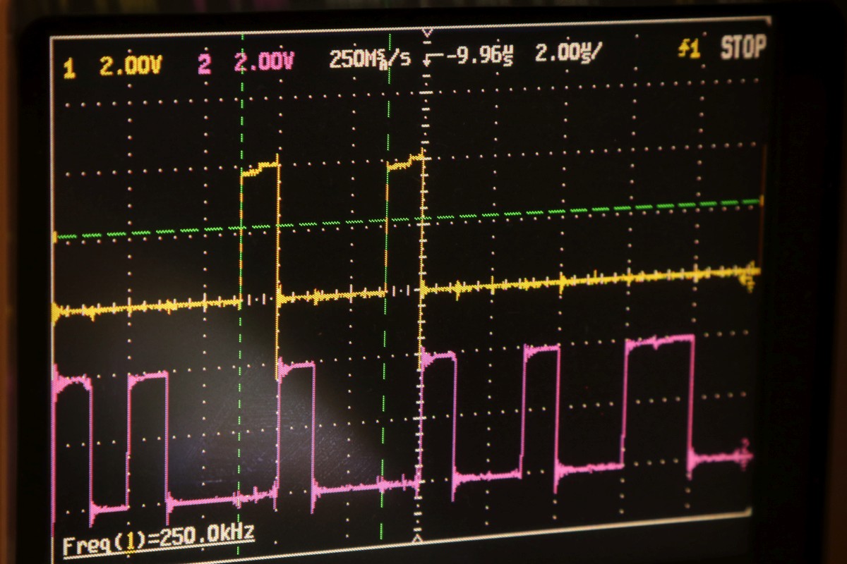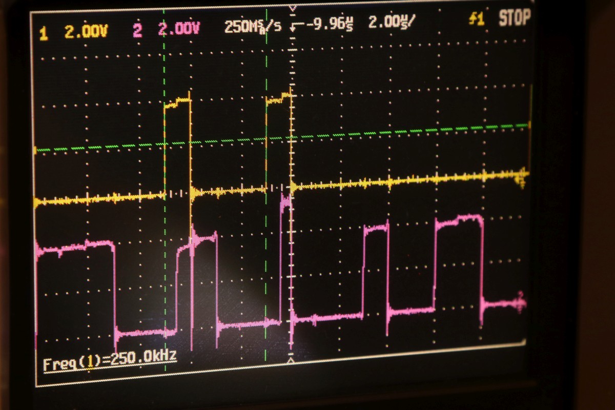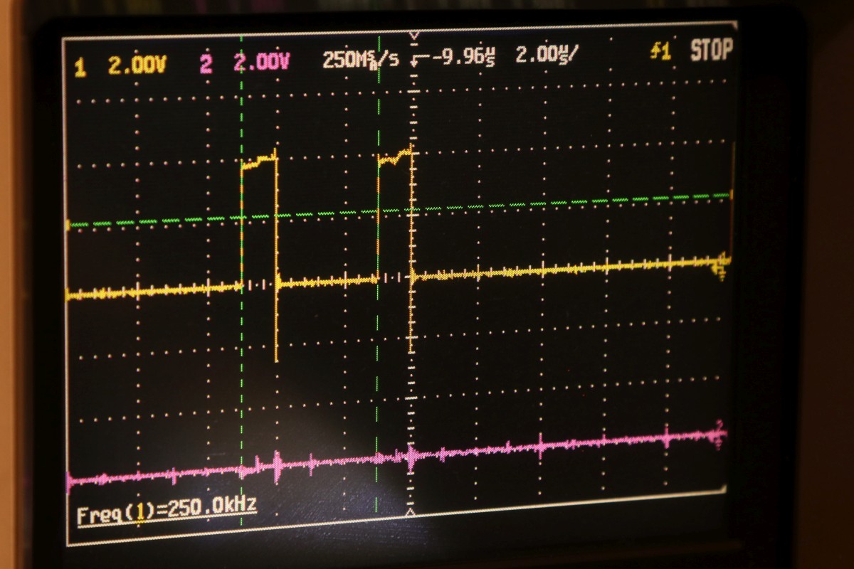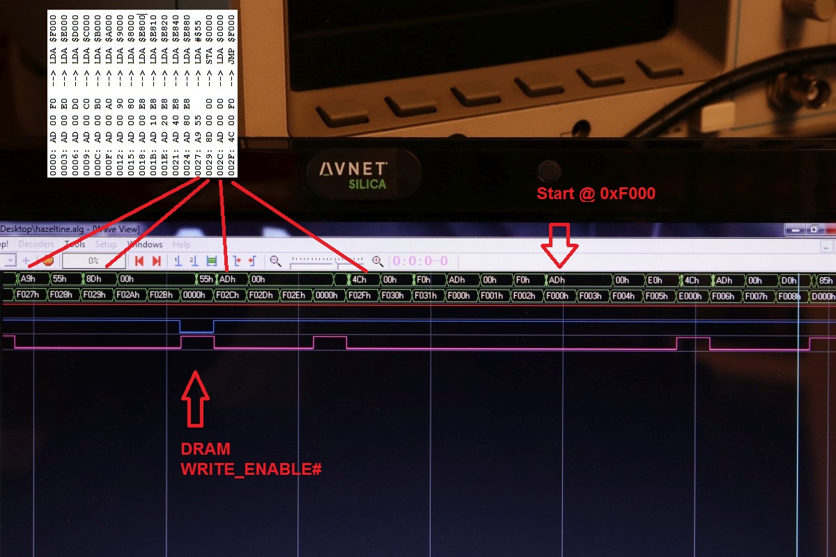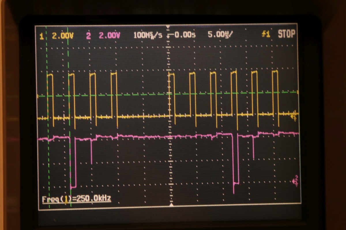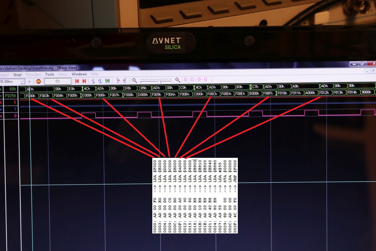 {Universal PET Motherboard} Mich erreichte eine Reparaturanfrage aus dem Altcomputerforum: ein Universal-PET-Motherboard. Die Diagnose des Besitzers wies auf sterbende 4116 hin, es ging immer weniger, am Ende ging garnichts mehr. Allerdings hatte das Teil auch bereits ersetzte defekte ROMs und einen defekten CRTC zu verzeichnen. Seltsam... Mein 8096 zeigte sich sofort bereit, als Netzteilverleiher zu fungieren. Die Diagnose wurde bestätigt. Es geht fast nix mehr auf diesem Board. Reset geht nach 1s brav auf High. Der IRQ von den Schnittstellenbausteinen ist dauernd low - nicht gut, aber den Programmablauf sollte das nicht blockieren. Trotzdem startet die CPU nur sporadisch. Der Datenbus ist nicht wirklich gut - ich teste die Datenausgänge der dynamischen RAMs... Zwei der bereits getauschten RAMs sind defekt - schlechte Idee, die defekten Teile wieder in den Sockel zu stecken. Mit "neuen" RAMs sehen die Datenpegel wieder gut aus. Bit 0 und 1 sind auch platt - ich tausche gleich beide Bänke, man kann die ja eingelötet schlecht auseinanderhalten, die Datenleitungen liegen parallel. Die Leiterplatte ist von sehr guter Qualität, Auslöten mit Entlötpistole und moderater Heißluftfönunterstützung geht prima! Neue RAMs beruhigen den Datenbus - das Programm läuft trotzdem nicht richtig an. Nur als Beispiel: so muss das IRQ#-Signal an der CPU aussehen, wenn alles gut läuft. Bei der Fehlersuche fällt mir auf, dass die ROMs nicht wirklich angesprochen werden. Es kommt kein Chip Select. Der Decoderbaustein 74154 ist völlig tot. Nach Austausch kommt endlich ein sauberes Chip Select - die CPU versucht von ROM 0xFxxx zu starten - hier liegen die Sprungvektoren für Reset , Break und Interrupt. Trotzdem: kein zuverlässiger Programmstart, keine Initialisierung. Immerhin läuft schon mal irgendwas zyklisch. Manchmal bricht es nach wenigen ms ab - manchmal bleibt das Programm in einem stabilen Zustand... Ich tausche konsequent alle RAMs in Bank 0. Das hilft auch nicht, aber mir fällt auf, dass es auf dem Datenbus nicht mit rechten Dingen zugeht! Deutlich zu sehen beim Zugriff auf ROM 0xFxxx: der Datenbus ist nicht das gesamte CS# (oberes Signal) stabil! In den letzten 500ns zwingt offensichtlich ein weiterer Busteilnehmer den Datenbus auf einen Zwischenpegel. AM ROM ligen in diesem Zeitbereich keine Pegelwechsel an. Dieser 500ns-Zeitslot wird nur vom DRAM genutzt - aber auch nicht, wenn CS# aktiv ist... Die Schnittstellenbausteine bekommen derzeit eh keine CS# Signale und müssten stillgelegt sein. Ansonsten liegen am ungebufferten Datenbus nur die ROMs, die DRAMs und zwei Bustreiber. Der Tausch eines der Bustreiber bringt keinerlei Änderung. Die DRAMs können auch nicht der Verursacher sein - wenn ich das Pärchen auf Bit 0 entferne, ändert sich nichts am Verhalten. Als letzte Möglichkeit entferne ich alle Schnittstellenbausteine. Das war sehr aufwändig - aber leider erfolglos. Der Fehler ist immer noch da. Ich fange langsam an, an meinen Fähigkeiten zu zweifeln... {Fortsetzung:} Weiter im Text: ein komplettes Abkoppeln des buffered databus hat nichts gebracht. Der Datenbus wird weiter zeitweilig doppelt verwendet. Also kann es nur was mit der CPU und dem ROM zu tun haben. Die CPU versucht auf das ROM zu schreiben. Also Fehler im Programmablauf - vermutlich schreibt die CPU Sprungadressen in das RAM und springt dann in die Prärie... Ich entferne alles Unnötige: ...und schreibe ein aufwändiges Testprogramm direkt am Hex-Editor. Die Sprungvektoren darf man natürlich auch nicht vergessen: Das Ganze in ein TMS2532 gebrannt: Und schon kann man in aller Ruhe das Verhalten der Schaltung bewundern: In diesem Fall ist Gelb das Chip select von ROM Fxxx und Lila ein Chip Select von ROM Bxxx (der vierte LDA Befehl) Die 10µS Pause oben sind der Rücksprung auf Adresse F000. Das Programm wird erweitert: Zugriffe auf die komplette I/O, den Video-RAM (hätte ich schreiben und nicht lesen sollen - so hat's keinen Effekt...) und wichtig einmal Schreiben und Lesen im DRAM. Die Chip Selects am CRTC 0xE880: Und am DRAM: Schreiben und Lesen einer logischen "1" auf Adresse 0x0000. Schreiben und Lesen einer logischen "0" auf Adresse 0x0000: Schreiben und Lesen einer logischen "0" auf Adresse 0x0000 ohne weitere Datenbusaktivität zu diesem Zeitpunkt: Jetzt kommt die nächste Eskalationsstufe - nachdem ich per Oszi keinen Hardwarefehler finden konnte: Testclips. 34-Bit Logikanalysator. Und die dazu gehörige Analysesoftware. Zuerst mein Testprogramm: alle Aktionen finden sich im Datensalat wieder. Ebenso die DRAM Schreib- und Lesezugriffe und der Rücksprung in der Programmschleife. CPU, Daten- und Adressbus und die ROMs arbeiten einwandfrei. Jetzt prüfe ich das Verhalten mit den Original-ROMs. Mein Verdacht bestätigt sich: die CPU versucht auf 0xE452 einen indirekt adressierten Sprung. Der Vektor steht im DRAM auf den Adressen 0x0090 und 0x0091. Dort stehen aber nur Nullen drin. Somit springt die CPU auf Adresse 0x0000 und findet dort den Befehl 0x00 - also BRK. Offensichtlich hat die Initialisierung der Sprungvektoren im RAM nicht geklappt - entweder sind die RAMs defekt (unwahrscheinlich, weil neu), das Schreiben in dem Adressbereich klappt nicht (Adressbus-Buffer defekt) oder die RAMs vergessen Daten (Refresh-Logik defekt). Weitere Erkenntnisse werde ich nur mit einem verbesserten Testprogramm erhalten! |