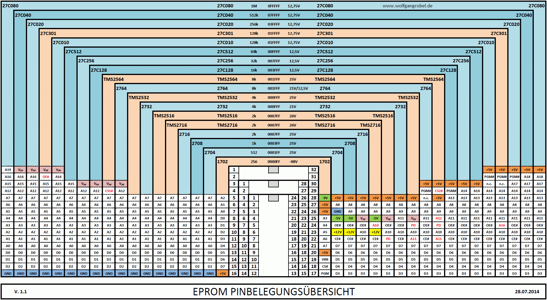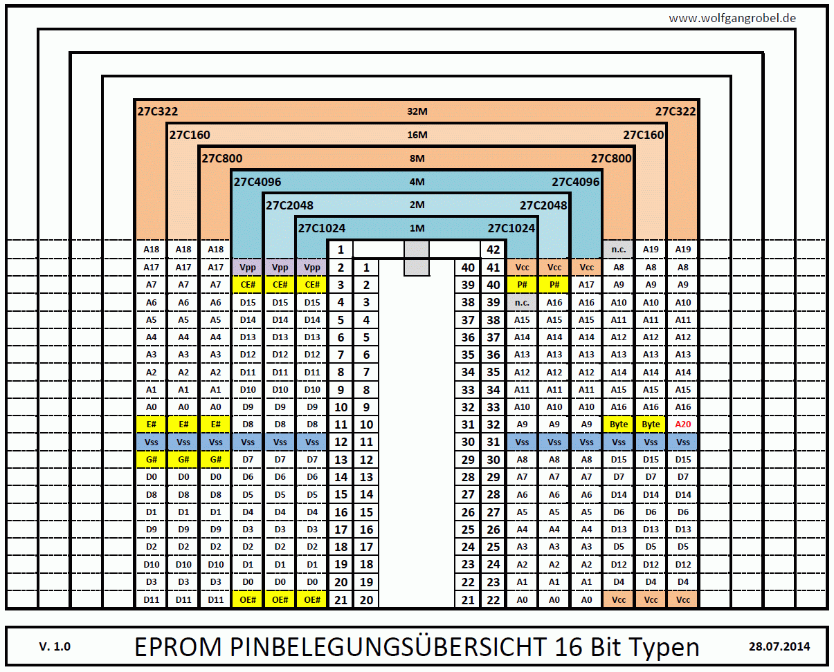 {Vergleichstabelle 8 Bit Typen} Die folgende Übersichtstabelle zeigt die unterschiedlichen Pinbelegungen der gängigen EPROMs auf. Kapazitätsangaben in Byte! Durch Mausklick wird die Tabelle richtig groß. Alternativ gibt es sie auch hier als PDF-Download. {Vergleichstabelle 8/16 Bit Typen} Die folgende Übersichtstabelle zeigt die unterschiedlichen Pinbelegungen der gängigen 16-Bit EPROMs auf. Die Kapazitätsangaben sind hier in Bit angegeben! Durch Mausklick wird die Tabelle richtig groß. Alternativ gibt es sie auch hier als PDF-Download. |