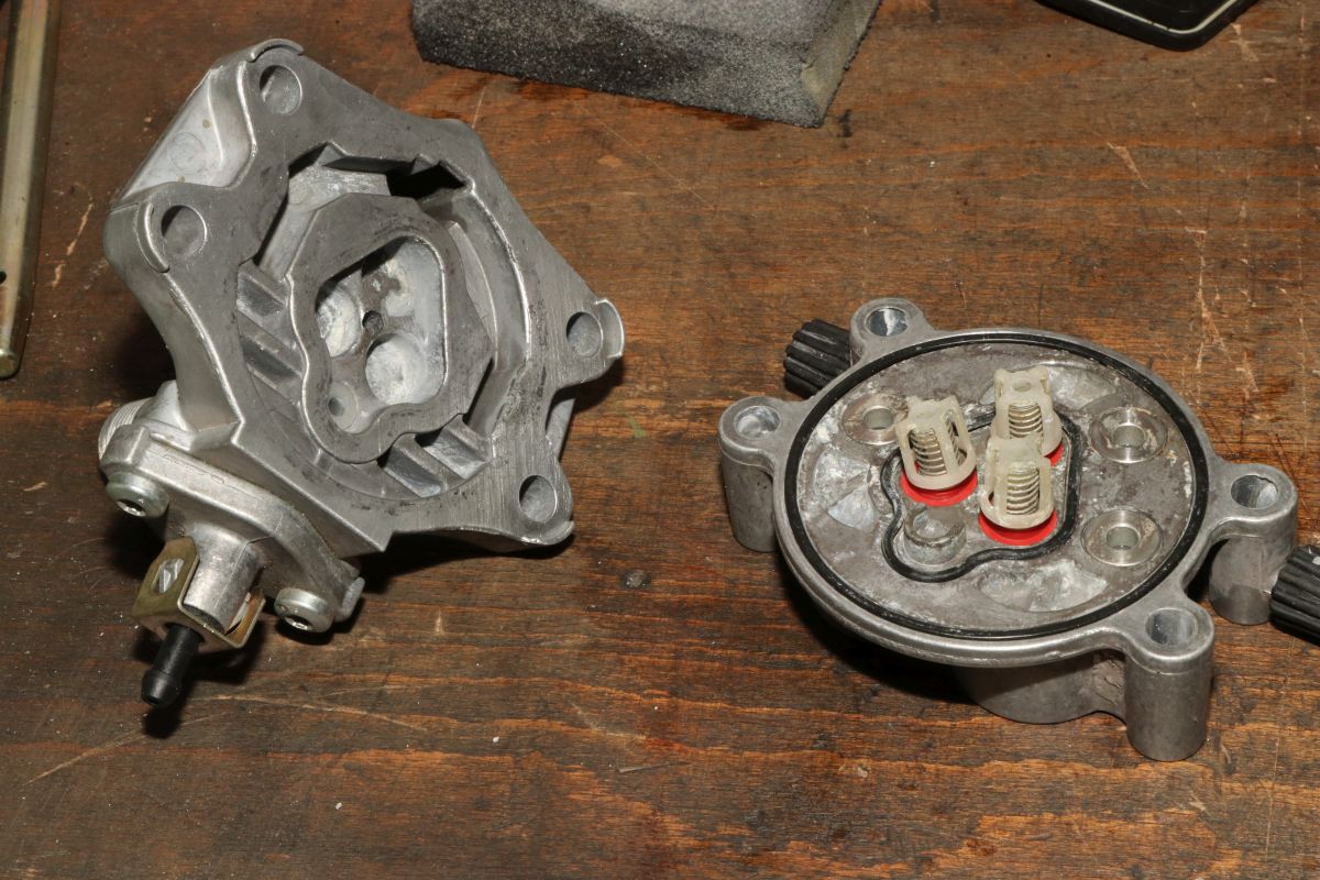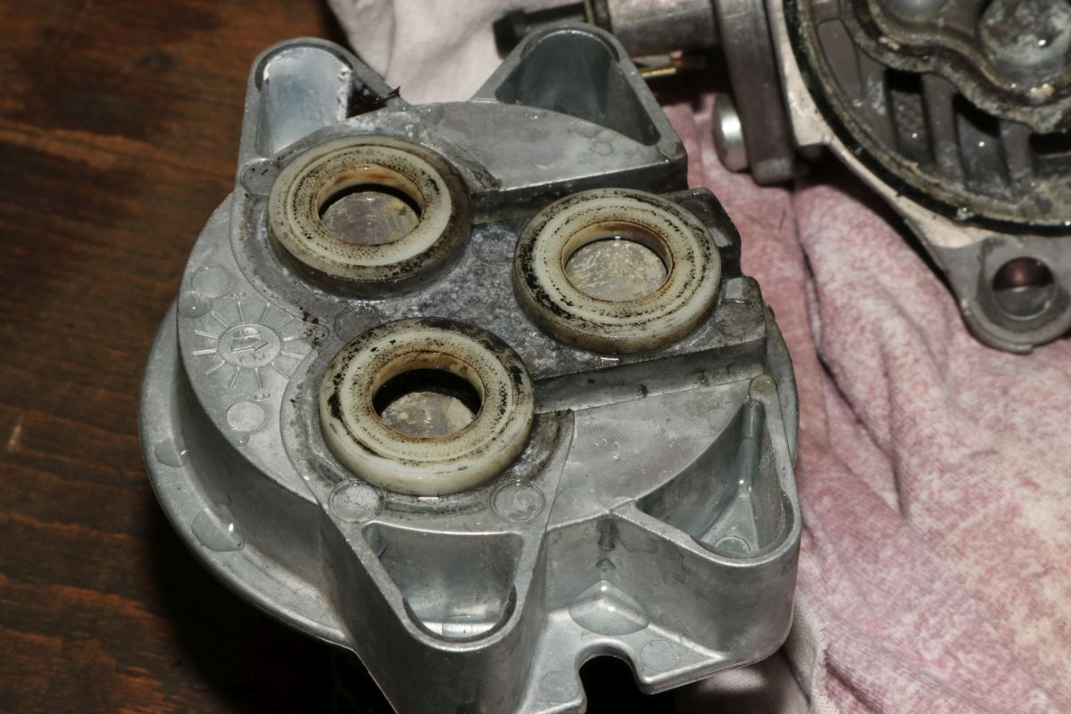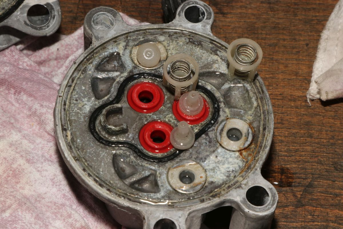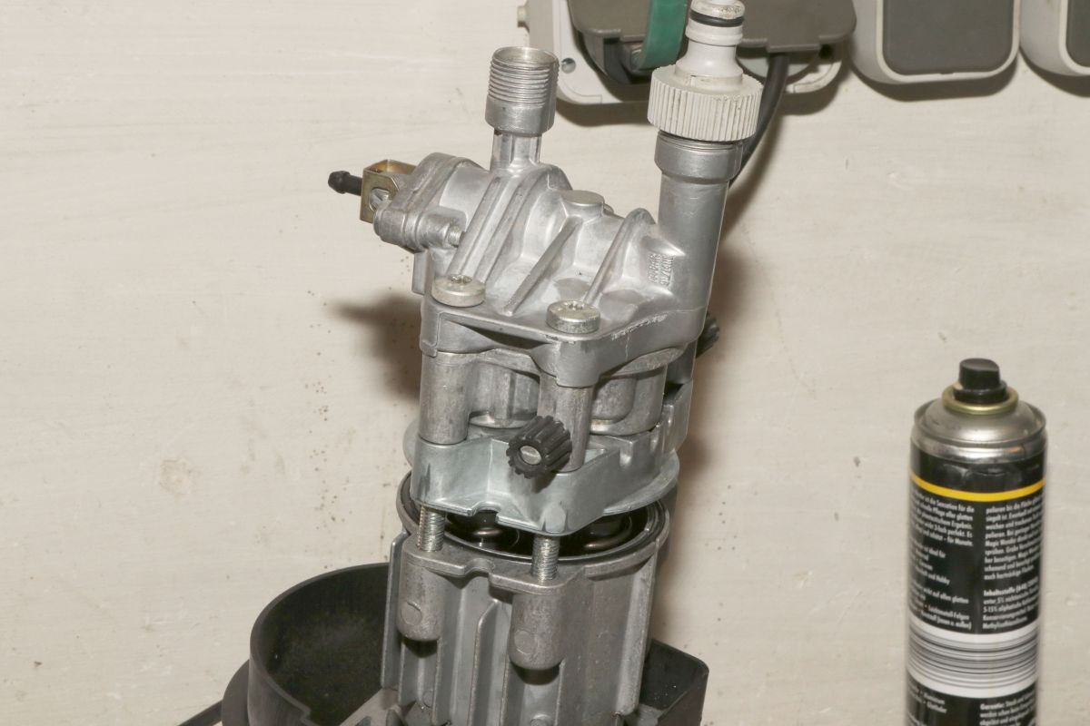 {Kärcher Hochdruckreiniger 410} Manche Defekte merkt man erst, wenn man das Gerät nach Jahren wieder in Betrieb nehmen will: so bei diesem Kärcher Hochdruckreiniger, der trotz problemlos laufendem Motor einfach keinen Druck liefert. Der reine Gartenschlauch bietet mehr Reinigungswirkung... Bevor ich das alte Gerät entsorge, will ich doch mal wissen, ob man da nicht was machen kann. Erste Herausforderung: die Torx-Gehäuseschrauben. Eine davon ist eine Sicherungsschraube mit zusätzlichem Dorn im Schraubenkopf. Das sieht man natürlich nicht. Es hat mich nicht lange aufgehalten... Die Pumpe hingegen lässt sich mustergültig demontieren: 4 fette Torx-Schrauben halten das Aggregat zusammen. Punkt 1: unbedingt aufrecht demontieren, sonst läuft das Motoröl aus und Punkt 2: alle 4 Schrauben gleichmäßig lösen, sonst verkantet das Ganze. Die Ventilplatte ist schon mal beeindruckend korrodiert, sieht aber schlimmer aus, als es ist! Die Kolbenplatte zeigt das Problem: die Kolben sind nicht freigängig. Bei den Ventil-Einzelteilen sollte man sich merken, was wo wie hinkommt. Aber eigentlich ist das nicht sehr kompliziert. Hier die Taumelscheibe, die im Ölbad schwimmt. Die taumelnde Scheibe wird vom Motor angetrieben und drückt die drei Kolbenstößel zyklisch nach vorne. Wenn sie sich denn drücken ließen... Wasserzulauf (oben), Hochdruckabgang (mitte) und Waschmittelzulauf (unten). Sieht aus, wie ein Dreiventiler... Auf Ölbadseite ist alles in Ordnung. Ein Kolben ist freigängig, zwei stecken fest. Da hilft nur die komplette Demontage. Das ist aber ganz einfach, die Kolben sind nur eingesteckt. Die festen Kolben kann man mit einem Treibdorn losbekommen. Ein Teil der Gummidichtung hat sich mit dem Kolben verklebt. Die Reinigung ist mit einer Stahlbürste ganz einfach, die Kolbenstößel sind gehärtet, denen macht das nichts aus. Die Laufbuchsen sind glatt, die Gummidichtungen sehen nicht so gut aus, laufen aber frisch geschmiert einwandfrei. Das Gummifitzelchen der einen Dichtung kann man einfach mal entfernen, damit sich nichts verklemmt. Ich bin gespannt, ob das nachher alles gut läuft. Die Kolben laufen auf jeden Fall wieder satt in den Buchsen. Im schlimmsten Fall dringen geringe Mengen Wasser ins Ölbad ein - das sollte man regelmäßig mal kontrollieren. Gibt es hier eigentlich Ersatzdichtungen? Kolbenplatte und Kunststoffringe geputzt und wieder montiert: Die Ventilplatte vorher... ... und nachher: Diese beiden Teile lassen sich etwas mühsam montieren. Dann vorsichtig aufsetzen, andrücken und die vier Schrauben gleichmäßig festziehen. Der Schalter macht auch Probleme: rastet nicht richtig und ist an einem Kontakt ausgebrochen. Für den ersten Test reicht Kleben. Und nach anfänglichen Schwierigkeiten mit dem Druckaufbau (vermutlich mussten sich die Ventile wieder erst ein wenig einarbeiten) kärchert der Kärcher wieder einwandfrei! Den Garagenvorplatz habe ich damit schon wieder richtig strahlend sauber hinbekommen. Nächster Schritt: den teildefekten Schalter ersetzen - Ersatzteil ist schon bestellt! 30 Euro - Alter!? |