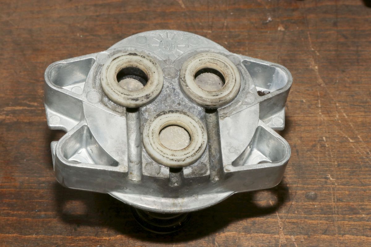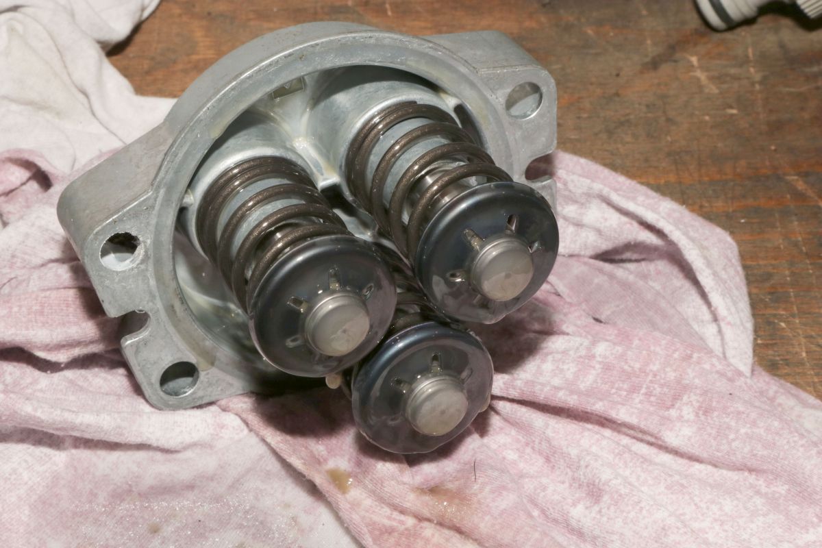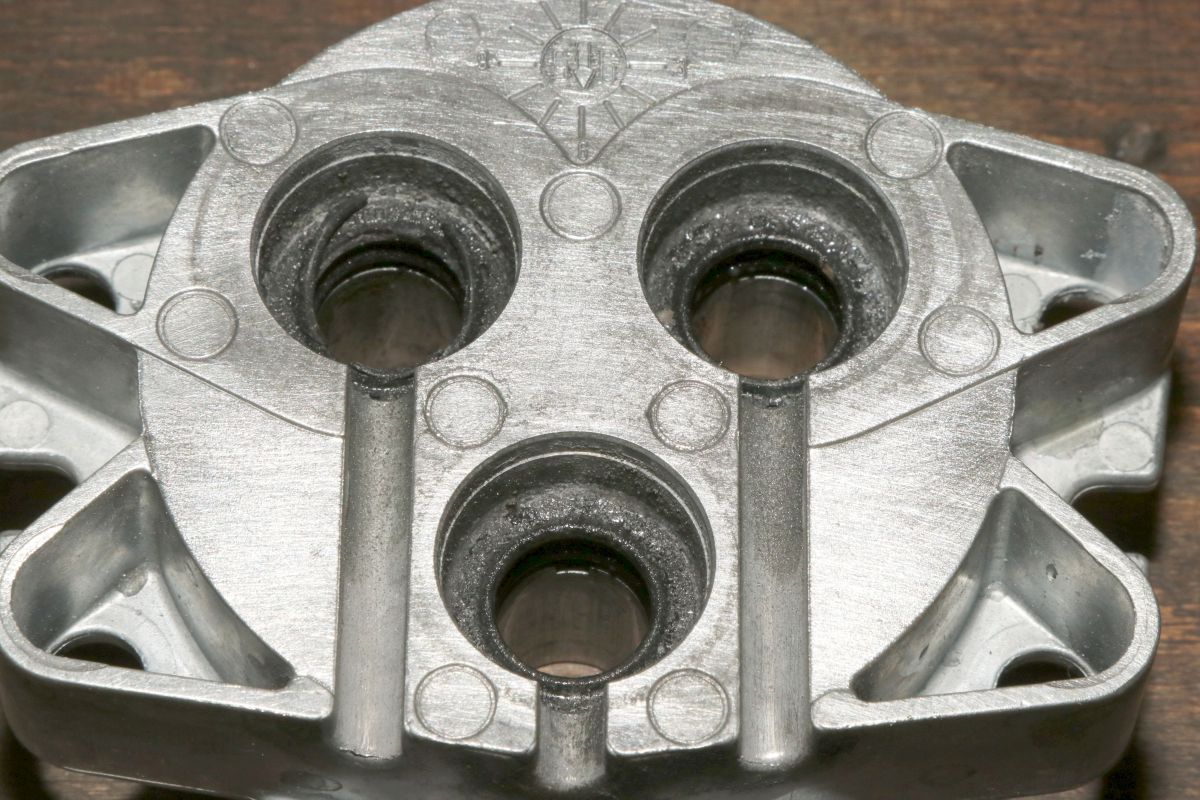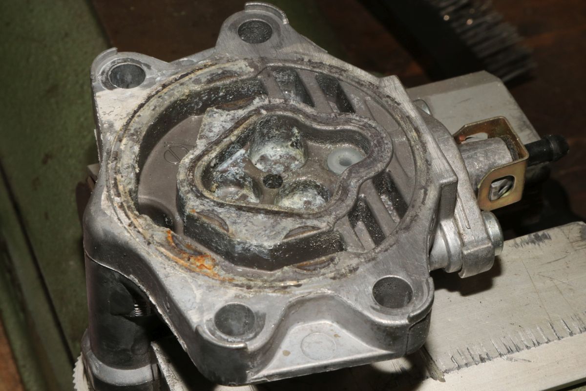 {Kärcher Hochdruckreiniger 410} Manche Defekte merkt man erst, wenn man das Gerät nach Jahren wieder in Betrieb nehmen will: so bei diesem Kärcher Hochdruckreiniger, der trotz problemlos laufendem Motor einfach keinen Druck liefert. Der reine Gartenschlauch bietet mehr Reinigungswirkung... Bevor ich das alte Gerät entsorge, will ich doch mal wissen, ob man da nicht was machen kann. Erste Herausforderung: die Torx-Gehäuseschrauben. Eine davon ist eine Sicherungsschraube mit zusätzlichem Dorn im Schraubenkopf. Das sieht man natürlich nicht. Es hat mich nicht lange aufgehalten... Die Pumpe hingegen lässt sich mustergültig demontieren: 4 fette Torx-Schrauben halten das Aggregat zusammen. Punkt 1: unbedingt aufrecht demontieren, sonst läuft das Motoröl aus und Punkt 2: alle 4 Schrauben gleichmäßig lösen, sonst verkantet das Ganze. Die Ventilplatte ist schon mal beeindruckend korrodiert, sieht aber schlimmer aus, als es ist! Die Kolbenplatte zeigt das Problem: die Kolben sind nicht freigängig. Bei den Ventil-Einzelteilen sollte man sich merken, was wo wie hinkommt. Aber eigentlich ist das nicht sehr kompliziert. Hier die Taumelscheibe, die im Ölbad schwimmt. Die taumelnde Scheibe wird vom Motor angetrieben und drückt die drei Kolbenstößel zyklisch nach vorne. Wenn sie sich denn drücken ließen... Wasserzulauf (oben), Hochdruckabgang (mitte) und Waschmittelzulauf (unten). Sieht aus, wie ein Dreiventiler... Auf Ölbadseite ist alles in Ordnung. Ein Kolben ist freigängig, zwei stecken fest. Da hilft nur die komplette Demontage. Das ist aber ganz einfach, die Kolben sind nur eingesteckt. Die festen Kolben kann man mit einem Treibdorn losbekommen. Ein Teil der Gummidichtung hat sich mit dem Kolben verklebt. Die Reinigung ist mit einer Stahlbürste ganz einfach, die Kolbenstößel sind gehärtet, denen macht das nichts aus. Die Laufbuchsen sind glatt, die Gummidichtungen sehen nicht so gut aus, laufen aber frisch geschmiert einwandfrei. Das Gummifitzelchen der einen Dichtung kann man einfach mal entfernen, damit sich nichts verklemmt. Ich bin gespannt, ob das nachher alles gut läuft. Die Kolben laufen auf jeden Fall wieder satt in den Buchsen. Im schlimmsten Fall dringen geringe Mengen Wasser ins Ölbad ein - das sollte man regelmäßig mal kontrollieren. Gibt es hier eigentlich Ersatzdichtungen? Kolbenplatte und Kunststoffringe geputzt und wieder montiert: Die Ventilplatte vorher... ... und nachher: Diese beiden Teile lassen sich etwas mühsam montieren. Dann vorsichtig aufsetzen, andrücken und die vier Schrauben gleichmäßig festziehen. Der Schalter macht auch Probleme: rastet nicht richtig und ist an einem Kontakt ausgebrochen. Für den ersten Test reicht Kleben. Und nach anfänglichen Schwierigkeiten mit dem Druckaufbau (vermutlich mussten sich die Ventile wieder erst ein wenig einarbeiten) kärchert der Kärcher wieder einwandfrei! Den Garagenvorplatz habe ich damit schon wieder richtig strahlend sauber hinbekommen. Nächster Schritt: den teildefekten Schalter ersetzen - Ersatzteil ist schon bestellt! 30 Euro - Alter!? |