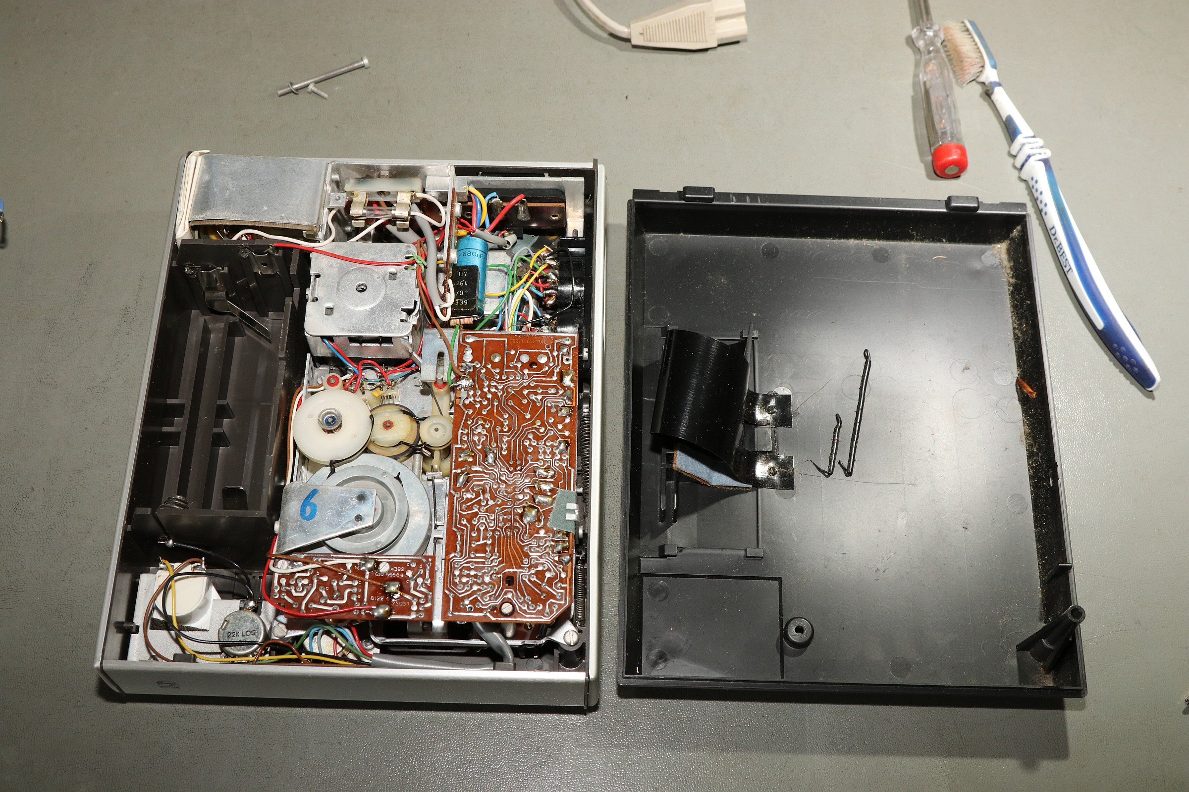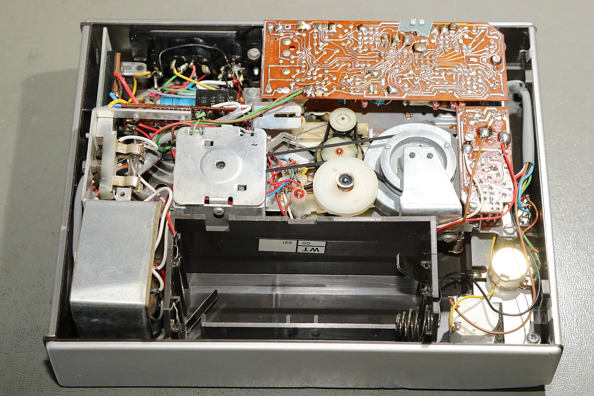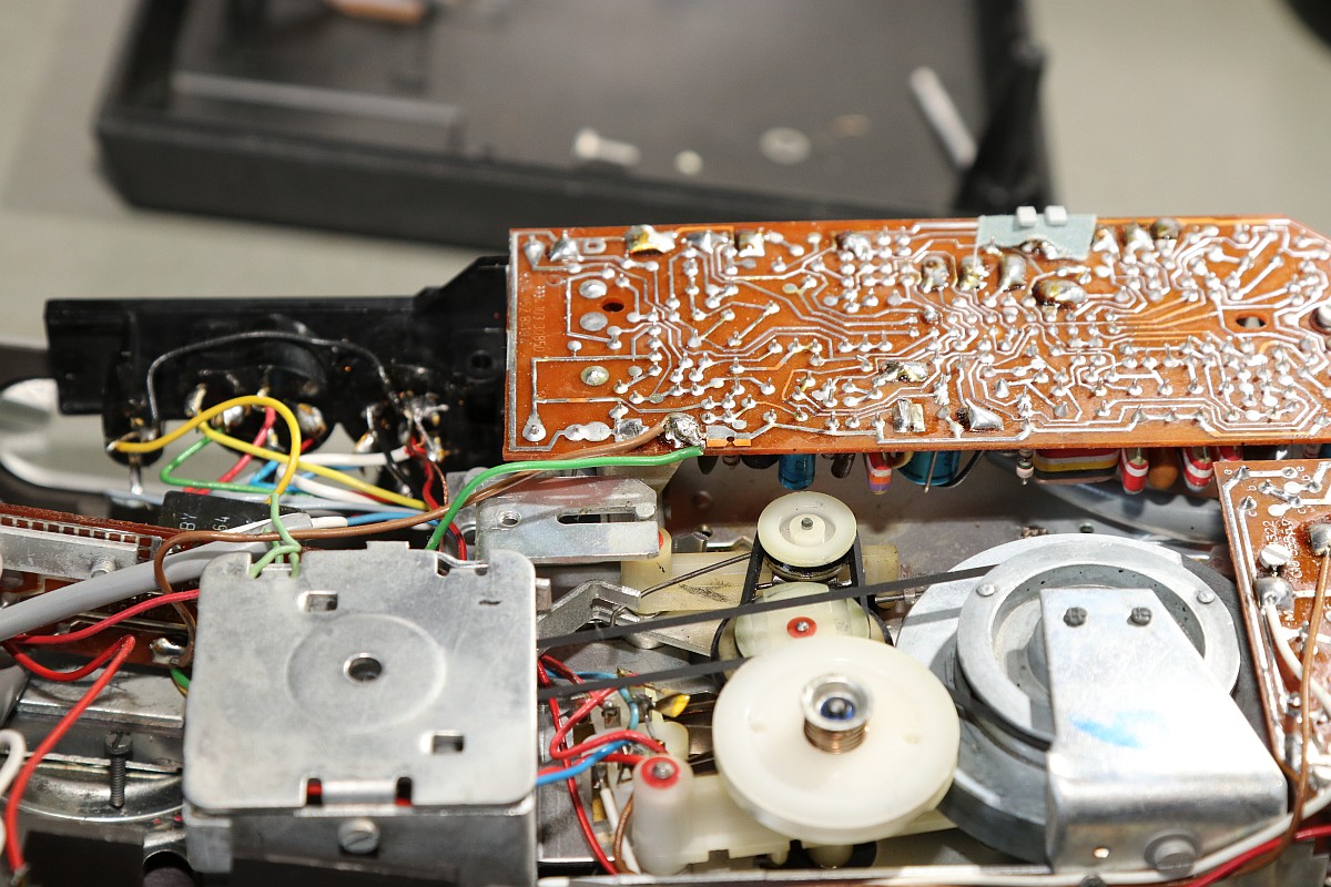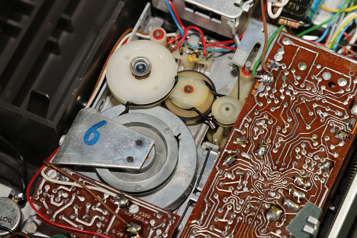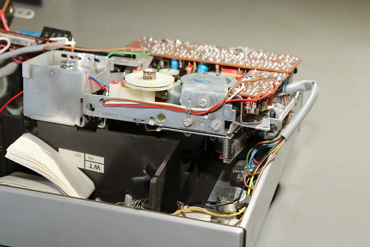 {Philips N2209 Cassette Recorder} Da will man endlich mal seinen KIM-1 mit Software über Cassette füttern und stellt fest, dass das Abspielgerät nicht mehr funktioniert. Die Rollen drehen sich nicht... Es handelt sich um ein schönes, einfaches Monogerät mit gewöhnungsbedürftigem Einhebelsteuerknopf... Die Gehäusehälften sind schnell auseinandergeschraubt - die Ursache der Bewegungslosigkeit ist schnell gefunden: Philips-typisch haben sich mal wieder die Gummiriemen verflüssigt... Da ranzukommen ist eine Kunst für sich... Lecker, sieht aus, wie Lakritze, ist nur deutlich ekliger! Die Überreste haben sich mal wieder überall hin verteilt. Unmengen an Spiritus, Lappen und Ohrstäbchen sind hier von Nöten! Man ist übrigens gut beraten, den Demontageprozess dieser elektromechanischen Presswurst akribisch per Foto festzuhalten, sonst findet man nicht mehr zurück! Die Elektrobucht bietet (perfekt passenden) Ersatz! So sieht es dann aus, wenn es wieder sauber ist. In die ganz feinen Rillen kommt man nicht, ist aber auch nicht so wichtig. Latexhandschuhe helfen übrigens, der Schmodder geht von Metall deutlich besser ab, als von Haut! Die neuen Riemen sind wieder an ihrem Platz! Um an die Oberseite zu gelangen, muss weiter demontiert werden, dazu sollte man auch einzelne Kabelverbindungen ablöten, das macht es deutlich einfacher! Reinigen, schmieren, ölen... das lohnt sich! Nach etwas Gefluche ist das Gerät wieder in der Hülle versenkt... Da steckt doch ein Zettelchen drin... Ahhh... der Schaltplan - immer dabei! Ich hab ihn mal mit sehr großer Auflösung fotografiert... |