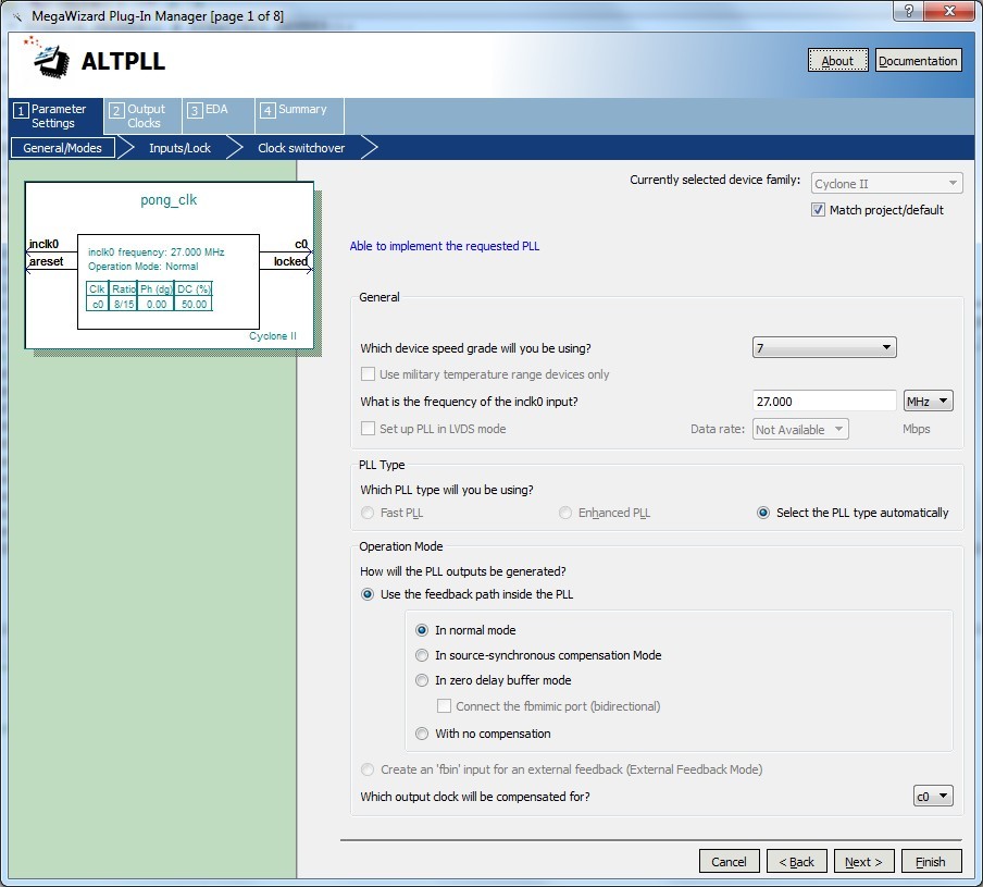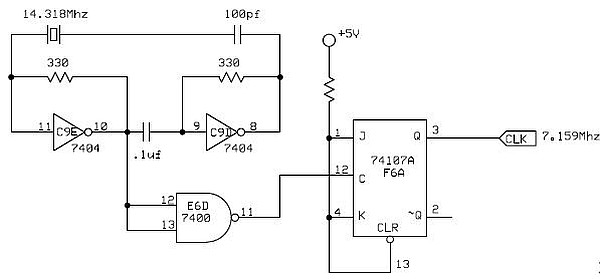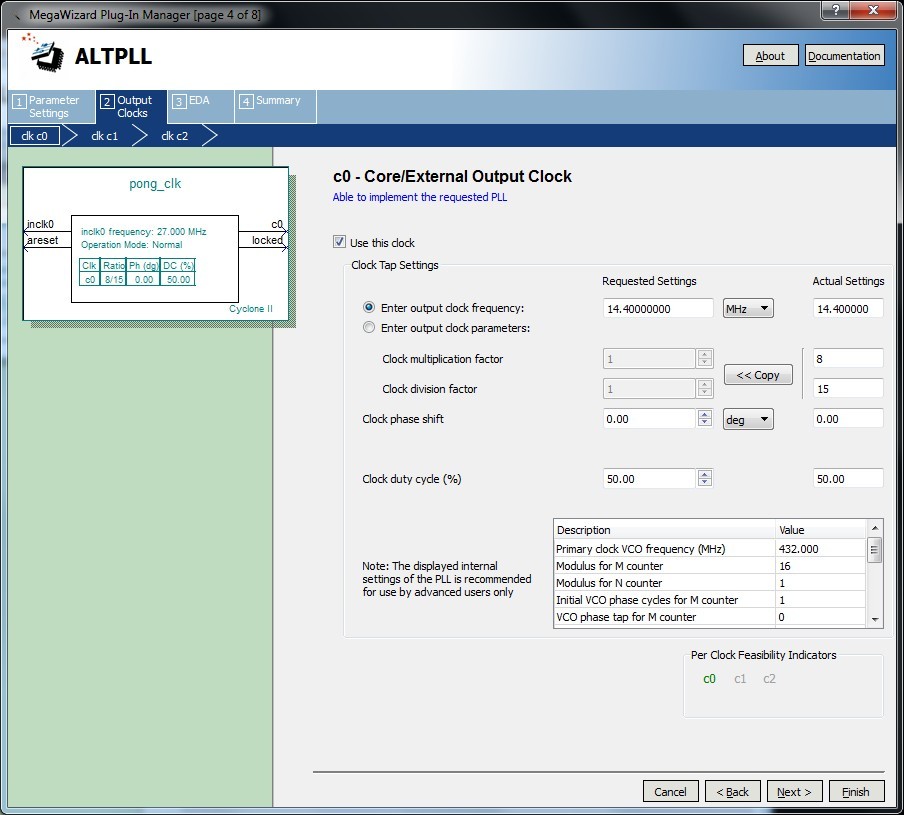 {Pong Taktgenerator} Jedes Arcadeespiel fängt mit einem Systemtakt an. Der Systemtakt des Spiels entspricht in den wenigsten Fällen dem verfügbaren Quarztakt auf einem FPGA-Eval-Board. Daher muss hier erst einmal angepasst werden. Hier mal die professionelle Video-Verkabelung, damit es nachher auch ein gutes Bild gibt: {Schaltplan lesen} das hier ist der Schaltplan des Taktgenerators des PONG-Spiels: Klar, 14,4 MHz haben wir nicht, dafür 27 MHz. Ein PLL wird uns eine Frequenz aus den 27MHz erzeugen, die unseren Wünschen am nächsten kommt. Gut, dass es dafür einen "Wizard" gibt, der das automatisch erzeugt: Probehalber auf einen Ausgang gegeben und oszillografiert kann man das Ergebnis bewundern. Hier das Eingangssignal: Die 144 MHz sehen auf dem Ausgang nicht gut aus, aber die verlassen den FPGA ja auch nicht... DAS ist das gewünschte Ergebnis: saubere 14,4 MHz erzeugt aus 27 MHz: |