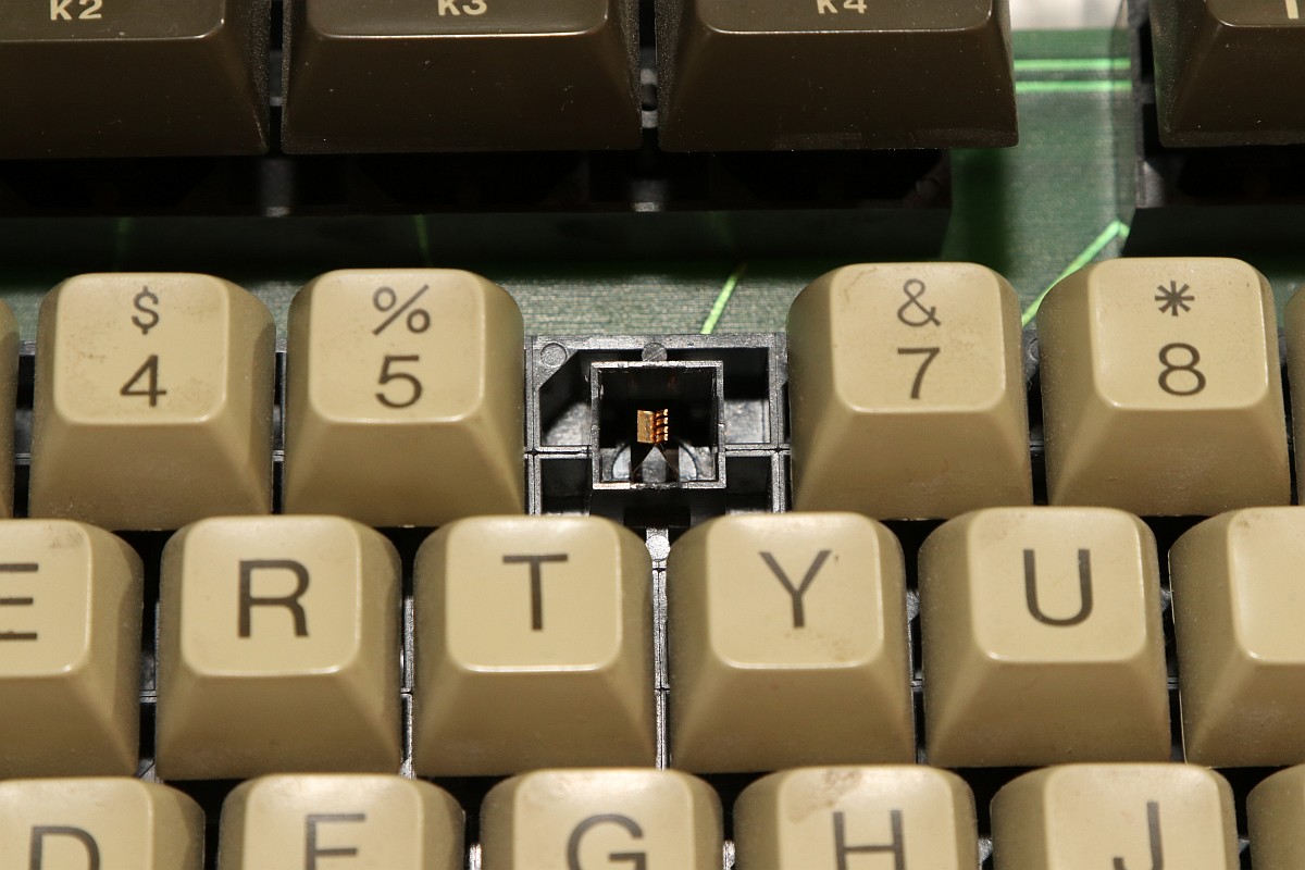 Die Kunststoffstempel, die die Tastenkappen aufnehmen, sind spröde und reißen an den Ecken leicht ein. Dann spreizen sich die Seitenteile und verklemmen.