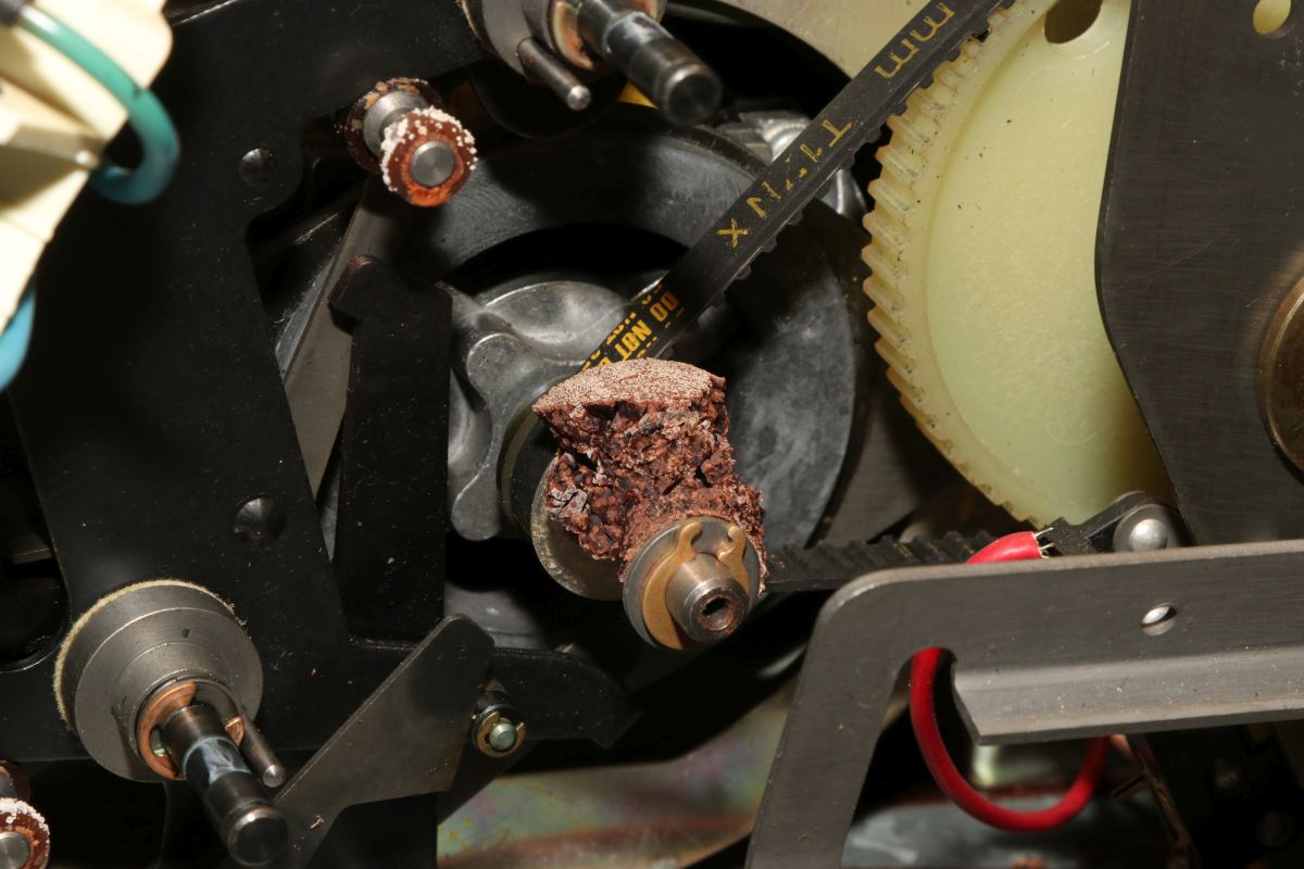 {Diehl Algotronic Reparatur} Die 24er Hahnscheiben sind gekommen, aber sie sind einen Millimeter zu klein! Gut, dass ich noch 25er in der Kiste hatte. Aber erst einmal muss der alte Schmodder runter. Die alte Rolle krümelt und klebt... Auch hier sieht das Material aus wie Kork. Vermutlich irgendetwas Organisches im Bindemittel, was sich nach 55 Jahren aufgelöst hat. Die Mitnehmerrollen blühen irgendwie und haben ihre Konsistenz von elastisch nach klebrig verändert. Hier habe ich passenden Silikonschlauchersatz! Hier sind die Silikonröllchen bereits montiert. Auf jeder Achse sind zwei Stück! Die Hahnscheiben hätten sich diesen Einsatzfall nie träumen lassen: Die Mechanik ist gut geschmiert, der Lochstreifen ist wieder montiert. Jetzt kommt der spannende Moment! Übrigens liest die Algotronic sowohl beim Ab- als auch beim Aufspulen, deswegen erlischt die Lampe auch erst ganz am Ende! Um die lange Geschichte abzukürzen: das Lesen hat problemlos funktioniert, aber der Drucker hat nach der zweiten Umdrehung blockiert. Mit viel Gefühl und noch mehr Teslanol und Öl funktionierten nach und nach immer mehr Typenrollen, bis endlich der Drucker über die komplette Breite druckte. Die Algotronic lebt wieder! Mein Lieblingsversuch: Wurzelziehen. Die Seriennummer ist vor der Papierrolle... Die Gummiwalze sieht schlimmer aus, als sie ist. Ein wenig Waschbenzin macht die Oberfläche wieder griffig. Der Abreißer ist zersplittert - der erste Versuch mit Aceton schlägt fehl. Dieser Kunststoff ist nicht Aceton-löslich!. Sekundenkleber macht den Job. Ein wenig poliert und zusammengebaut: Die Komma-Transmission erledigt hier ein Silikon-O-Ring. Ich hatte gerade die passende Größe da... Hier noch ein paar Algotronic-Impressionen: Nächster Schritt: ein neues Farbband und Programmieren lernen... |