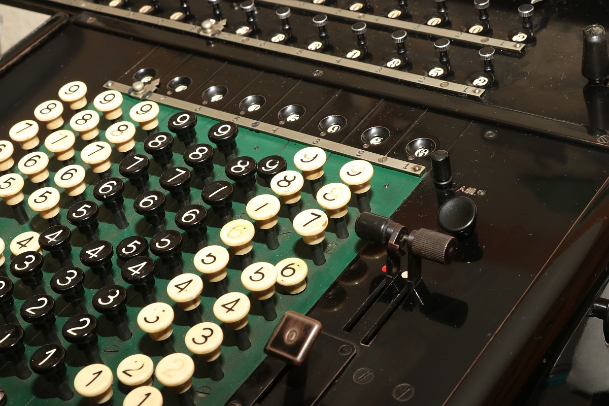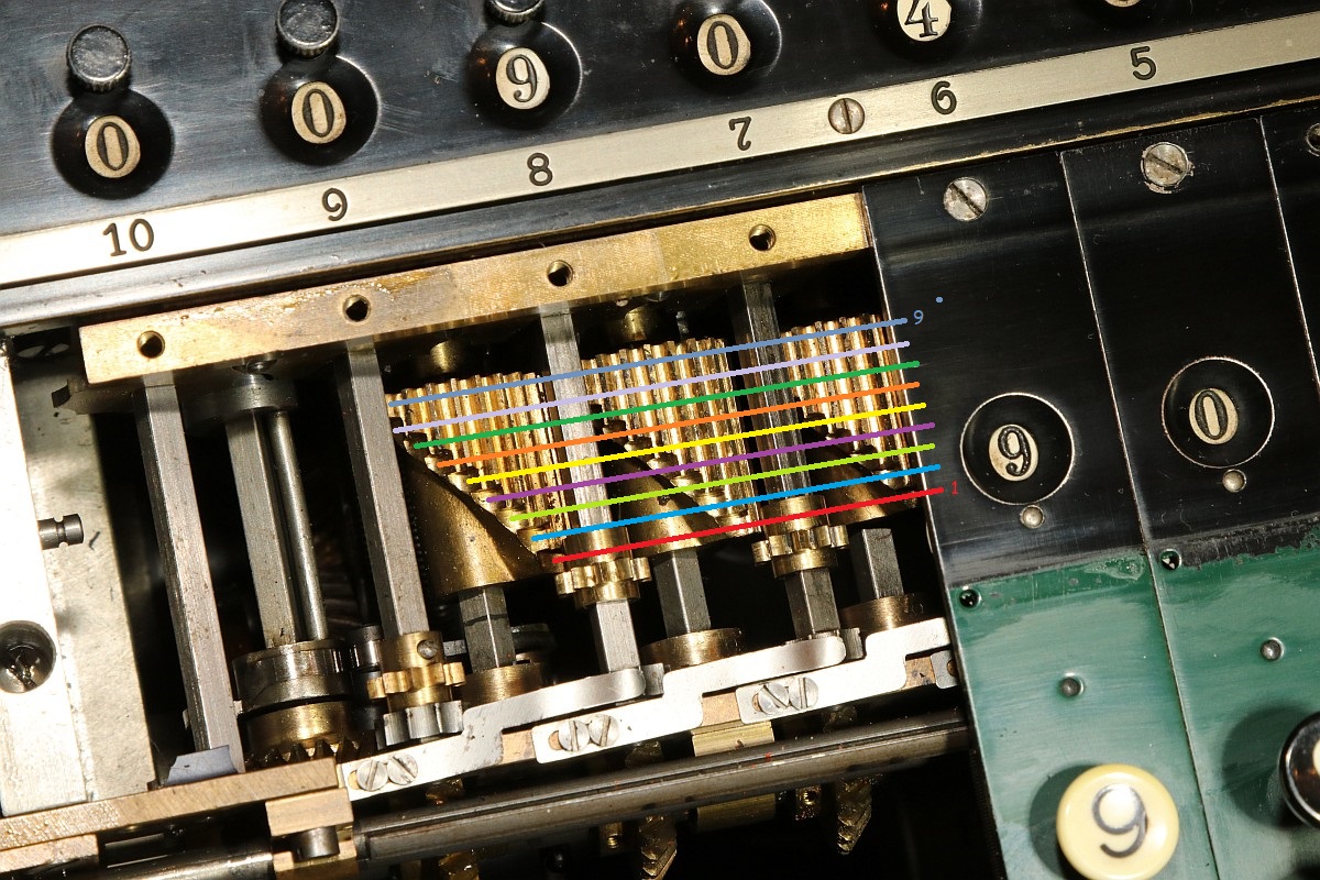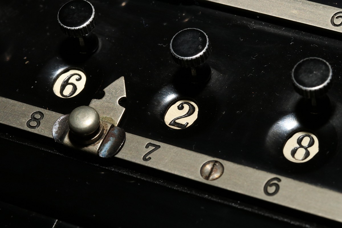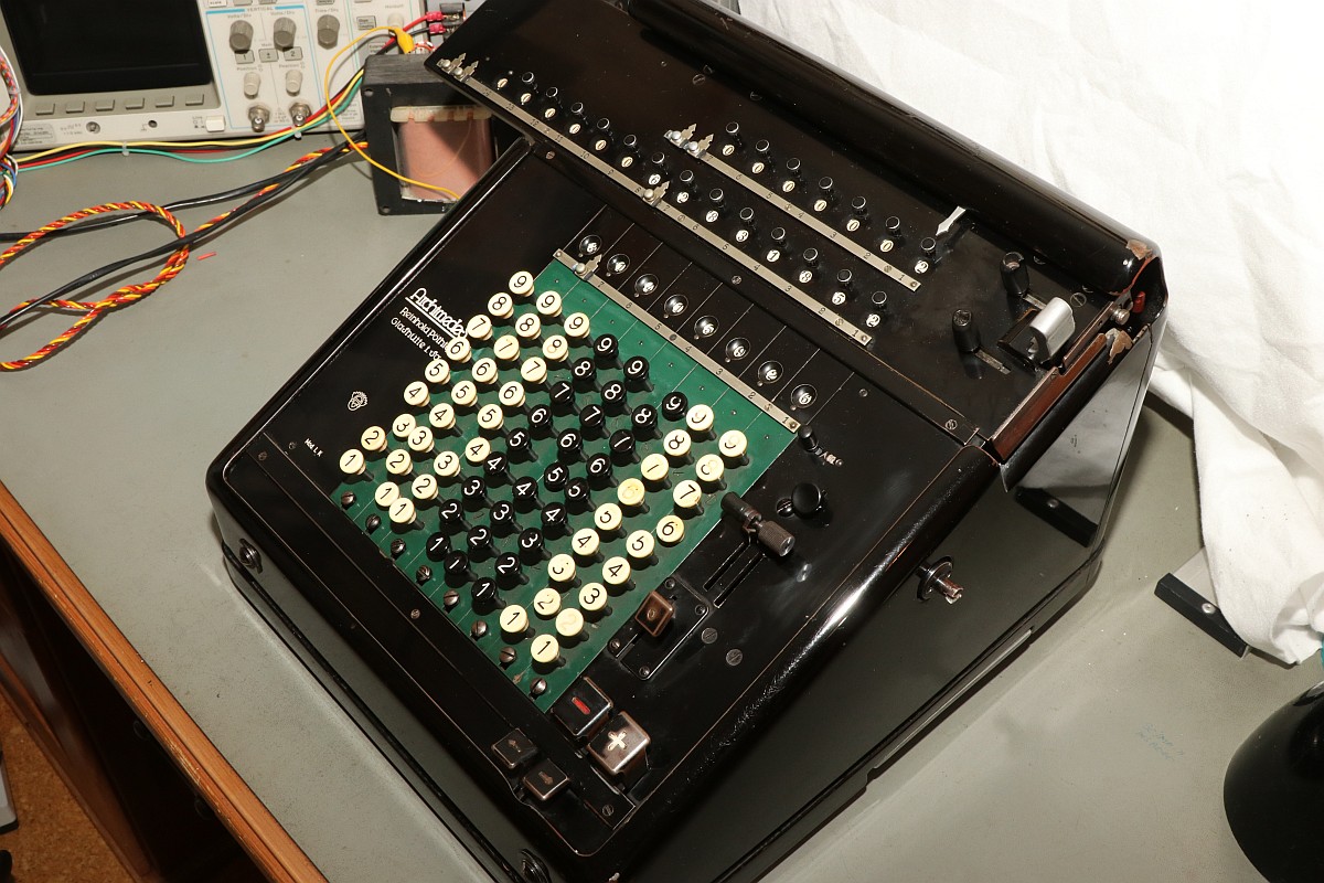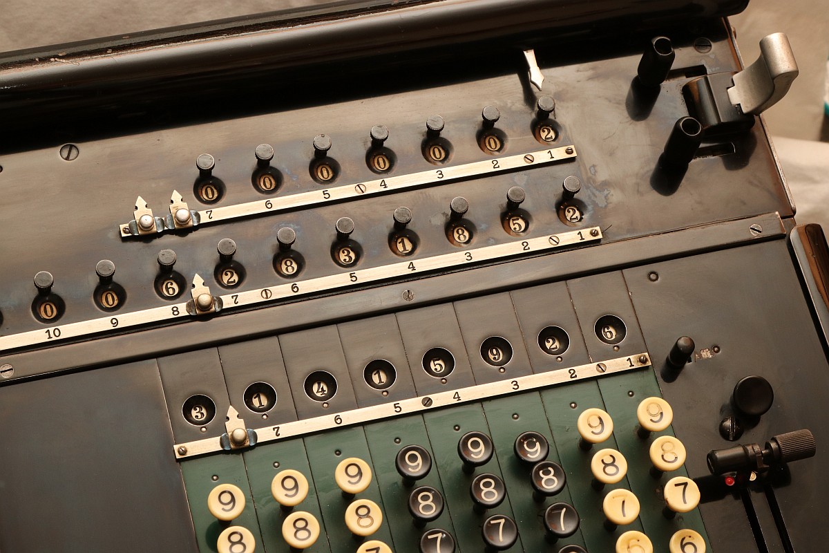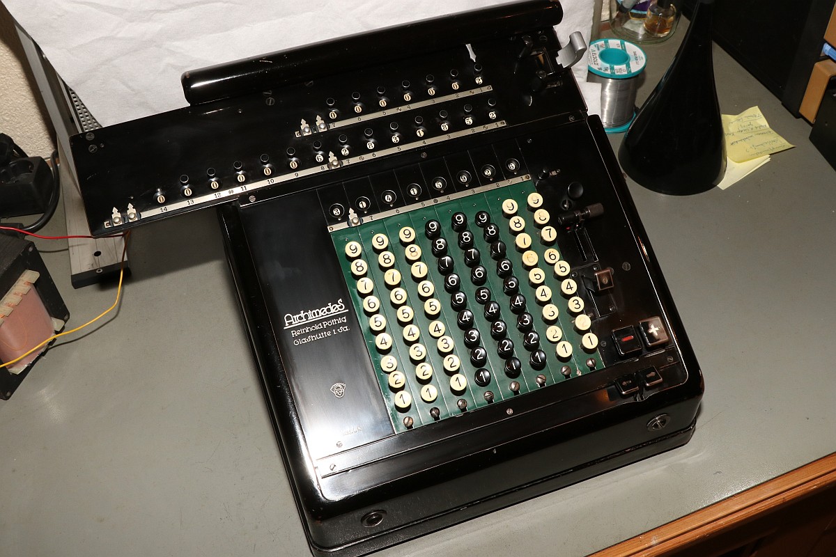 {ARCHIMEDES L.K. Vierspezies Staffelwalzen-Rechenmaschine mit automatischer Division} In meiner kleinen Sammlung mechanischer Rechenmaschinen fehlte mir nur noch ein Exemplar einer Staffelwalzenmaschine - nach Zahnstange und Sprossenrad hätte ich dann alle wesentlichen Eingabeprinzipien beieinander. Zufällig stolperte ich über ein Angebot, zu dem ich nicht nein sagen konnte: eine Archimedes L.K. Rechenmaschine aus Glashütte - Baujahr ca. 1935!