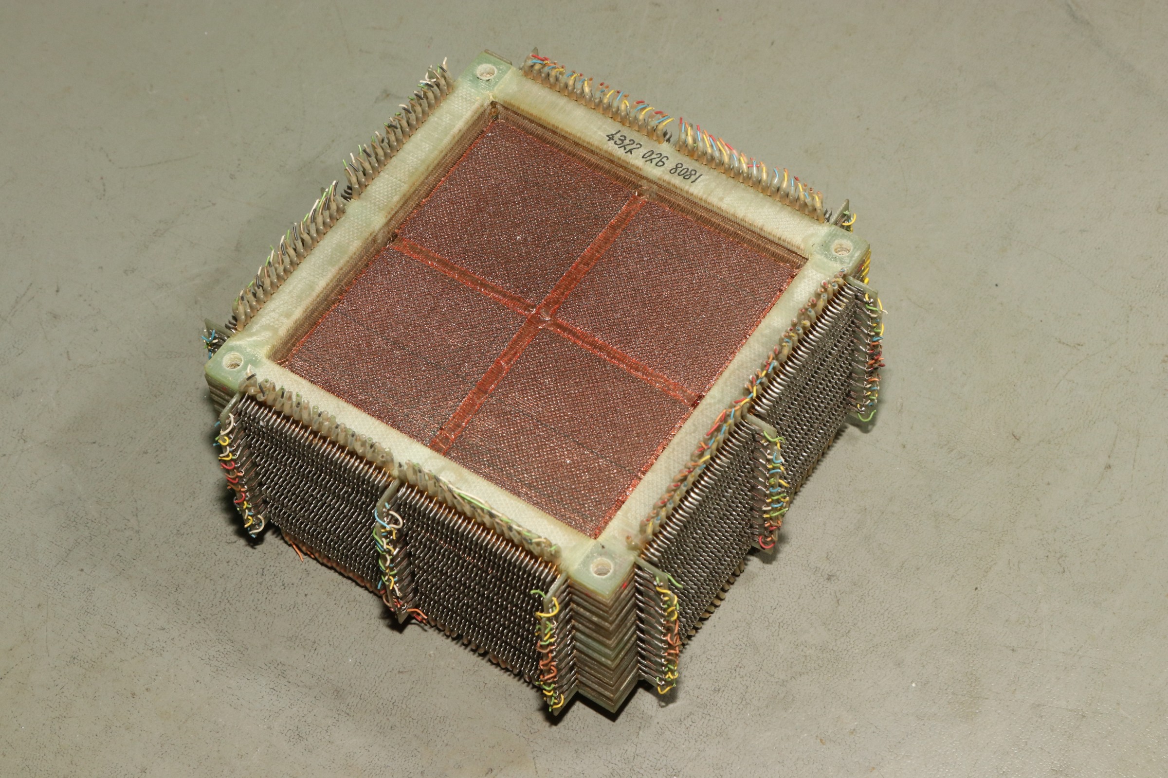 Update 2022: Günter S. hat mir freundlicher Weise Infos zum hier gezeigten Stück übermittelt: "Diese Einheit, bestehend aus 13 Einzel-Matrizen mit je 16kBit, war mit einem weiteren Block zu einer Kernspeicher-Einheit 16k x 26 Bit mit der entsprechenden Ansteuerelektronik zusammengefasst und kam bei den Telefunken-Rechnern TR440 und TR86 zum Einsatz. Die Wortlänge betrug 24 Bit, die 2 restlichen Bits dienten zur Fehlererkennung und -Korrektur im Kernspeicher-Magazin. Hersteller bzw. Lieferant der Einzel-Matrizen war Valvo, ob diese Teile auch bei anderen Rechner-Herstellern verwendet wurden, entzieht sich meiner Kenntnis."