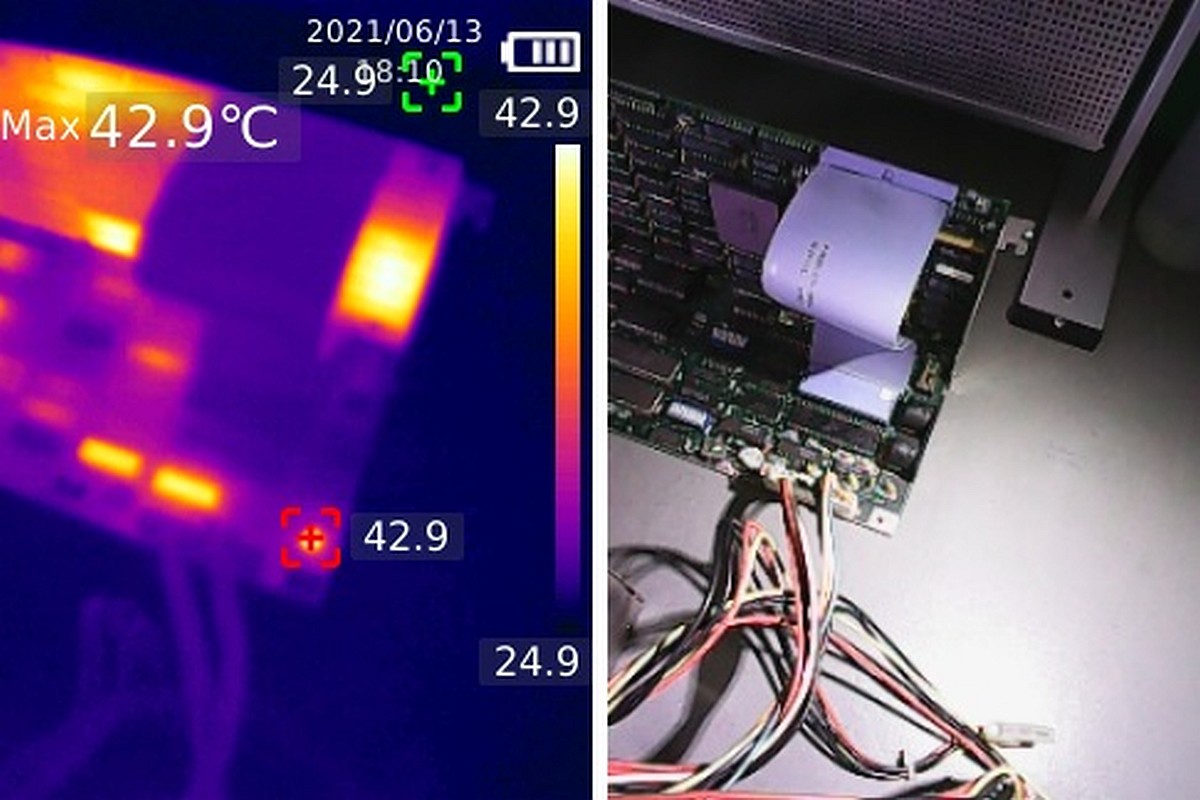 {Ein IBM 5150 PC} Nun hab ich zufällig auch einen bekommen: einen IBM 5150 - Version 256k. Bei einer TTL-Abholaktion in der Nachbarschaft stolperte ich über dieses Gerät, dessen Besitzer sich freute, es am nächsten Tag nicht zum Elektroschrott bringen zu müssen... Beifang: Intel InBoard 386/PC, Eigenentwickeltes FDD/HDD Board, Hercules und Speichererweiterung. Das Netzteil ginge in Sicherheitsabschaltung wegen des defekten MoBos... Die Tastatur ist eine Ikone der PC-Technik. Dank Vollmetallgehäuse hat sie die Anmutung eines Baseballschlägers und kann problemlos zur Selbstverteidigung eingesetzt werden. Nebenbei funktioniert sie auch nach 35 Jahren völlig problemlos mit sattem Tastenanschlag. Wenn man doch heute noch solche Tastaturen bekäme... Der Vorbesitzer warnte mich vor einem Kurzschluss auf dem MoBo - das ist bei diesen Boards nichts Neues: die Tantalkondensatoren werden kurzschlüssig. Dann geht das Schaltnetzteil in die Sicherheitsabschaltung. Ich hab mal ein minimales Setup aufgebaut, um den Dingen auf den Grund zu gehen... Meine neue Thermokamera (Ja, Männer brauchen regelmäßig neue Spielzeuge...) verrät mir einen Tantal, der beim Einschalten warm wird - das darf so nicht sein. Tja, und wenige Sekunden später verabschiedete sich dieser auch schon mit dem üblichen Funkenregen... aber ich hätte ihn auch so gefunden! Übrigens: mit dem Durchgangspieper war der Fehler nicht zu finden, der Kurzschluss trat erst bei Spannung auf! Gottseidank kann man diese Knallbonbons erst einmal einfach rausbrechen... Nach dieser erfolgreichen Aktion war erst mal nichts zu hören und der Monitor machte auch keinen Mucks... Also wechselte ich die Intel InBoard Karte gegen einen originalen 8088, stellte die Jumper korrekt ein und suchte einen Industriemonitor, der für MDA eher schlecht als recht geeignet ist... Aber hey, immerhin haben wir ein Bild... Ich wusste gar nicht, dass die alten IBM PCs eingebautes Basic hatten... wieder was gelernt. Und MoBo, Prozessor und Grafikkarte funktionieren einwandfrei. Die eingelöteten 64kByte sind mir zu wenig - ich krame in meinem Fundus und rüste auf 256k auf! Speicherplatz brutal! Ich wollte ja nur mal wissen, ob der RAM Test auch wirklich testet... ;-) Nachgerüstet... Geht doch! Im nächsten Teil geht es mit dem monochromen Monitor 5151 weiter! |