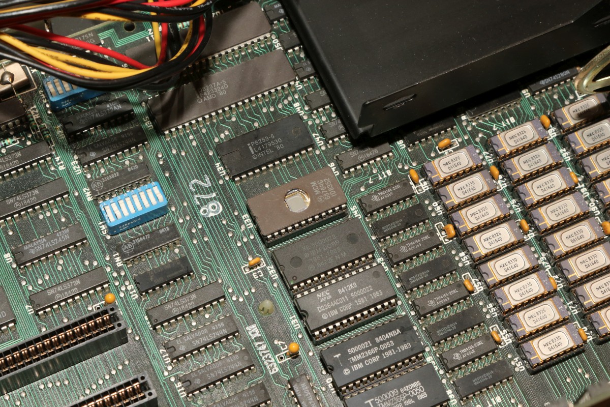 MCM68764 (MCM68766 gehen auch, die unterscheiden sich nur durch einen low power sleep mode) sind 64kbit EPROMs im kleinstmöglichen Gehäuse, quasi 2764 im Gehäuse eines 2716. Dafür sind sie MASK-ROM-kompatibel und damit die einzigen Bausteine, die ein IBM BIOS ohne Adapter-Gedöhns ersetzen können. IBM beschreibt im Handbuch 250ns Zugriffszeit für seine BIOS-Chips, 450ns beim 68764 gehen auch, ich hab's getestet!