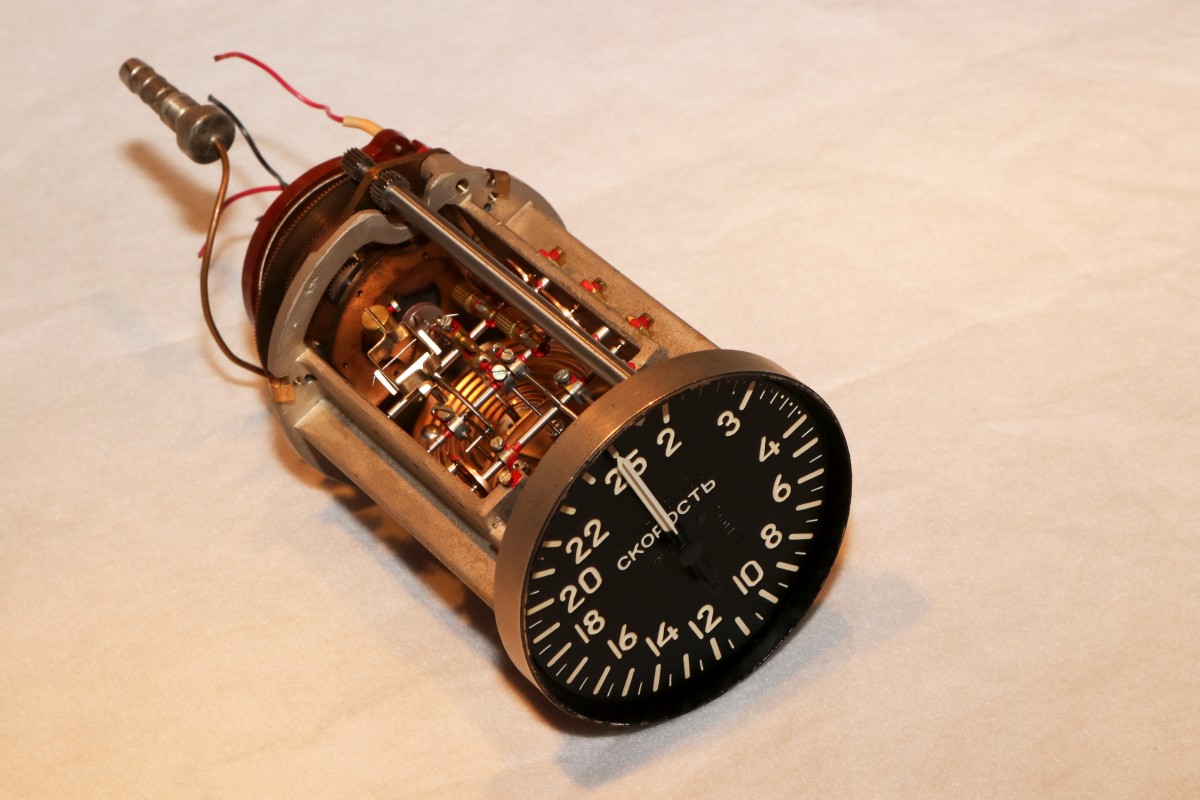 {MIG-21 Air Speed Indicator} Ein Zulauf, der mich schon vor langer Zeit von einem freundlichen Spender aus Österreich erreicht hat: der Geschwindigkeitsmesser einer MIG-21. Dieses Teil nennt sich eigentlich ASI (Air Speed Indicator) und funktioniert rein mechanisch. Innendruck und über ein Staurohr gemessener Staudruck werden mechanisch über barometrische Dosen in einen Zeigerausschlag umgesetzt, der die Flugzeuggeschwindigkeit repräsentiert. Bernoulli und so. Ihr wisst ja. Und nein, den Rest der MIG-21 hab ich nicht im Garten stehen.