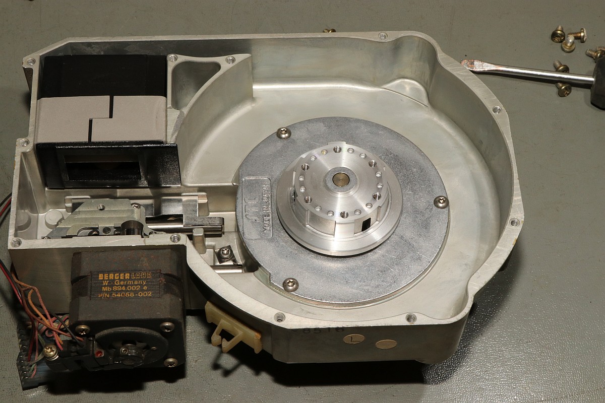 {Seagate ST-412 MFM HDD 10 MB} Wir schreiben das Jahr 1985. Massenspeicher heißen noch so, weil sie ganz schön was an Masse mitbringen, um wenige Bytes zu speichern. Niemand wird je mehr als 10 MByte Daten benötigen... Dieses Seagate-Produkt zeigt deutlich, worin es verbaut war: ein IBM-XT... Die Kopfpositionierung erfolgt noch über einen seitlich angeflanschten Schrittmotor. Langsam aber kräftig. Die gute alte ST506/ST412-MFM-Schnittstelle mit getrennten Steuer- und Datenkabeln. Die Leiterkarte für die Logik - wird auf Klick sehr groß! Das Teil ist gut verstaubt... nichts für Allergiker! ...auf der Platine... ...und vor Allem am Spindelmotor - der übrigens erst angelaufen ist, nachdem er einen beherzten Schubs erhalten hat. Danach folgte eine Zeit mit grässlichen Geräuschen aus der Lagergegend, jetzt ist das Teil mittlerweile wieder recht ruhig und läuft einwandfrei - ich schätze, das restliche Lagerfett hat sich wieder gut verteilt. Der Motorteiber: Der Rahmen mit LED... Und der gesamte Dreckspatz in der Ansicht: Hey, es geht auch sauber... Wer die Platine starten sehen (und hören) will, kann das hier tun: {Jetzt will ich's wissen!} Die Frage aller Fragen: kann man die Lager bei dieser Festplatte schmieren, um die grässlichen Geräusche loszuwerden? Ich ziehe das jetzt durch, auch auf die Gefahr hin, die Platte (deren Zustand ich eh nicht kenne) zu beschädigen. Aber einer muss das ja mal auf sich nehmen. Voraussetzung: staubarme Umgebung und sauberes Werkzeug... Der Kopfträger muss raus, sonst kann man die Platten nicht demontieren - dazu müssen alle Leiterkarten ab und das Flachbandkabel muss gelöst werden. Das Flachbandkabel ist links und rechts geklebt, lässt sich aber mit sanfter Gewalt ablösen. Jetzt sind die Schrauben des Kopfträgers zugänglich - interessant: die obere schraube hält den Kopfträger auf dem Schlitten, die untere Schraube hält nur die Köpfe zusammen... hier ist eine genaue Ausrichtung der Köpfe schwierig, aber egal, formatiert man halt hinterher neu. Der ausgebaute Kopfträger - Vorsicht mit den empfindlichen Köpfen und Federblechen! Beim Abziehen der Köpfe muss mal höllich aufpassen, die Plattenoberfläche nicht zu zerkratzen. Ob mir das gelungen ist, werde ich wohl erst viel später erfahren. Jetzt kann man die sechs Klemmschrauben des Plattenstapels lösen: und nach dem Deckel liegt die erste Platte vor mir - vorsichtig auf ein fusselfreien Stoff gelegt. Der Zwischenring hat Luftlöcher, die mit den Löchern in der Spindelachse fluchten müssen! Diese dienen zur Erzeugung eines stetigen Luftstromes, der Schmutzpartikel in den Filter befördert! Das böse Ende kommt am Schluss... Die Plattenaufnahme ist vermutlich auf die Motorachse gepresst - im Inneren zieht sich das Gehäuse fast bis nach oben - keine Chance, irgendwie an Kugellager zu gelangen... Die Köpfe kann man nur wieder einsetzen, wenn man sie vorher mit einer geeigneten Vorrichtung leicht auseinanderspreizt... dann festschrauben und die Abstandshalter wieder herausziehen... Ende vom Lied: das Laufwerk ist wieder erfolgreich zusammengebaut, der Plattenstapel dreht weiterhin ohne hörbare Probleme, die Spindellager machen ab einer bestimmten Drehzahl immer noch mächtig Geräusche... wenigstens wissen wir jetzt, wie es nicht geht... |