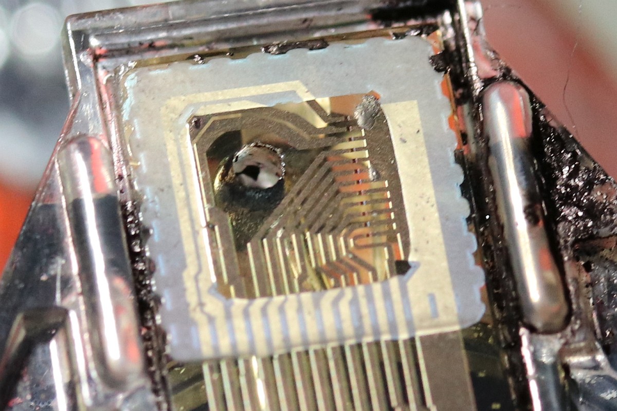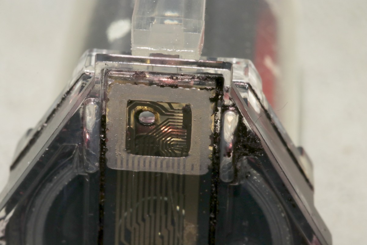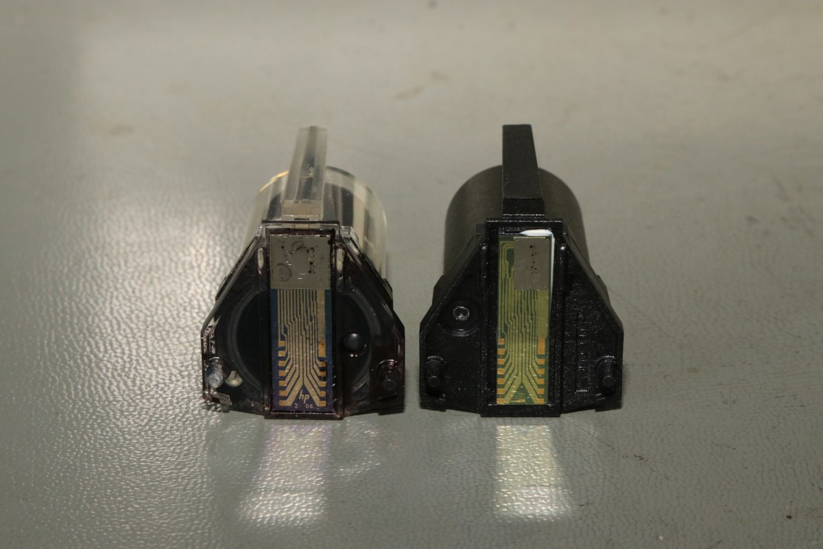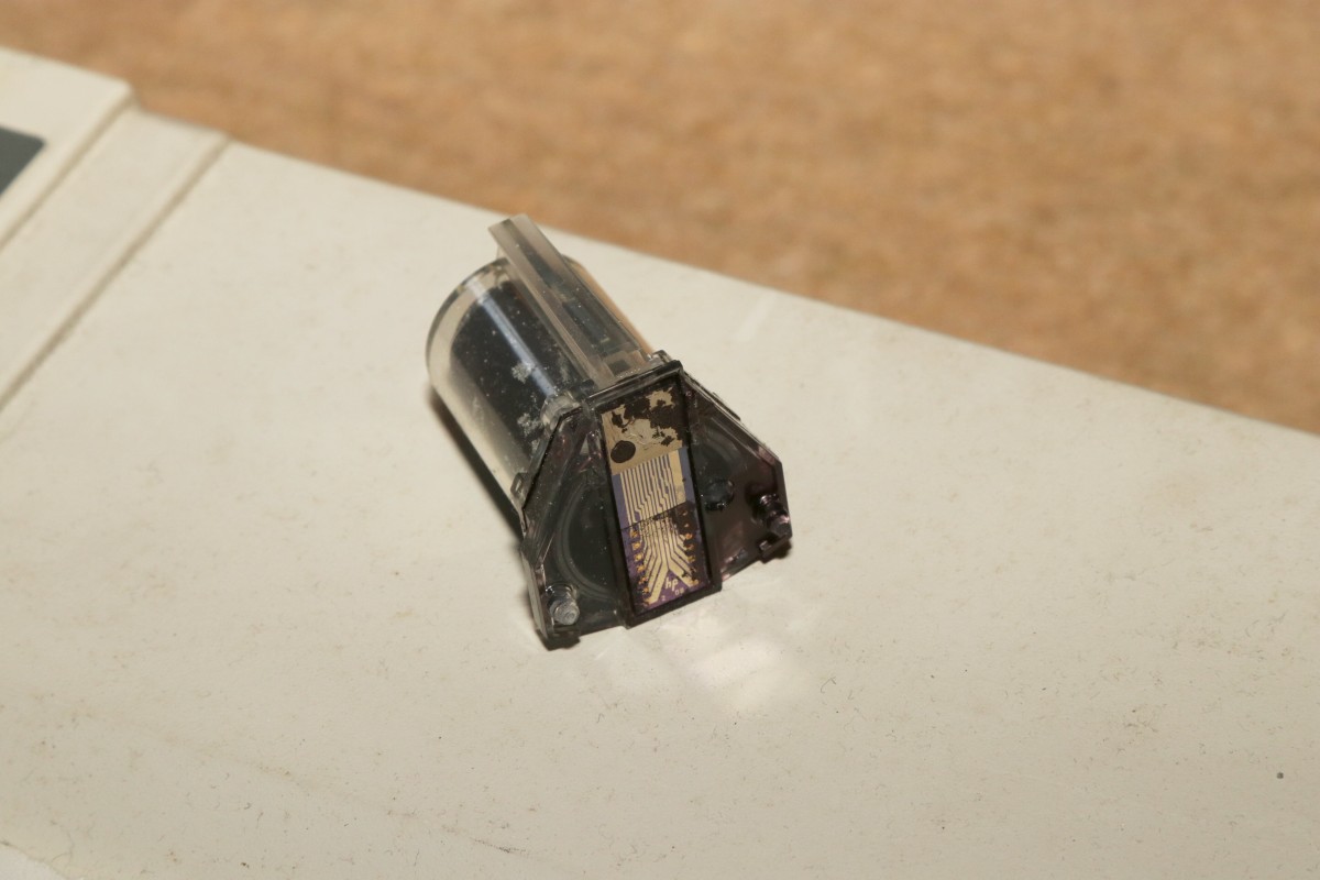 {HP2225AB Thinkjet Tintenstrahldrucker} Ein schöner alter Tintenstrahldrucker ist mir zugelaufen - einer der Ersten! HP2225AB Thinkjet mit HPIB-Anschluss... das wäre doch was für meinen HP-85... Auf der Rückseite gibt es viel zu sehen: Spannungsversorgung, HPIB-Anschluss und HPIB-Adressschalter.. Die Tintenpatrone ist eine ganz alte... im durchsichtigen Gehäuse mit aufwändigem Düsenblech. Natürlich völlig vertrocknet! Und damit beginnt bei diesen Druckern eines der Probleme: die aussickernde Tinte verätzt und korrodiert die vergoldeten Kontakte auf der Flachbandleitung. Wenn es ganz schlimm kommt, dann sind sogar die Kupferleitungen durchkorrodiert... Nach gründlicher Reinigung mit Alkohol und Wattestäbchen sieht die Druckdüse ganz gut aus, man erkennt einiges: Unten die Anschlusskontakte und oben die Tintenkammer mit 12 Düsenlöchern. Die Kontakte auf der flexiblen Leiterplatte sind ganz schön mitgenommen - die Leiterbahnen sehen noch gut aus. Ich bin gespannt... Es gibt noch problemlos neue Tintenpatronen zu kaufen - das hätte ich nicht gedacht. Leider funktioniert beim Testausdruck genau eine Düse... Links die alte, rechts die neue Patrone - bei der Neuen hat man im Design der Düsenplatte ziemlich an Komplexität gespart. Die alte Bauform hat eine ausgeprägte Tintentasche unter den Düsenlöchern. Die neue Bauform ist einfach nur flach. Wenn man bei der alten Bauform die Platte entfernt, dann sieht man genau, wie diese Art des Tintenstrahlers funktioniert: Direkt unter jeder Düse liegt ein Widerstand - dieser wird unter Spannung gesetzt, heizt sich blitzschnell auf, die Tinte kocht an dieser Stelle und schleudert einen Tropfen der darüber liegenden kalten Tinte durch die Düse auf das Papier. Bevor ich weiter über die Wiederherstellung der Kontakte zur Patrone nachdenken konnte, gab das Netzteil ein lautes Zischen von sich und der Drucker bestach nicht nur durch interessante Technik, sondern auch durch penetranten Gestank.... Ich hasse Entstörkondensatoren - vor allem, wenn sie gekapselt eingebaut sind.. Keine Ahnung, was ich jetzt mit dem Ding mache - ich habe weder eine solche Entstörkombination zur Hand, noch ein Ersatz-Flachbandkabel... Dabei funktioniert der Rest noch so gut... Die Elektronik ist überschaubar! Zwei HP-Customs und 1820-3636 ist ein schnöder umgelabelter und programmierter 8048... Vielleicht fällt mir ja mal ein Spenderdrucker in die Finger... |