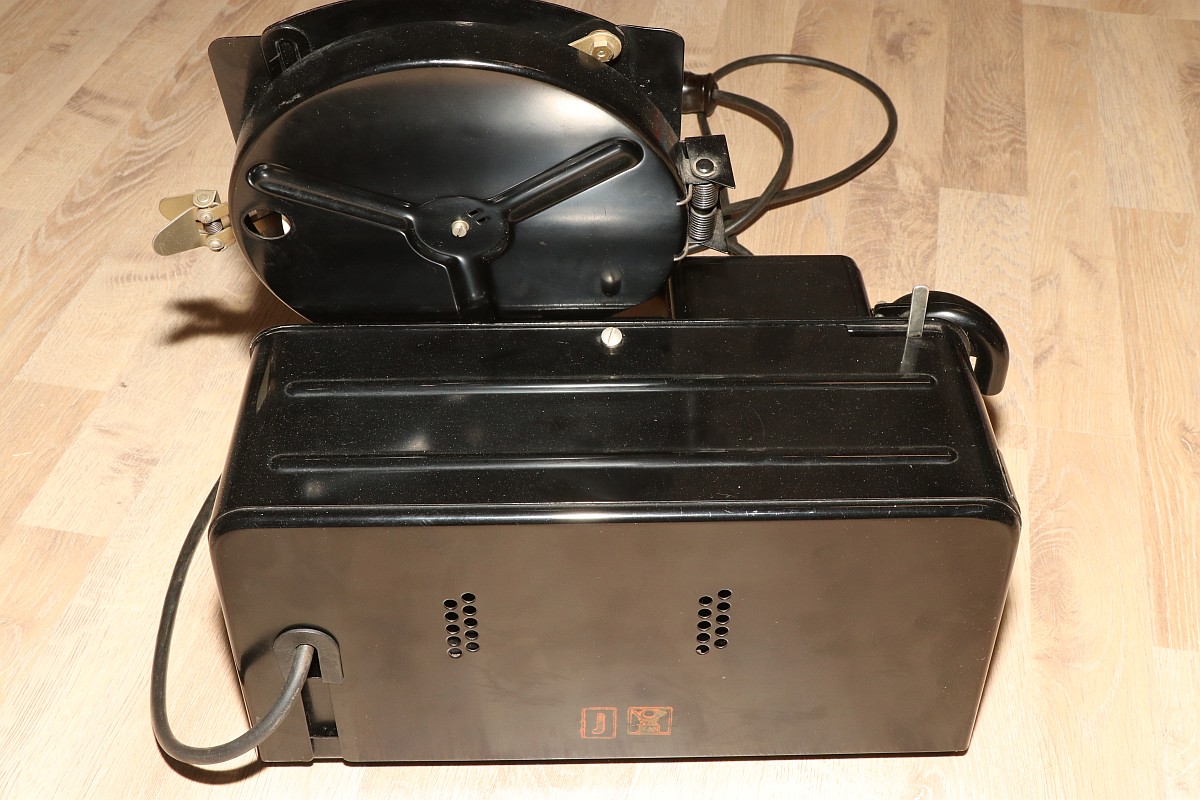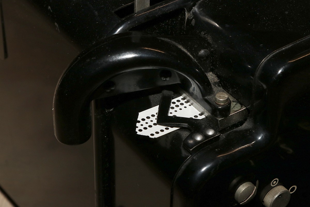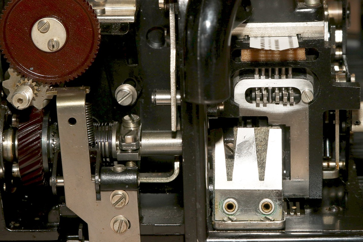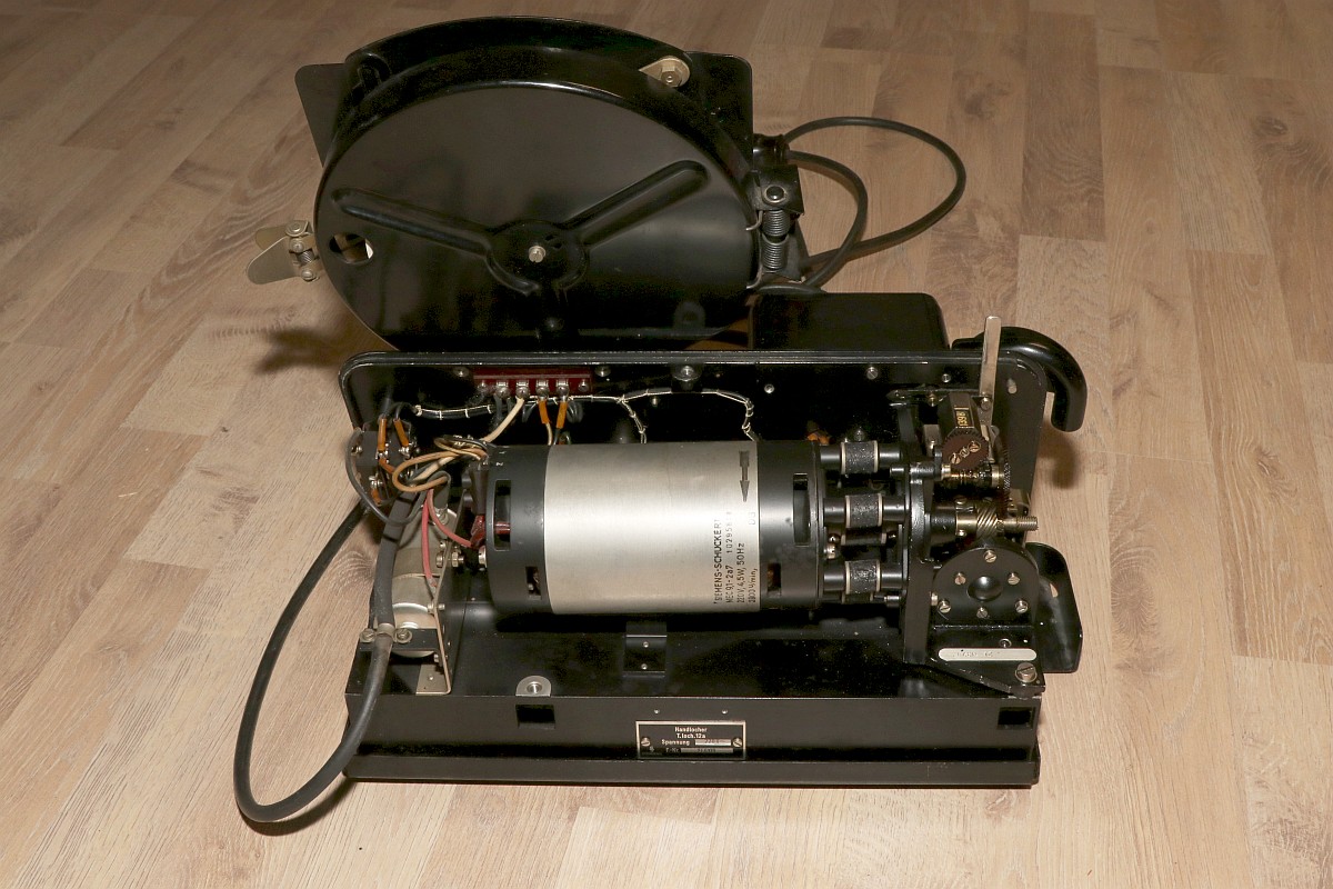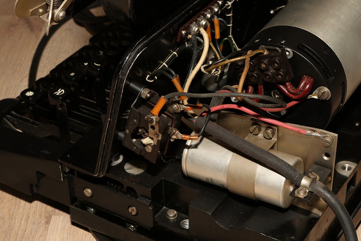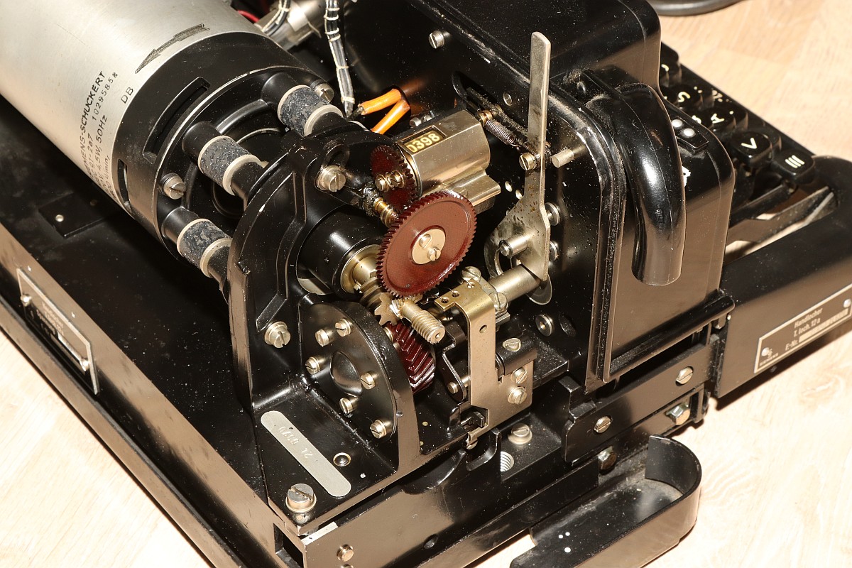 Der Konfettiauspuff hat etwas Futuristisches... Leider fehlt der durchsichtige Auffangbehälter, bei dem Zustand des Gerätes allerdings Jammern auf ganz hohem Niveau! Das Typenschild verrät auch das Herstelldatum: 1955... Das Magazin ist gut gefüllt - es kann gelocht werden. Der Locher ist auch für die Ewigkeit gebaut... Ein Schmankerl: der Zeichenzähler. Nach 60 Anschlägen geht die Glimmlampe an. Dann weiß mann: es ist Zeit für einen Wagenrücklauf!!! Klaviatur und Locher ohne Abdeckung: Die Rückenabdeckung wird praktischer Weise nur von einer Schraube gehalten. Sehr service- und dokumentationsfreundlich! Innen ist immer interessanter als Außen! Die elektrischen Kenndaten: Asynchronmotor mit Anlaufkondensator - Letzterer wird über den Zweifach-Netzschalter kurzzeitig zugeschaltet. Die Antriebsmechanik: 398 Betriebsstunden in 65 Jahren - nicht gerade viel! Aber das Gerät sieht ja auch noch aus wie Neu! Links die Zahnräder für die Mitnehmerwelle - rechts das Stanzwerk mit Ölfilz (unten), Codeschienen (mitte) und Lochstreifen (oben). Die beiden Schrauben auf der Mitnehmerwelle in der Mitte führten zum Ergebnis im letzten Bild. Die Schönheit in nackt: Ich hätte es wissen sollen... ein kleiner Schubs und die Mitnahmewelle drehte sich wieder. Der Finger im Laufweg wurde schlichtweg ignoriert. Ich nenne das Gerät jetzt nur noch A.loch.12a. |