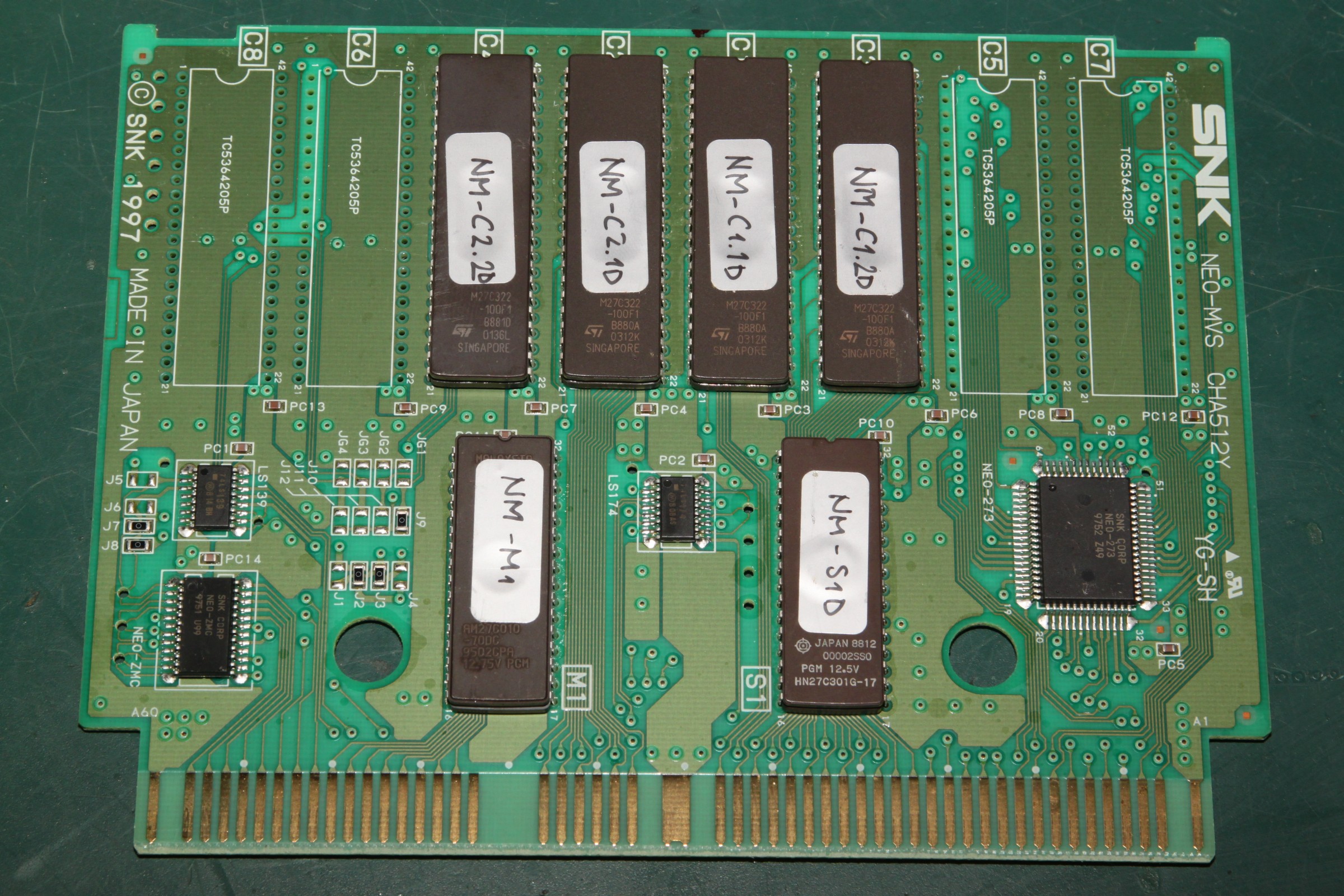 {Nightmare in the Dark Conversion} Blablabla... das Übliche halt... Interessiert langsam eh niemanden mehr... ;-) {Inbetriebnahme} Nach dem üblichen Splitten der Decrypted C-ROMs und der V-ROMs und einer auf Verdacht eingestellten Jumperung: der bange Moment der Wahrheit... Und geht auf Anhieb! Ich freu' mich. {Übrigens...} Ach ja, noch was: M1-ROM ist im ROM-Satz mit 512kByte angegeben, das ist im Original auch ein 512kByte MPROM... Was für eine Verschwendung: mein Analyse-Tool zeigt eine verschwenderische Anzahl von FF's, ein gewöhnliches 27C010 (128kByte) reicht völlig... |