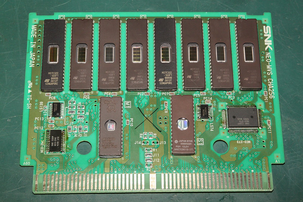 {Ninja Master's Reparatur} Heute: Ninja Master's Neo Geo Cartridge mit Grafikfehlern. Erst mal einstecken und starten... {Diagnose} Yepp, so muss Grafikfehler, aber so richtig sind das keine, Aceton auf die PCB-Kontakte putzt nicht nur die Kontakte, sondern auch das Videobild: {Fehlersuche} Aber ein par ungeputzte Pixelprobleme bleiben halt übrig. Die normale Vorgehensweise: Sichtkontrolle (nichts Auffälliges), dann sukzessives Austauschen der ROMs gegen frisch programmierte EPROMs. Dann: Austausch des SMD NEO-273, dann der SMC, dann der 74LS74... Nee, oder? Immer noch mistig... {Reparatur} Dann liegt der Fehler wohl an dem einzigen verbliebenen 74LS139, den ich nicht auf Lager habe - oder es befindet sich ein Haarriss irgendwo auf der Platine, den ich nicht suchen möchte. Alternative: Schlachtfest einer Spendercartridge und Austausch. Die PROMs sind je eh schon alle ausgelötet... {Fertig} Schon ist alles gut und der Tag schon wieder zwei Stunden kürzer... |